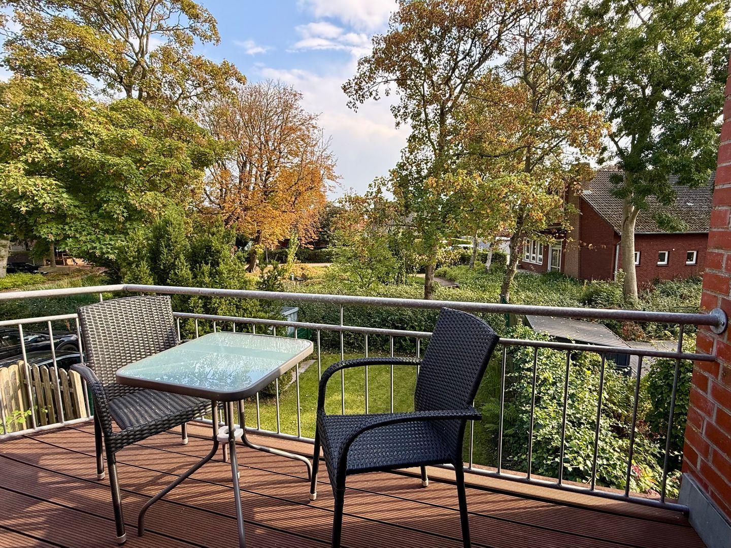 Der möblierte Balkon bietet einen schönen Ausblick auf die Kirche von Greetsiel und ist ein herrlicher Ort, um den Tag ausklingen zu lassen.