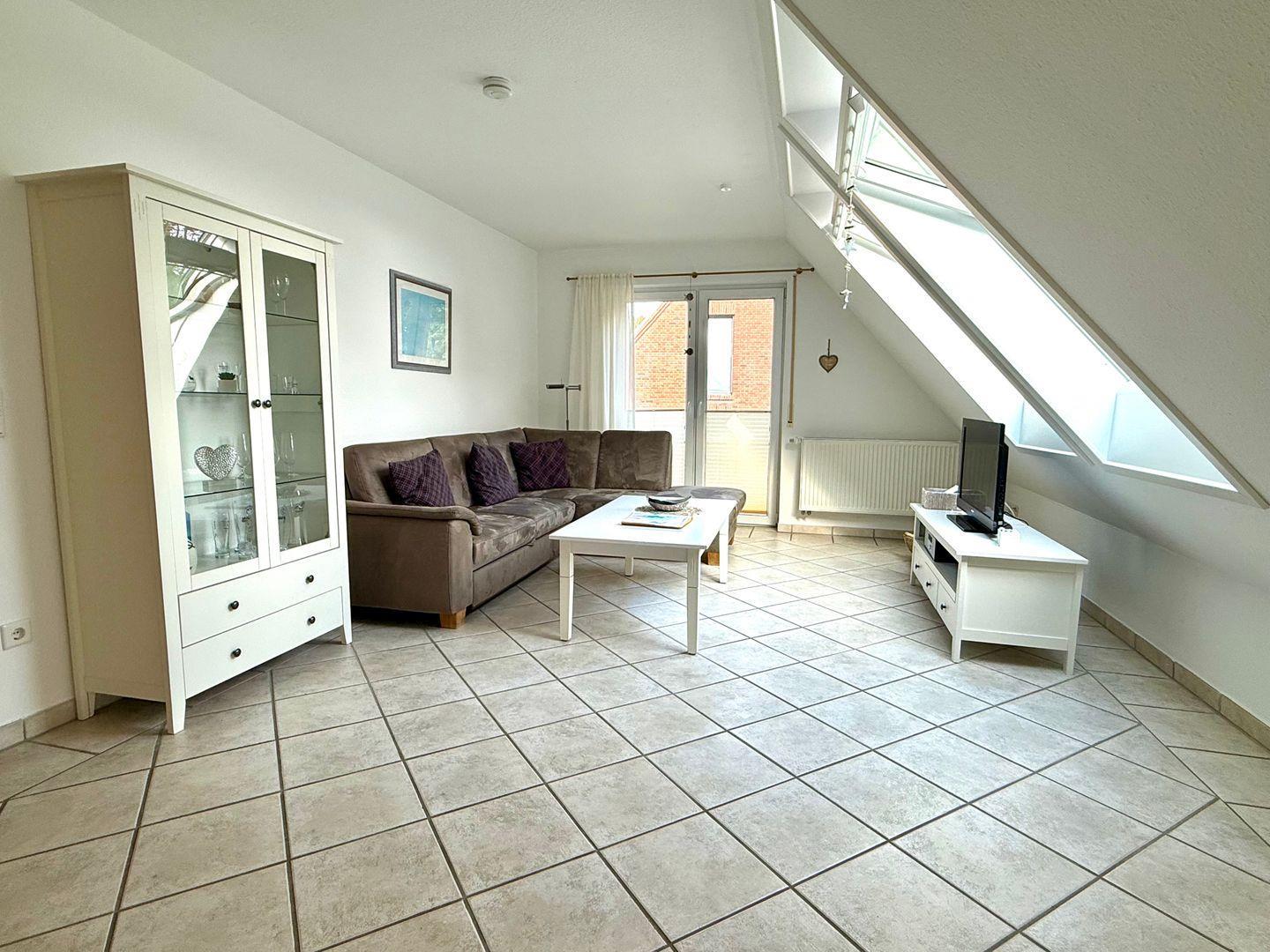 Helle und freundliche Wohnung in Greetsiel mit Balkon und Blick auf die Kirche, ideal für einen entspannten Urlaub zu zweit.
