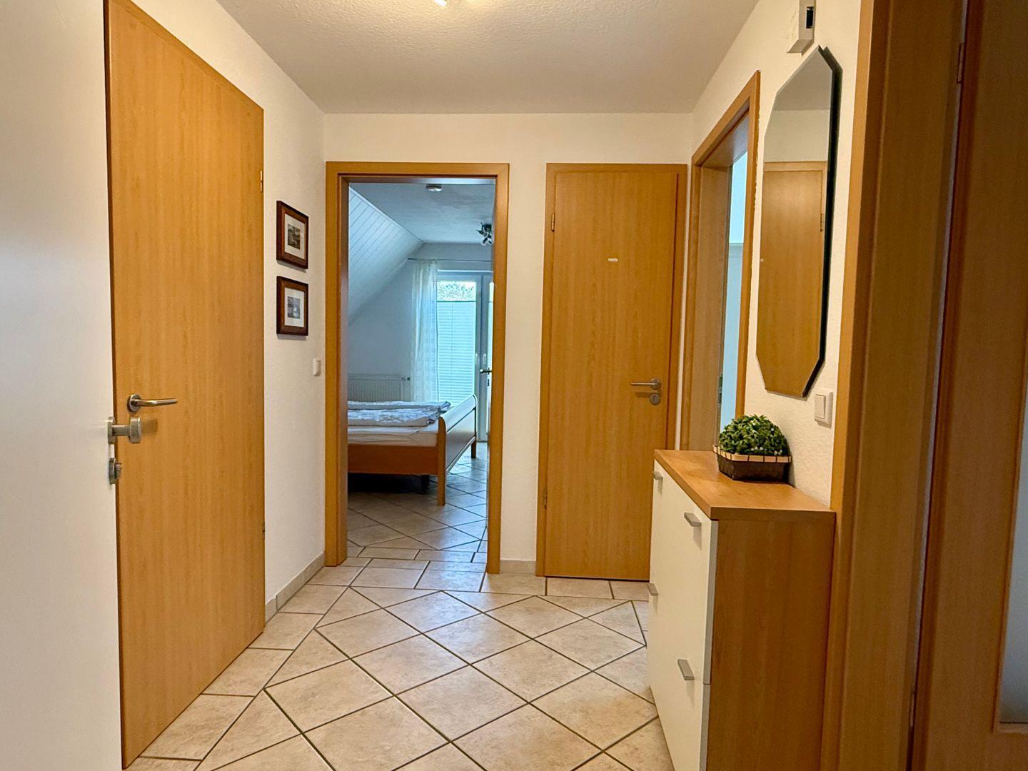Im Eingangsbereich erwarten Sie eine Garderobe und ein kleiner Schrank für Schuhe. Der offene Wohn- und Küchenbereich ist lichtdurchflutet und lädt mit einer gemütlichen Sofaecke und großem Fernseher zu entspannten Stunden ein.