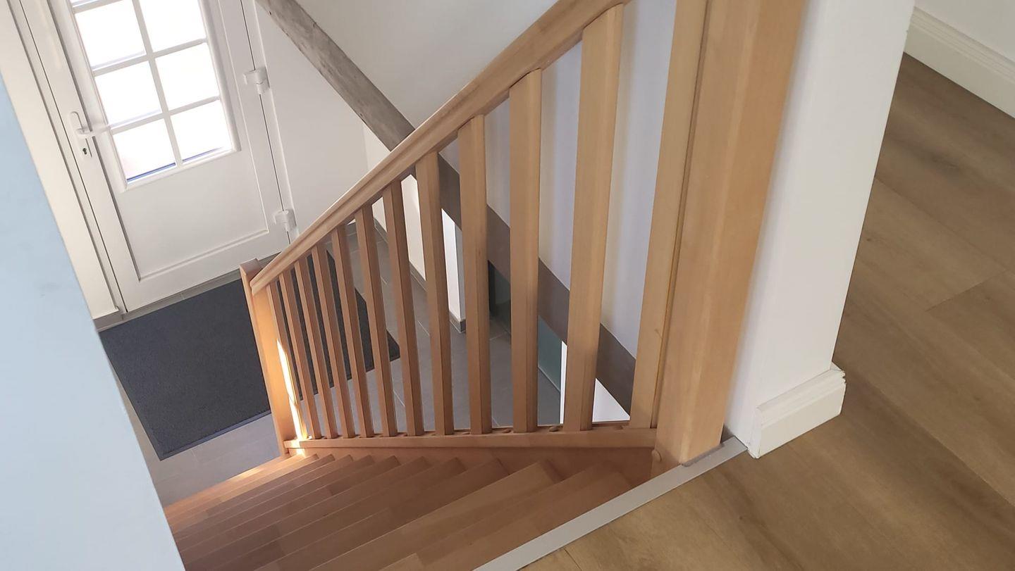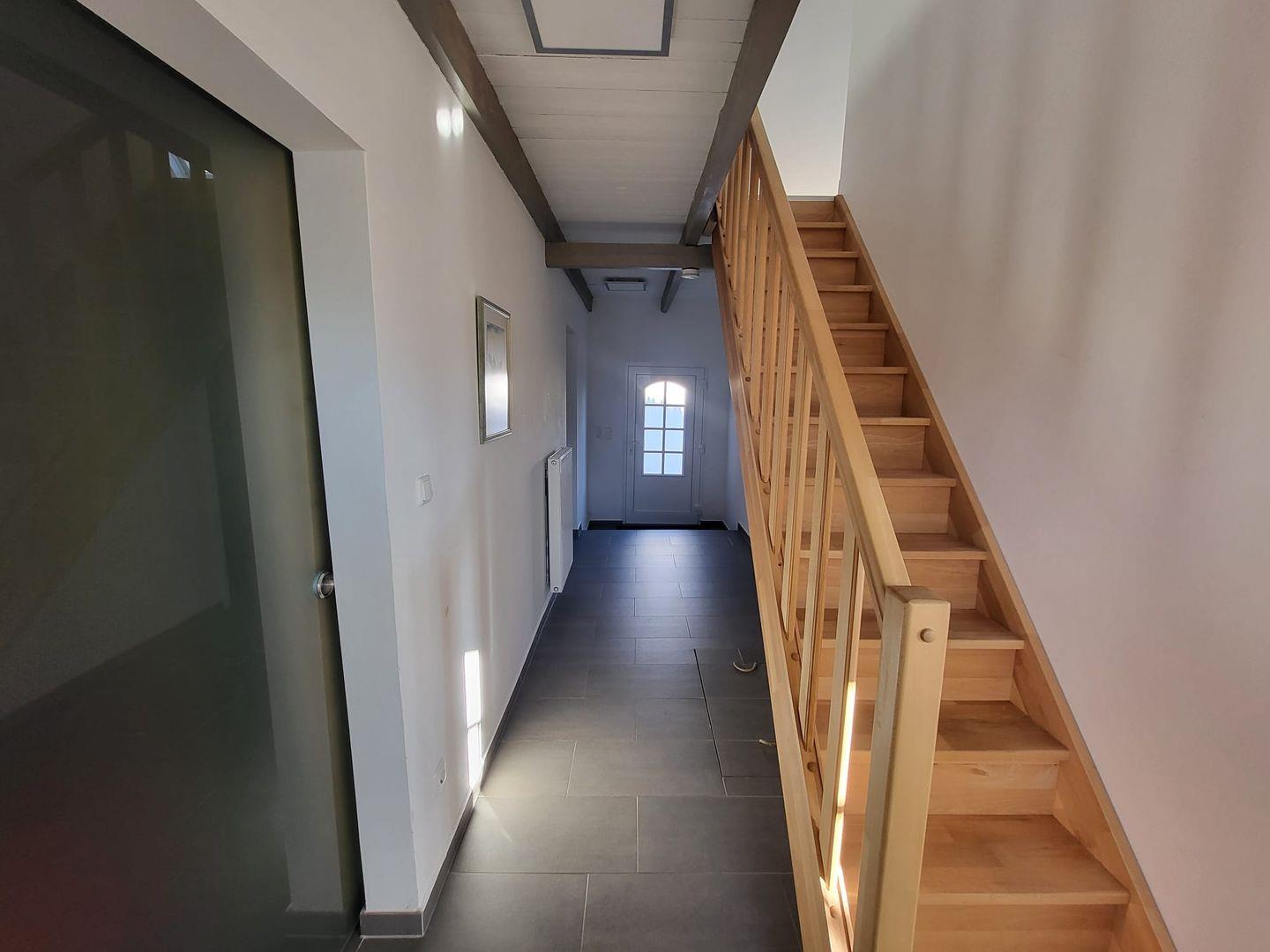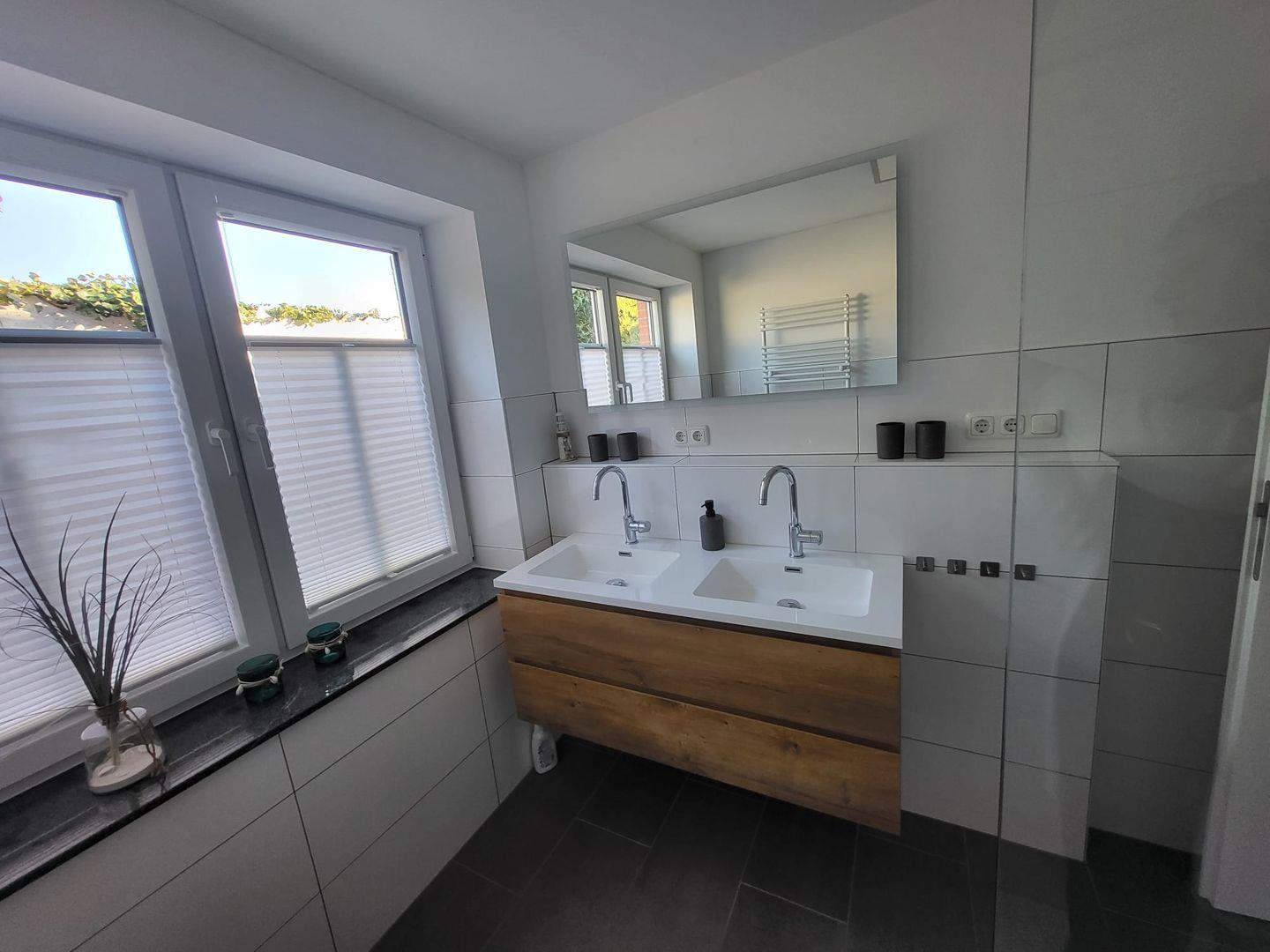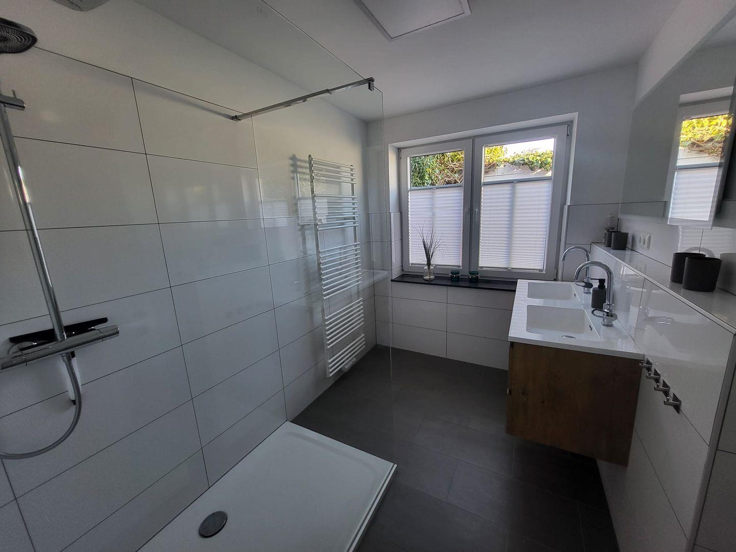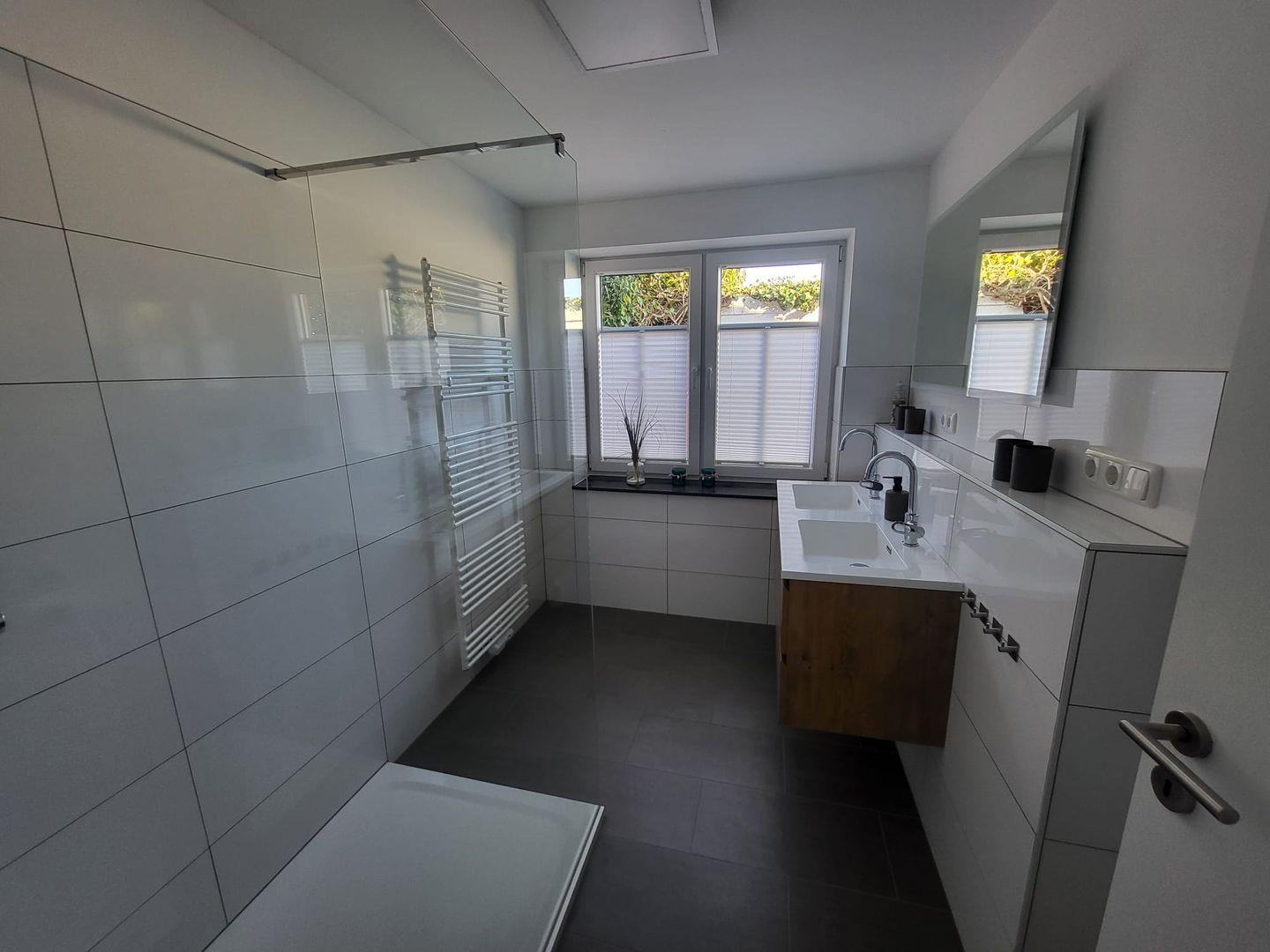 Direkt nebenan befindet sich das moderne, helle Badezimmer mit Fenster, Doppelwaschbecken und großer ebenerdiger Dusche. Ein separates Gäste-WC sowie ein praktischer Abstellraum ergänzen den unteren Wohnbereich.