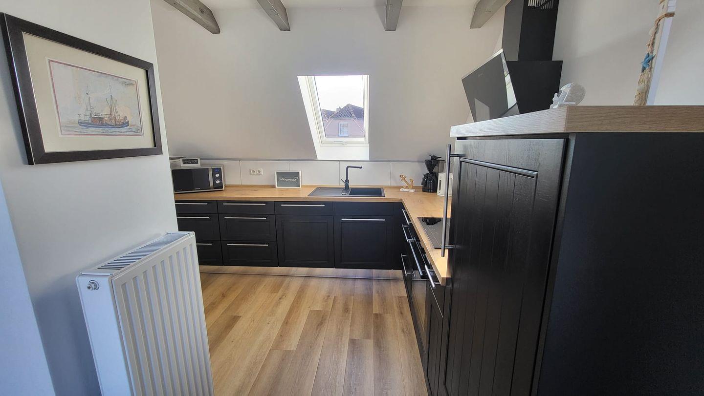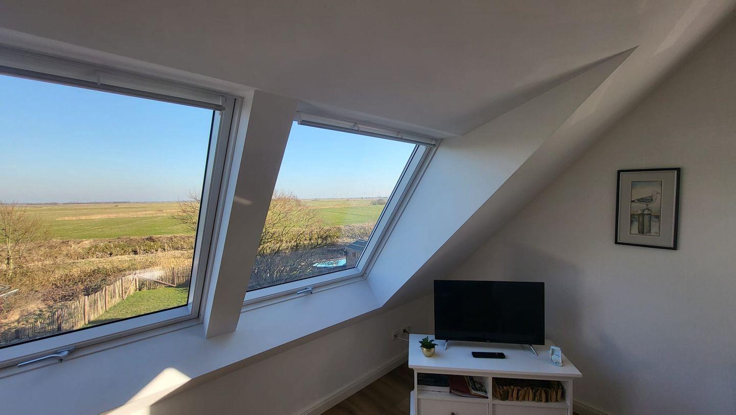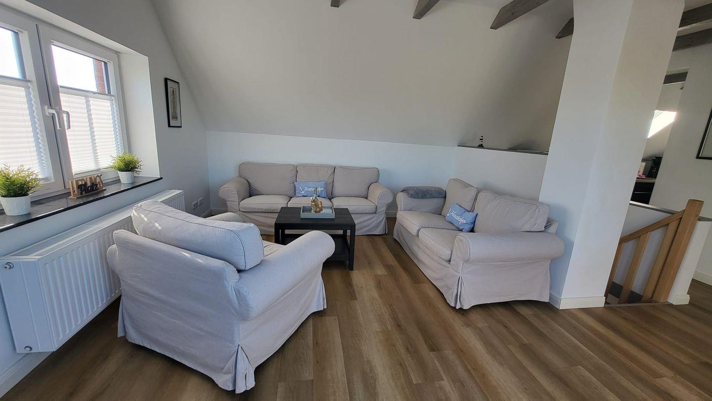 In der oberen Etage erwartet Sie ein großzügiger, lichtdurchfluteter Wohn- und Essbereich mit offener Küche. Mehrere Dachfenster eröffnen einen traumhaften Blick über die weite ostfriesische Landschaft. Auf der bequemen Couch können Sie bei einer Tasse Ostfriesentee entspannen und den Ausblick genießen oder sich vom modernen Flat-Screen unterhalten lassen.