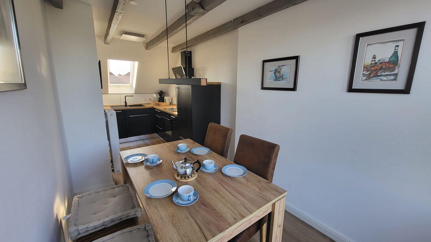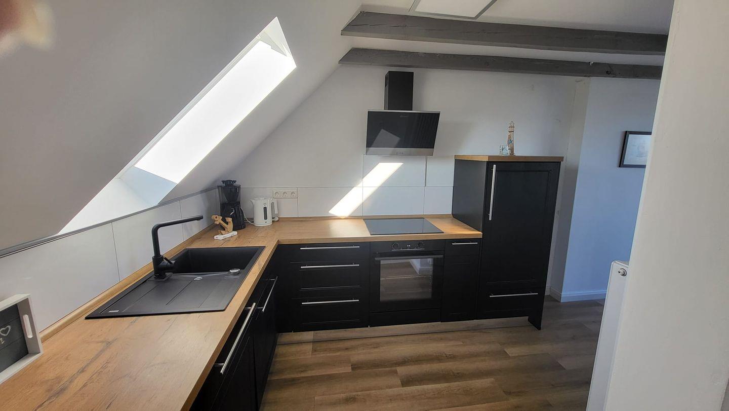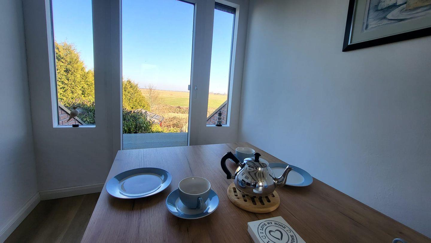 In der oberen Etage erwartet Sie ein großzügiger, lichtdurchfluteter Wohn- und Essbereich mit offener Küche. Mehrere Dachfenster eröffnen einen traumhaften Blick über die weite ostfriesische Landschaft. Auf der bequemen Couch können Sie bei einer Tasse Ostfriesentee entspannen und den Ausblick genießen oder sich vom modernen Flat-Screen unterhalten lassen.