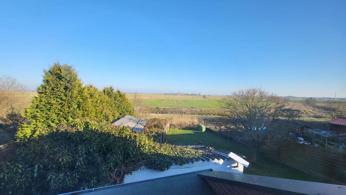 Der lichtdurchflutete Wohn- und Essbereich mit offener, voll ausgestatteter Küche befindet sich im Obergeschoss und bietet einen weiten Blick über die ostfriesische Landschaft. (Hinweis: Balkon derzeit nicht nutzbar.)