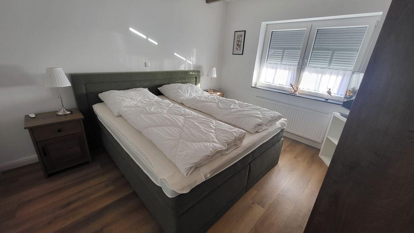 Das Erdgeschoss empfängt Sie mit zwei gemütlichen Schlafzimmern, jeweils ausgestattet mit hochwertigen Boxspring-Doppelbetten (bitte großes Spannbettlaken 180 x 200 cm mitbringen). Außenrollos sorgen für angenehme Verdunkelung und ruhige Nächte.