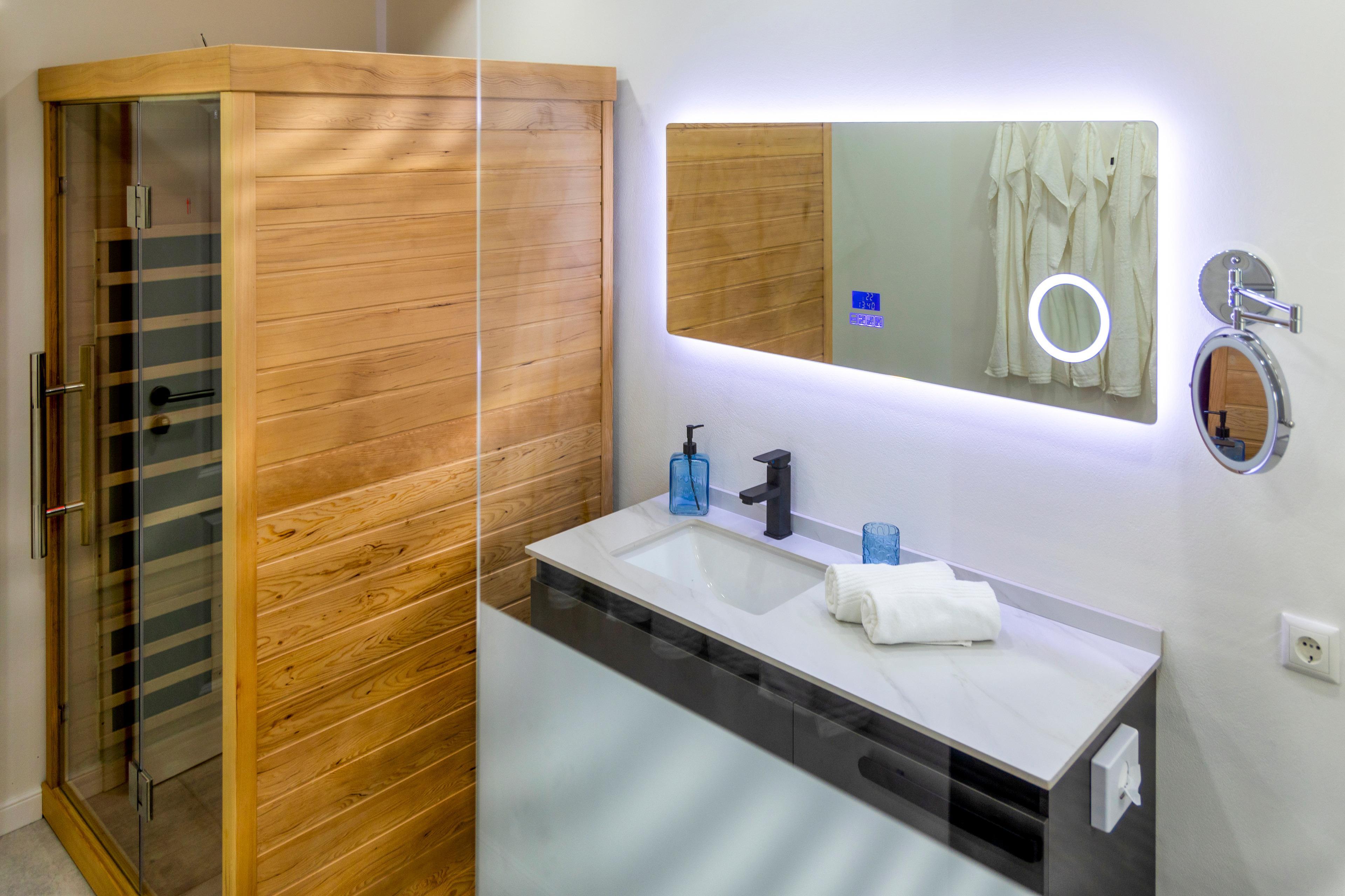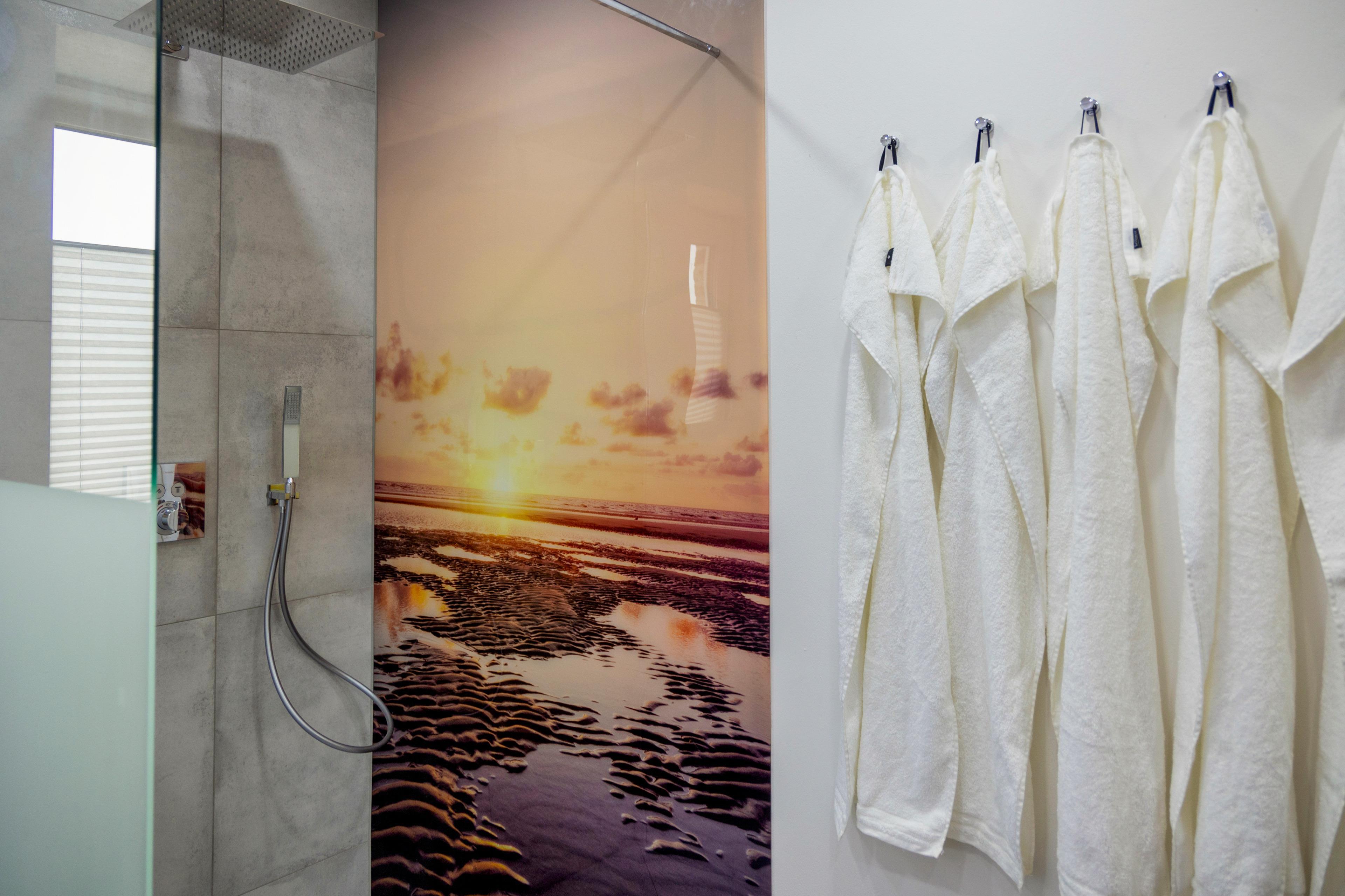 Eine Fußbodenheizung sorgt im ganzen Haus für wohlige Wärme und eine Klimaanlage rundet das ganze ab. In den stilvollen Bädern finden Sie bodengleiche Duschen und Infrarotkabinen, die nach einem erfrischenden Tag an der Nordsee zum Aufwärmen einladen. Genießen Sie ein Glas Wein bei Kerzenschein und entspannen Sie anschließend im bequemen Boxspringbett, vielleicht mit einem Film auf dem großen Flachbildfernseher.