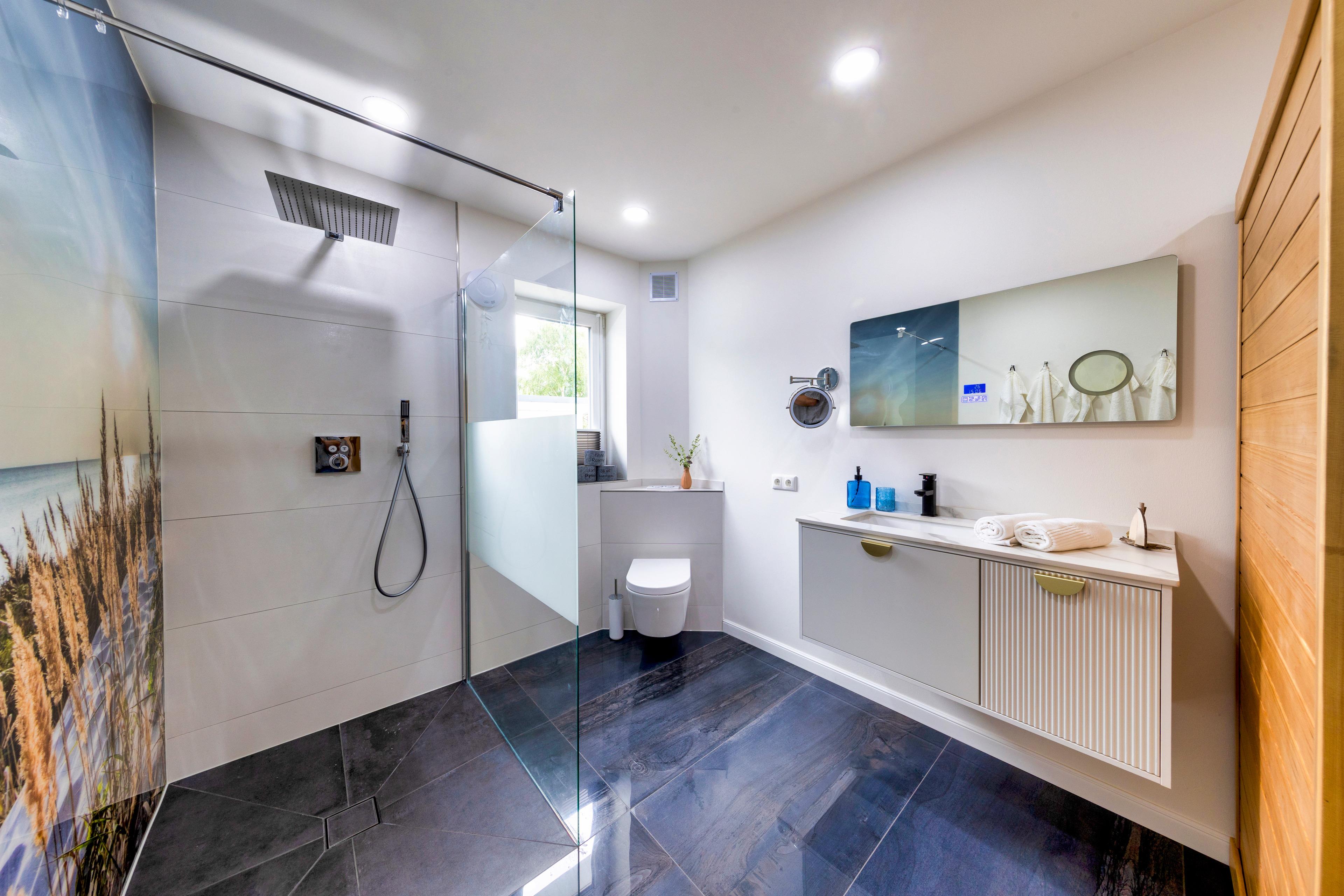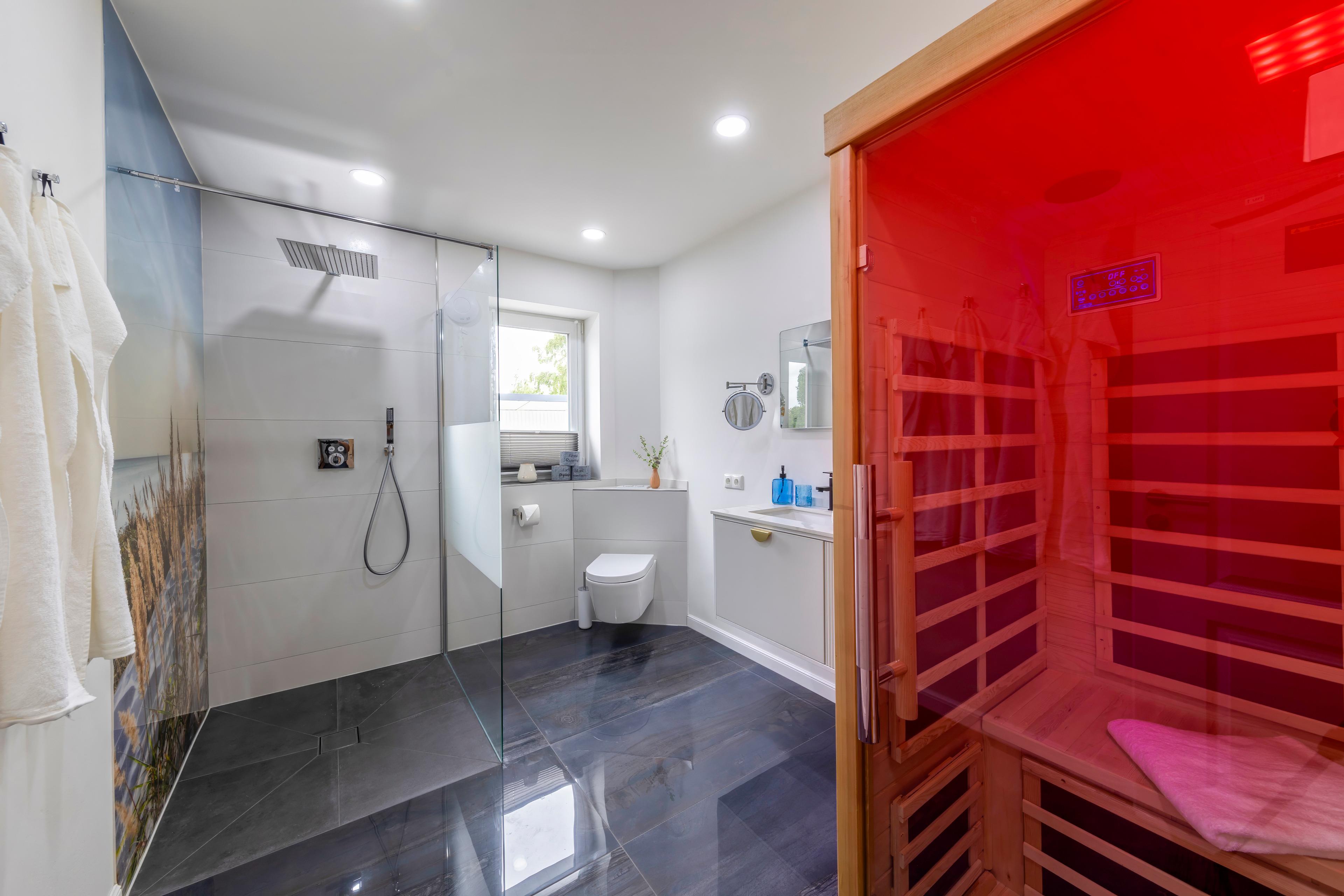 Eine Fußbodenheizung sorgt im ganzen Haus für wohlige Wärme und eine Klimaanlage rundet das ganze ab. In den stilvollen Bädern finden Sie bodengleiche Duschen und Infrarotkabinen, die nach einem erfrischenden Tag an der Nordsee zum Aufwärmen einladen. Genießen Sie ein Glas Wein und entspannen Sie anschließend im bequemen Boxspringbett, vielleicht mit einem Film auf dem großen Flachbildfernseher.