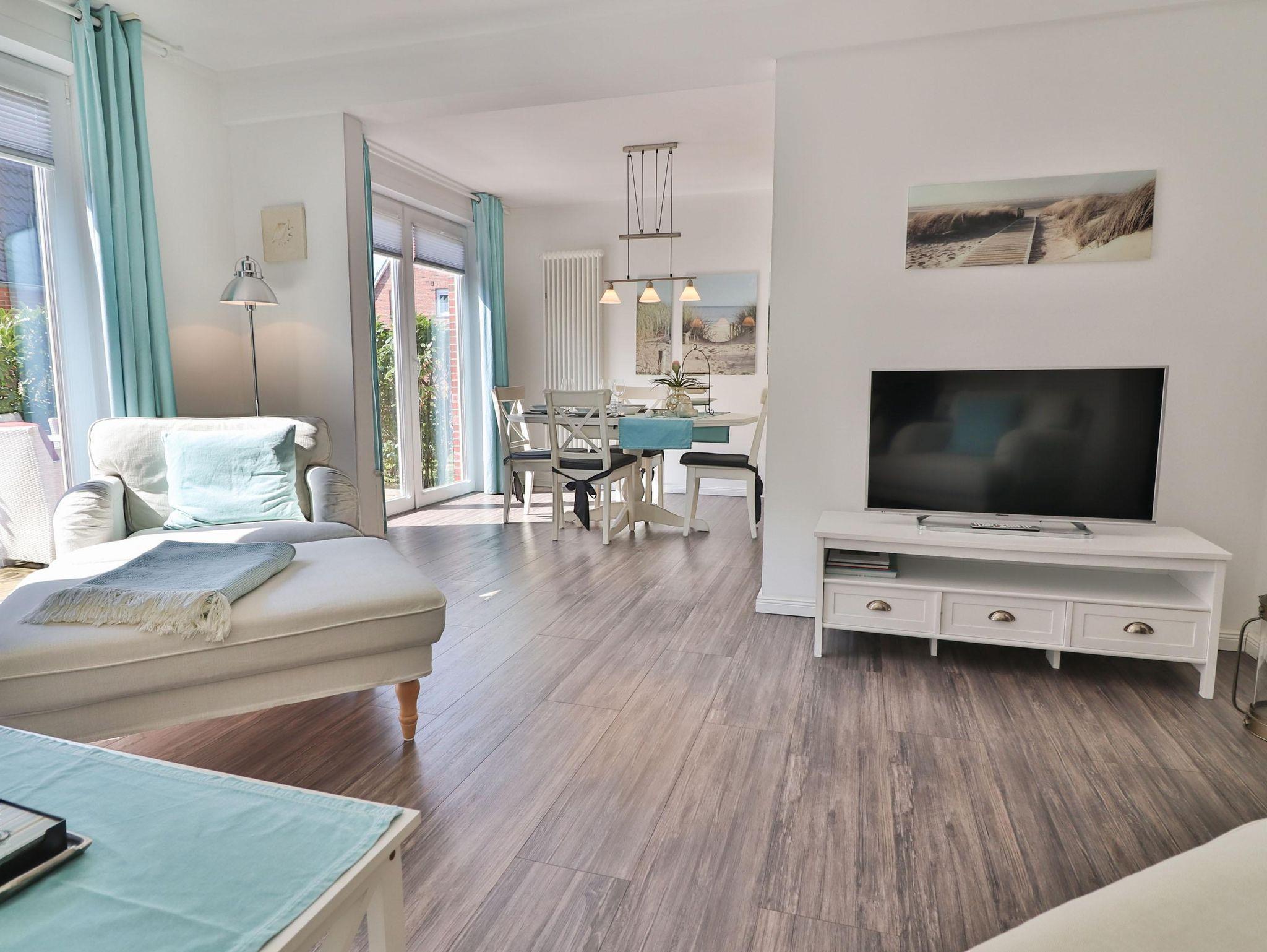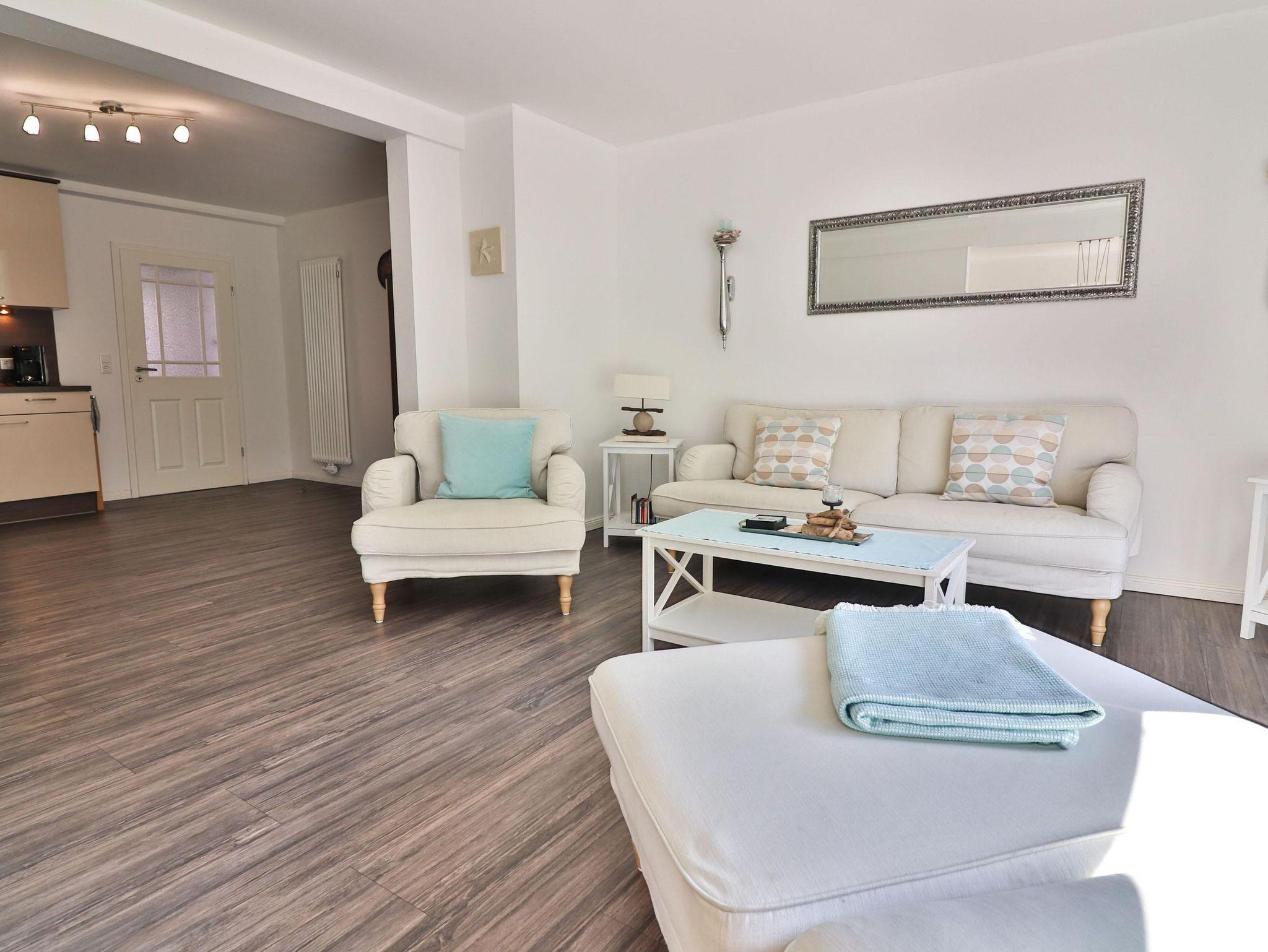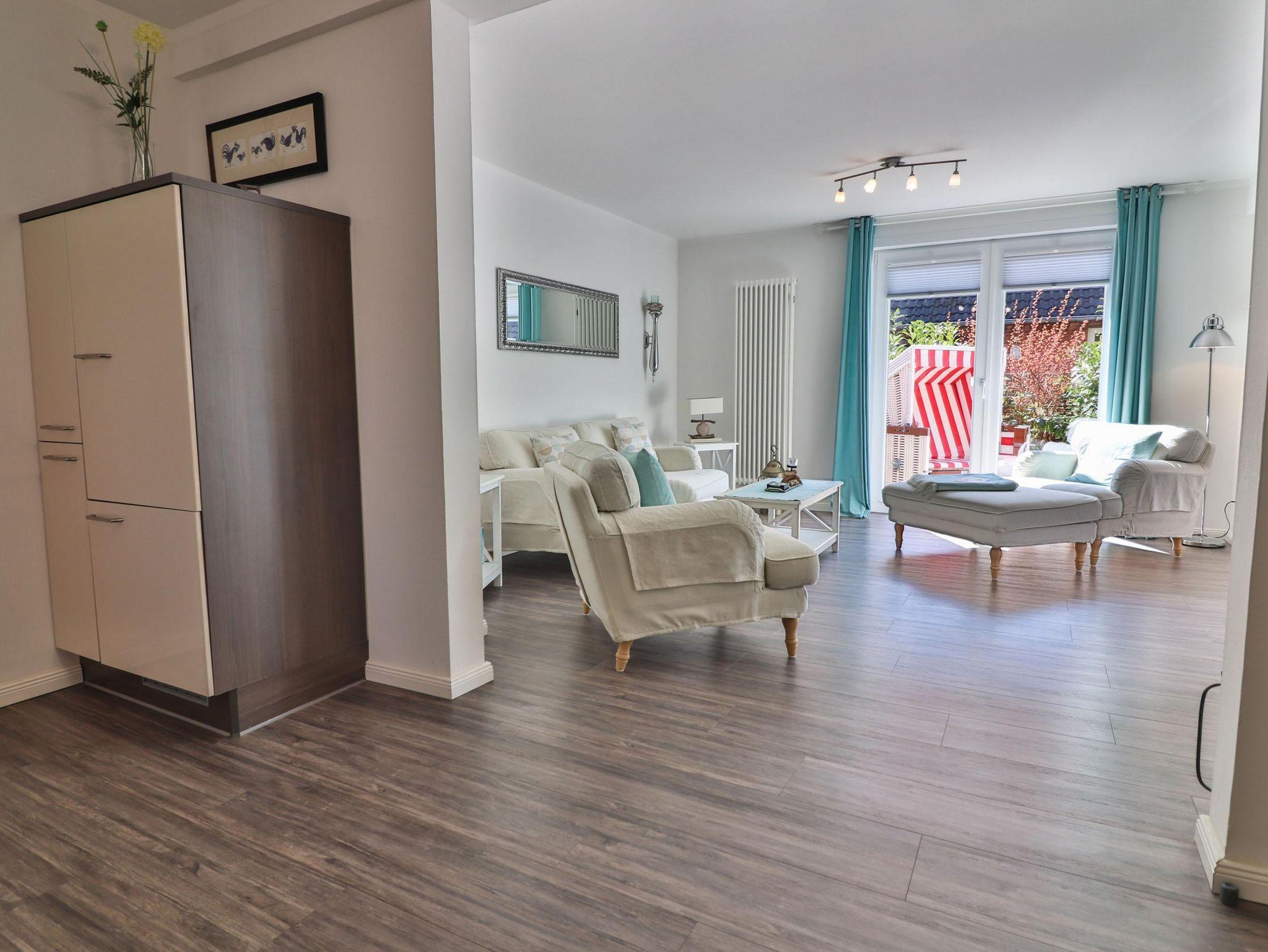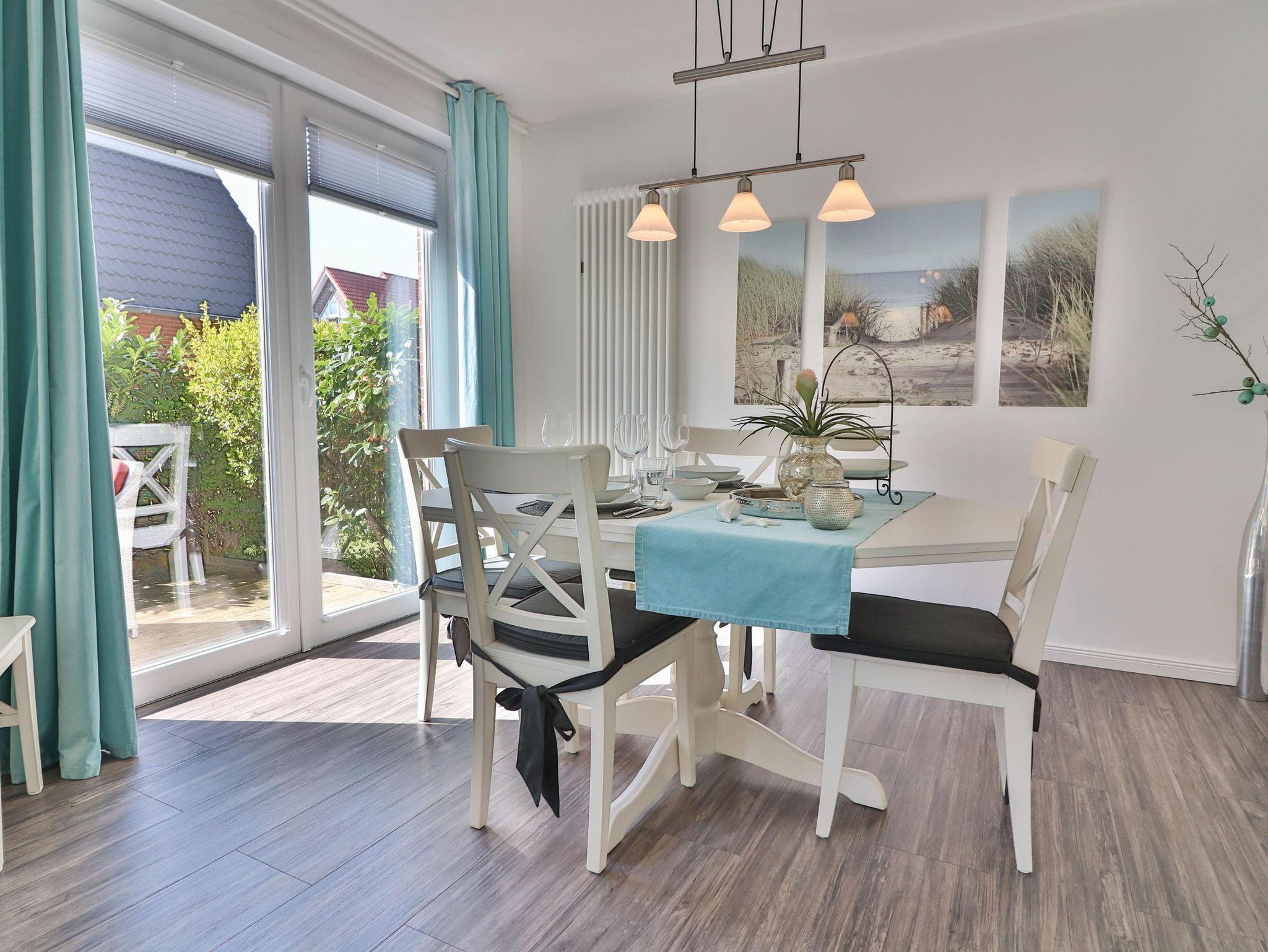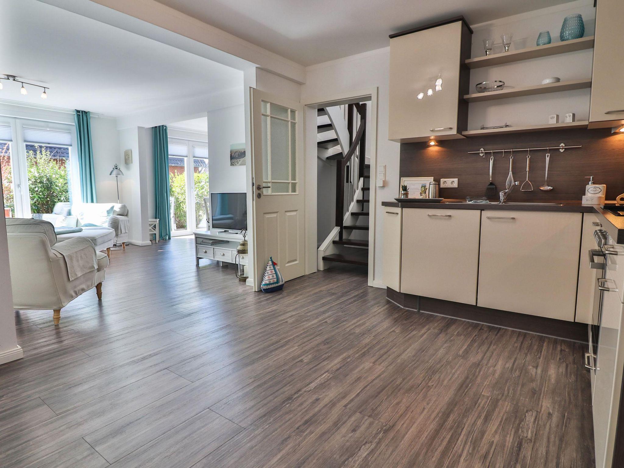 Das Ferienhaus verfügt über einen Wohnbereich mit Küche und Esszimmer, dem eine Außenterrasse mit Strandkorb angegliedert ist. Im Erdgeschoss befindet sich zudem ein Gäste-WC.