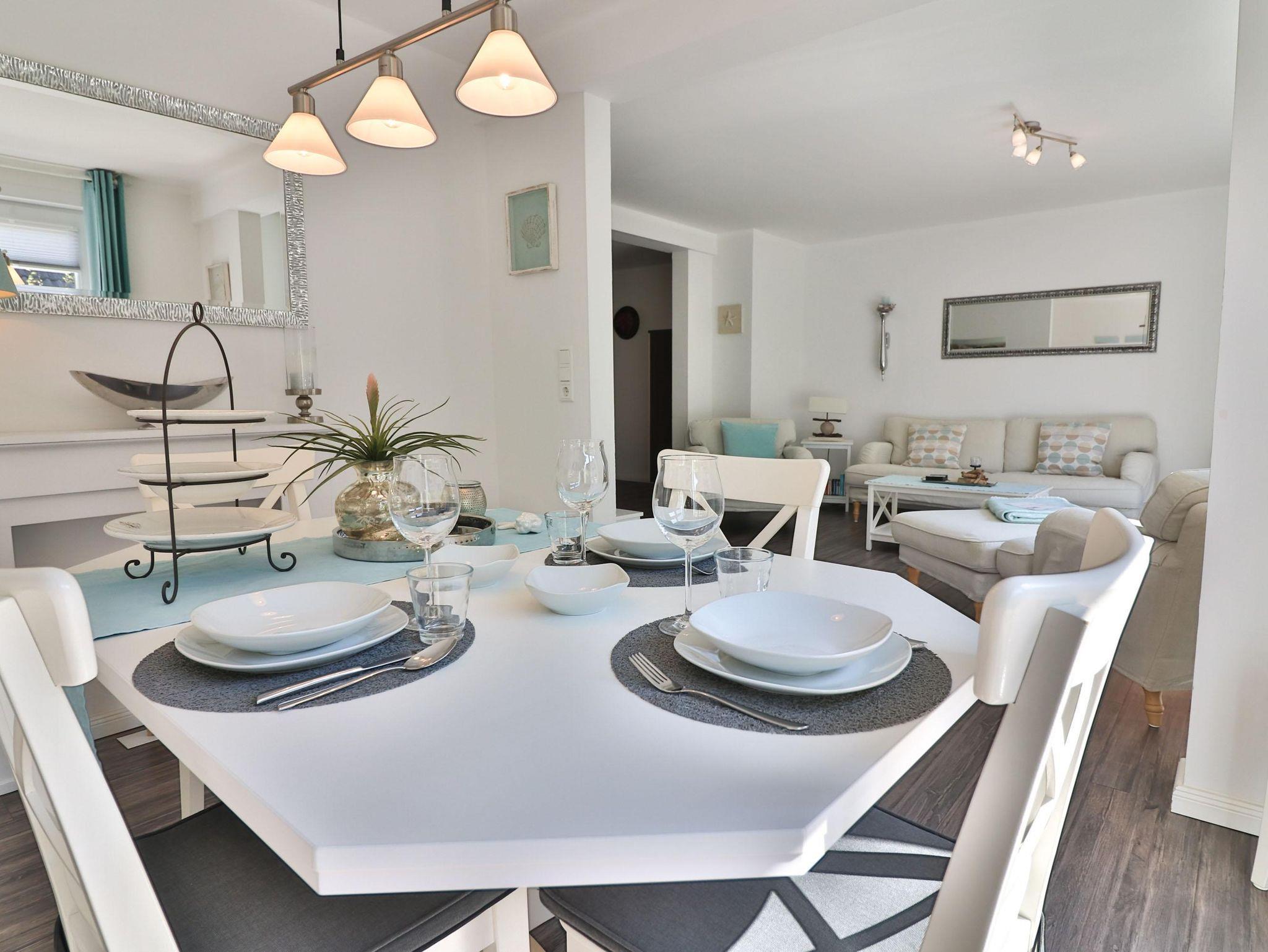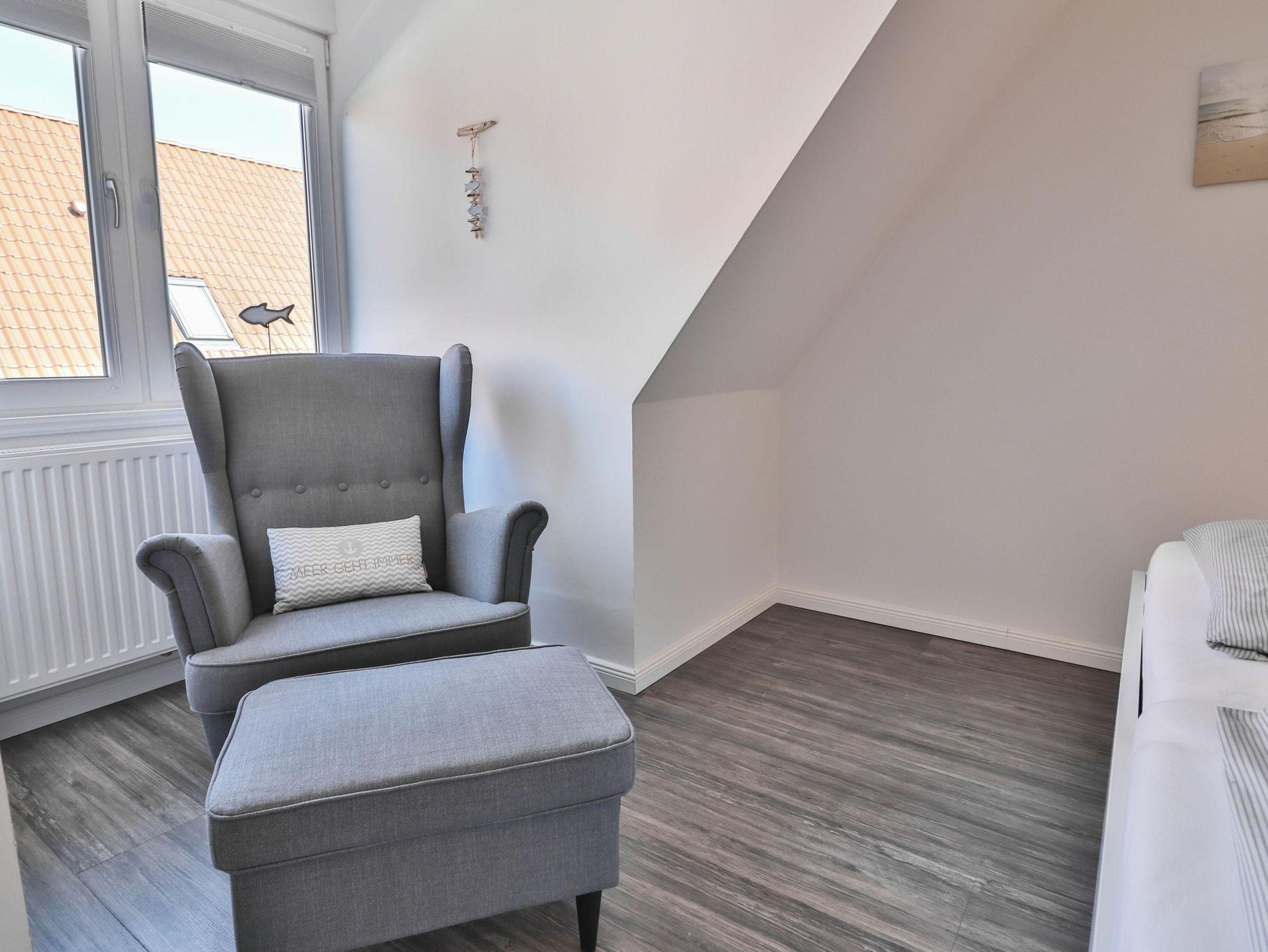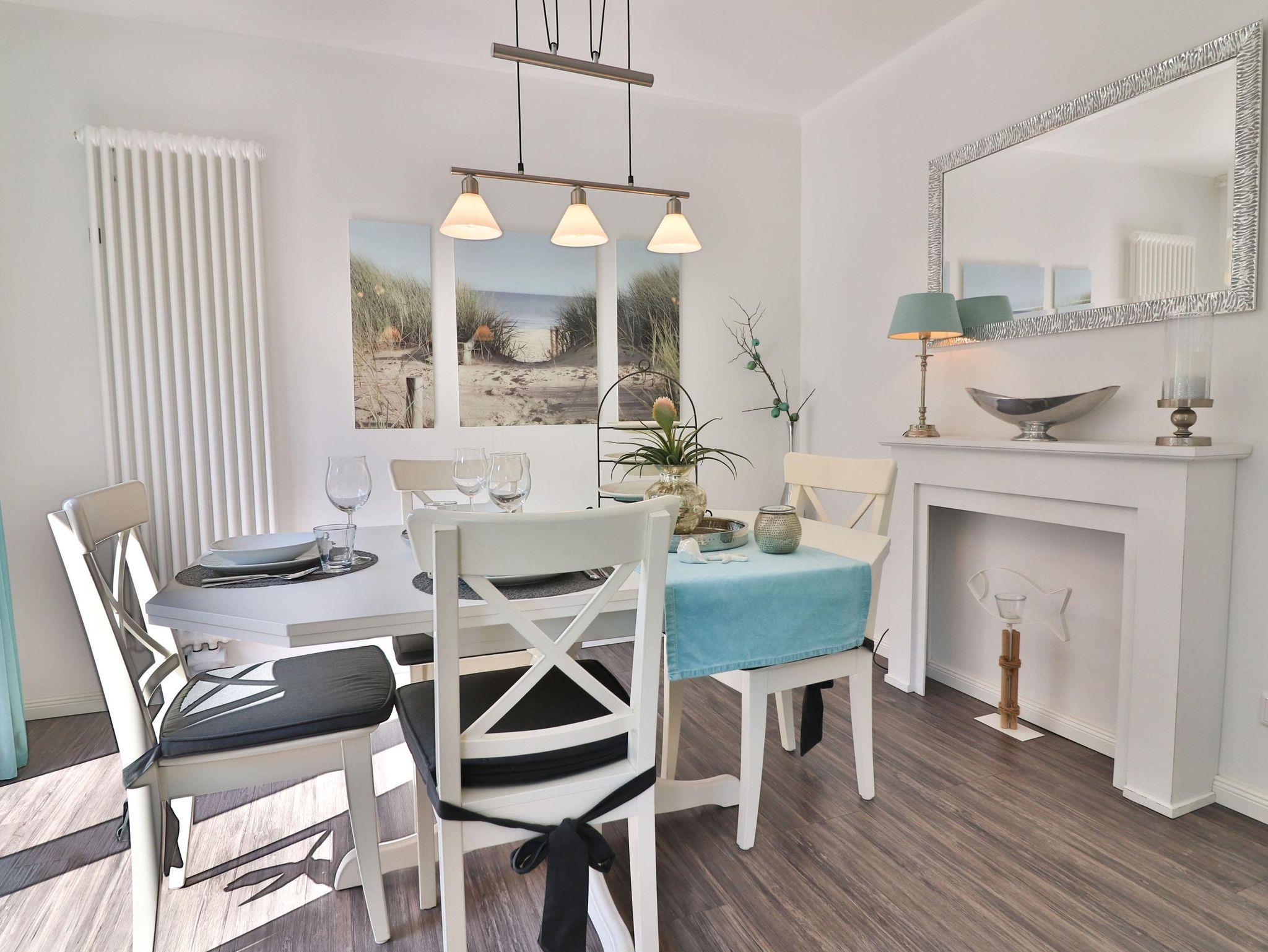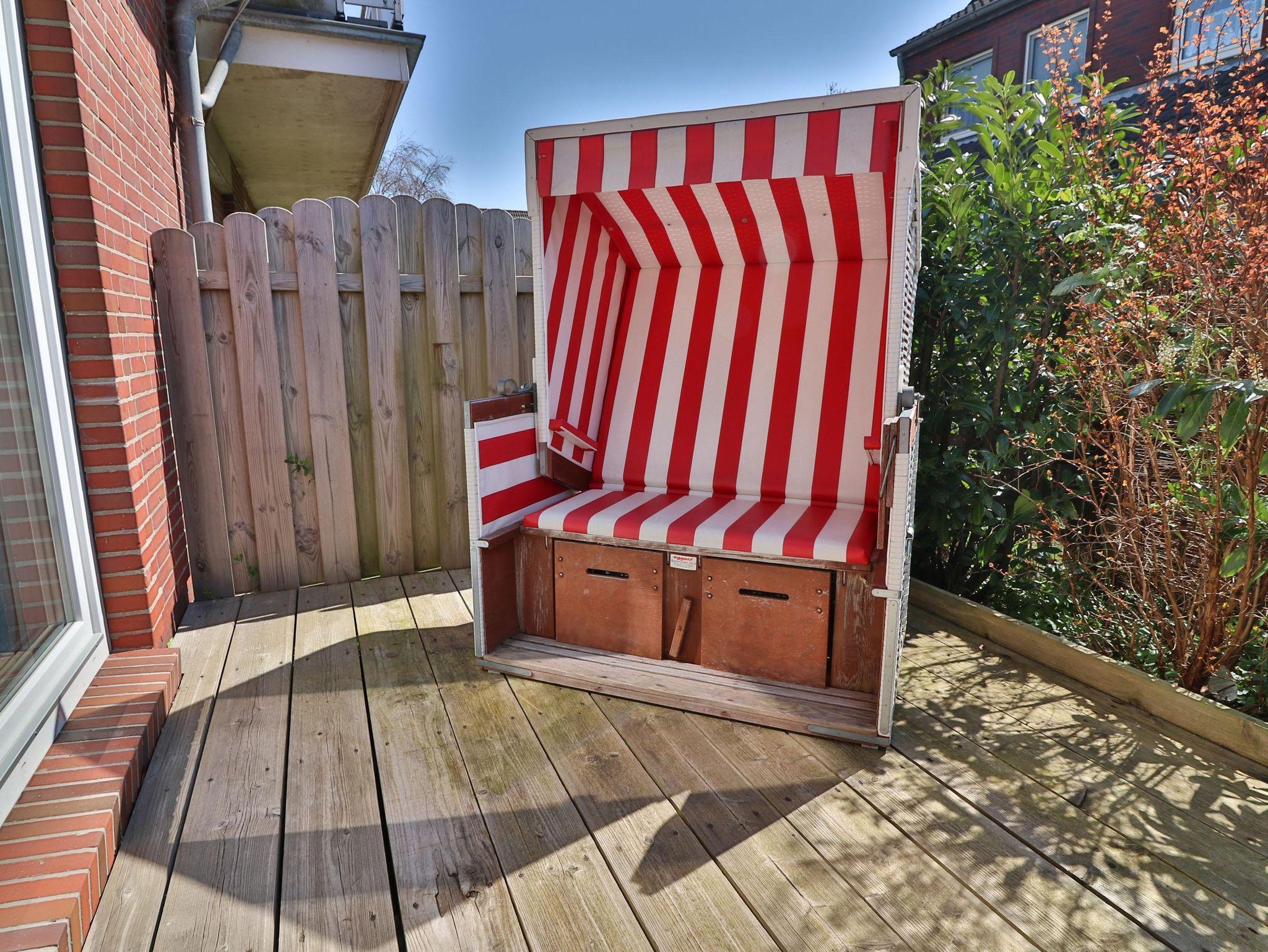 Das Ferienhaus verfügt über einen Wohnbereich mit Küche und Esszimmer, dem eine Außenterrasse mit Strandkorb angegliedert ist. Im Erdgeschoss befindet sich zudem ein Gäste-WC.