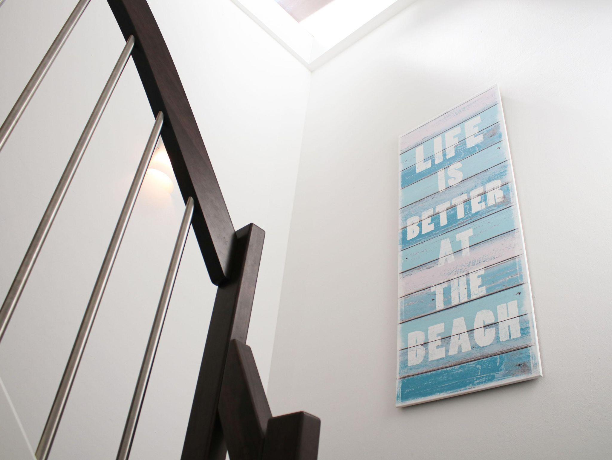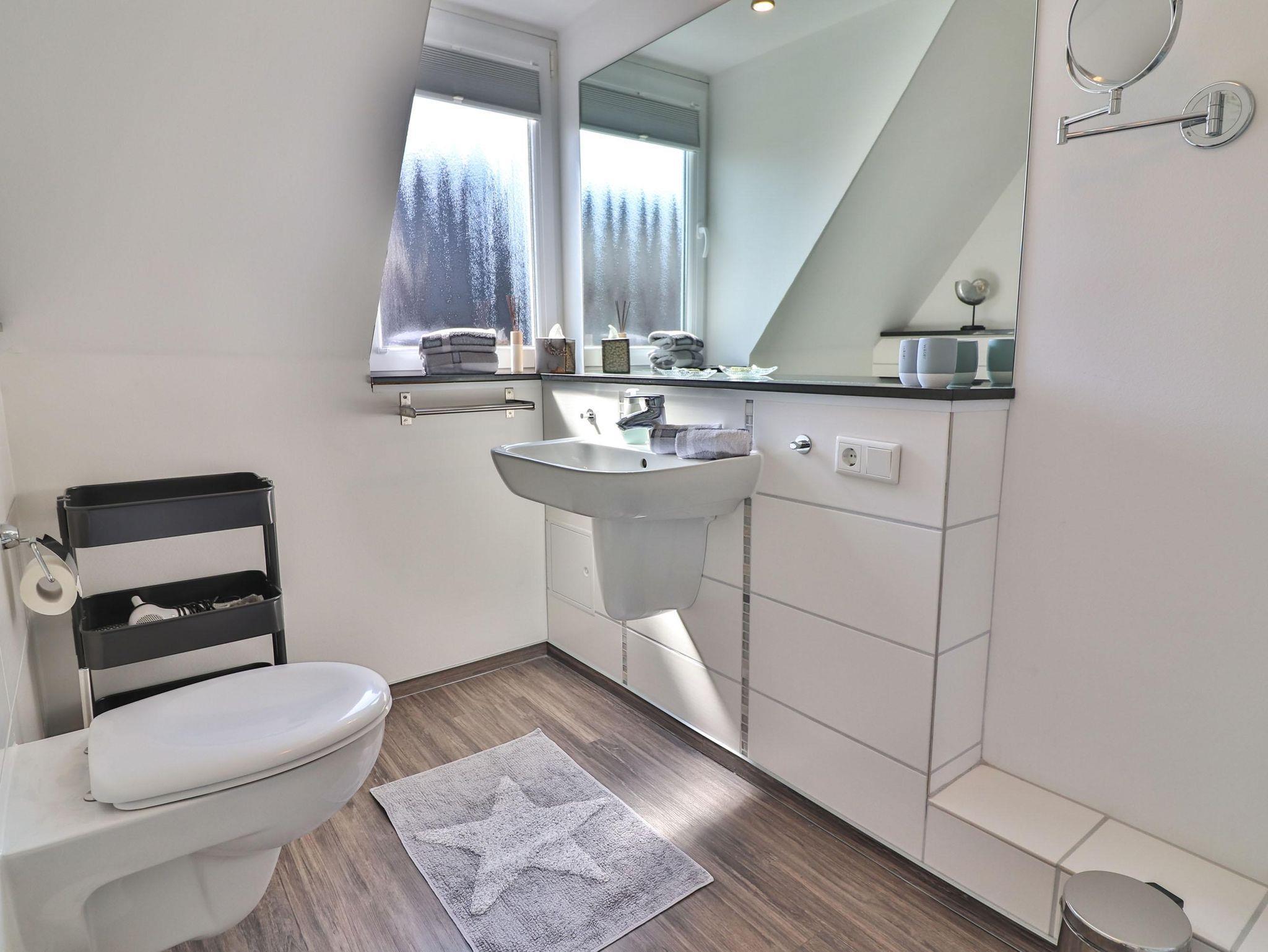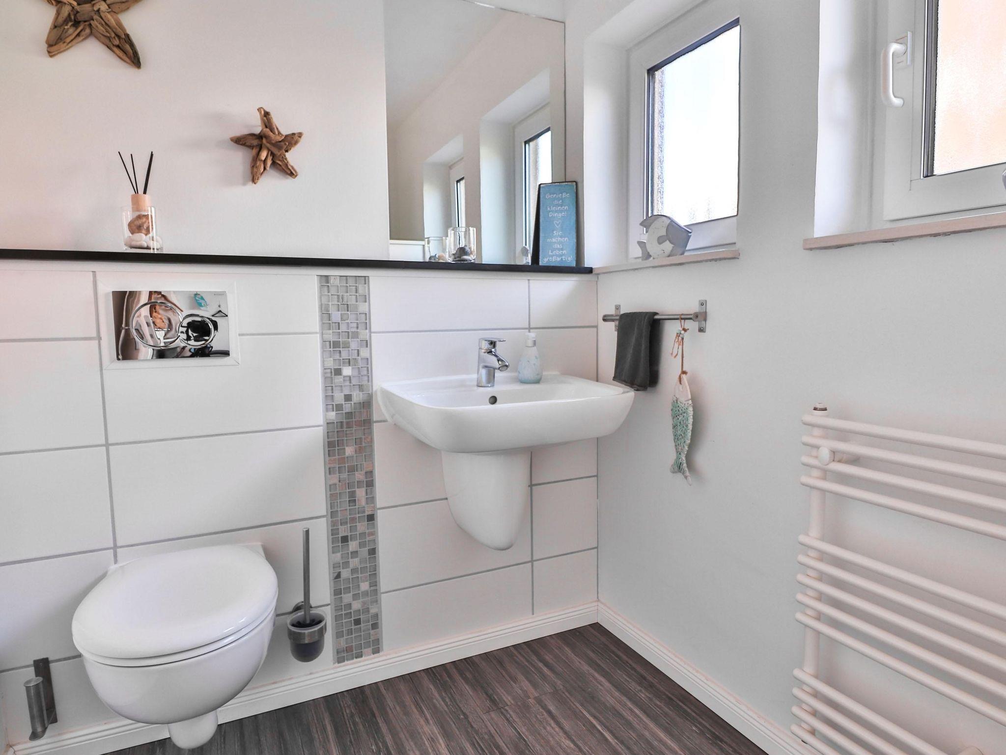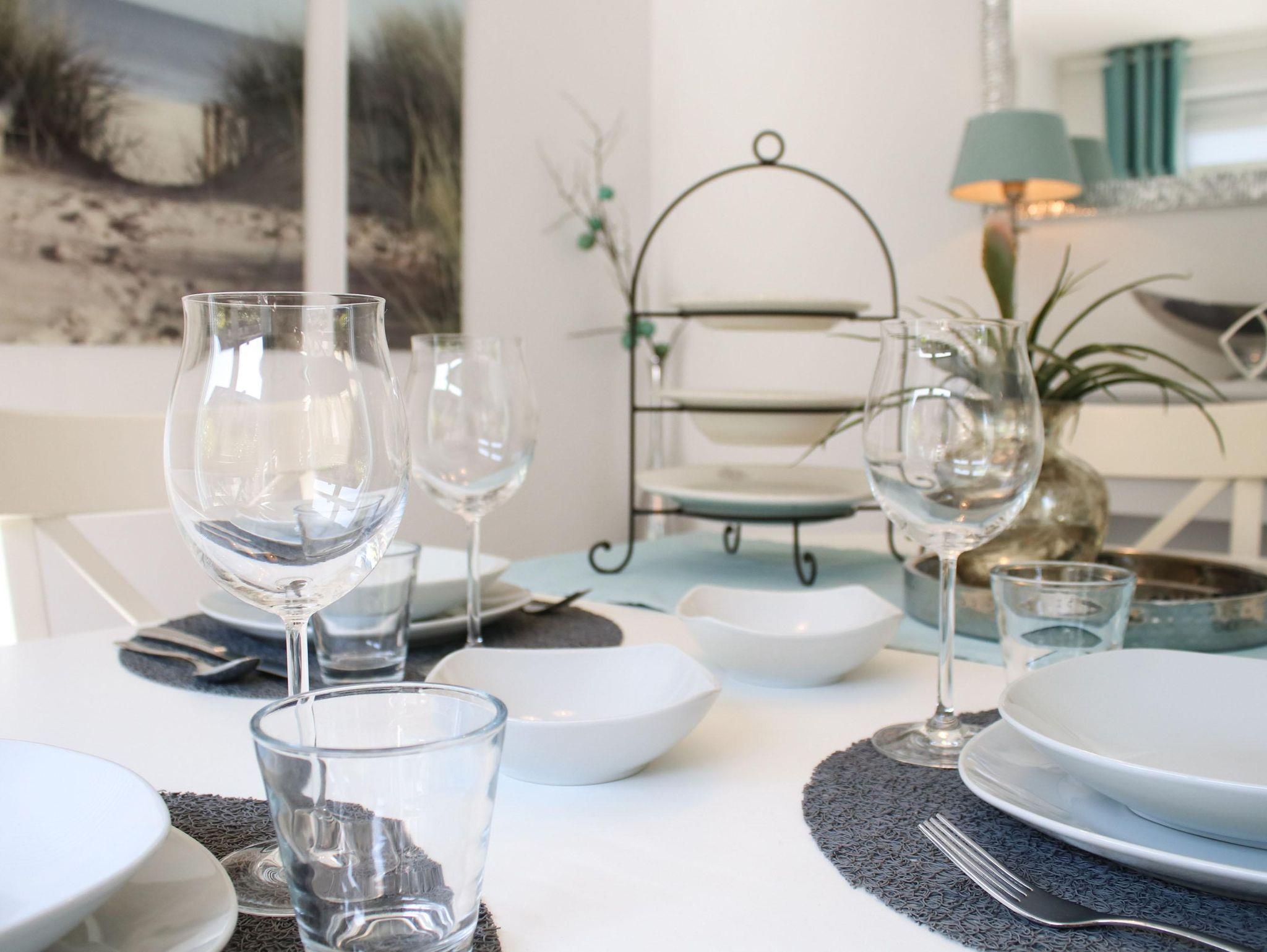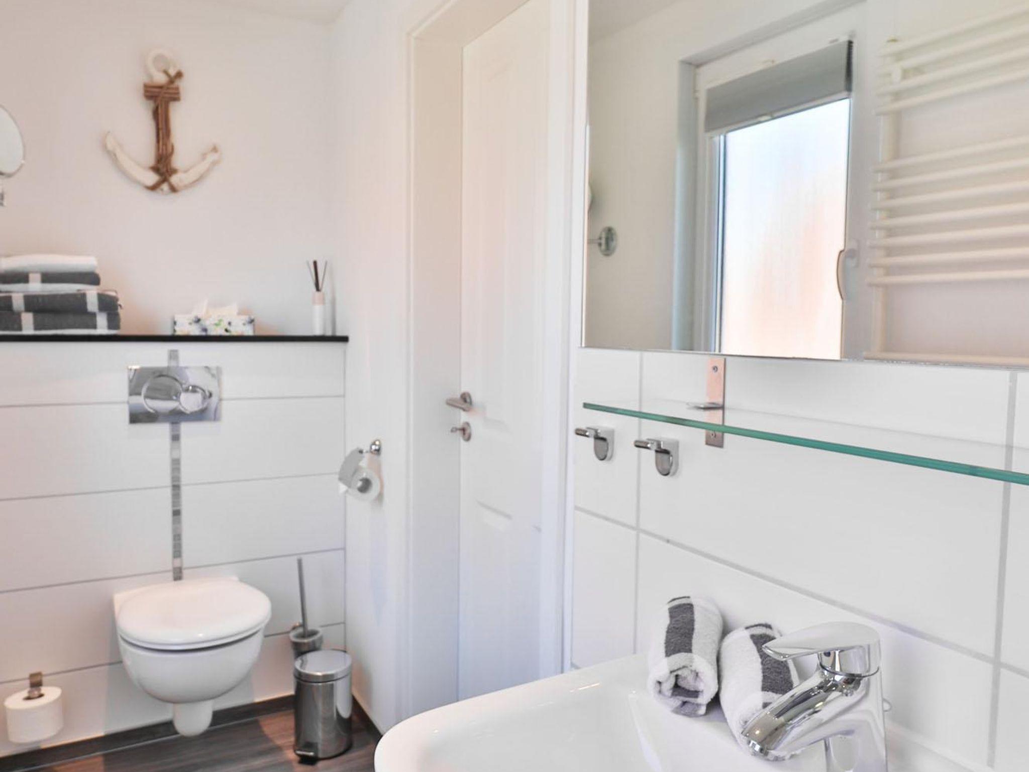 Das Ferienhaus verfügt über einen Wohnbereich mit Küche und Esszimmer, dem eine Außenterrasse mit Strandkorb angegliedert ist. Im Erdgeschoss befindet sich zudem ein Gäste-WC.