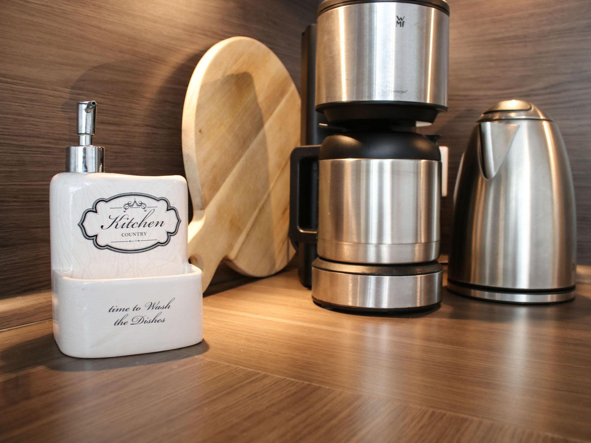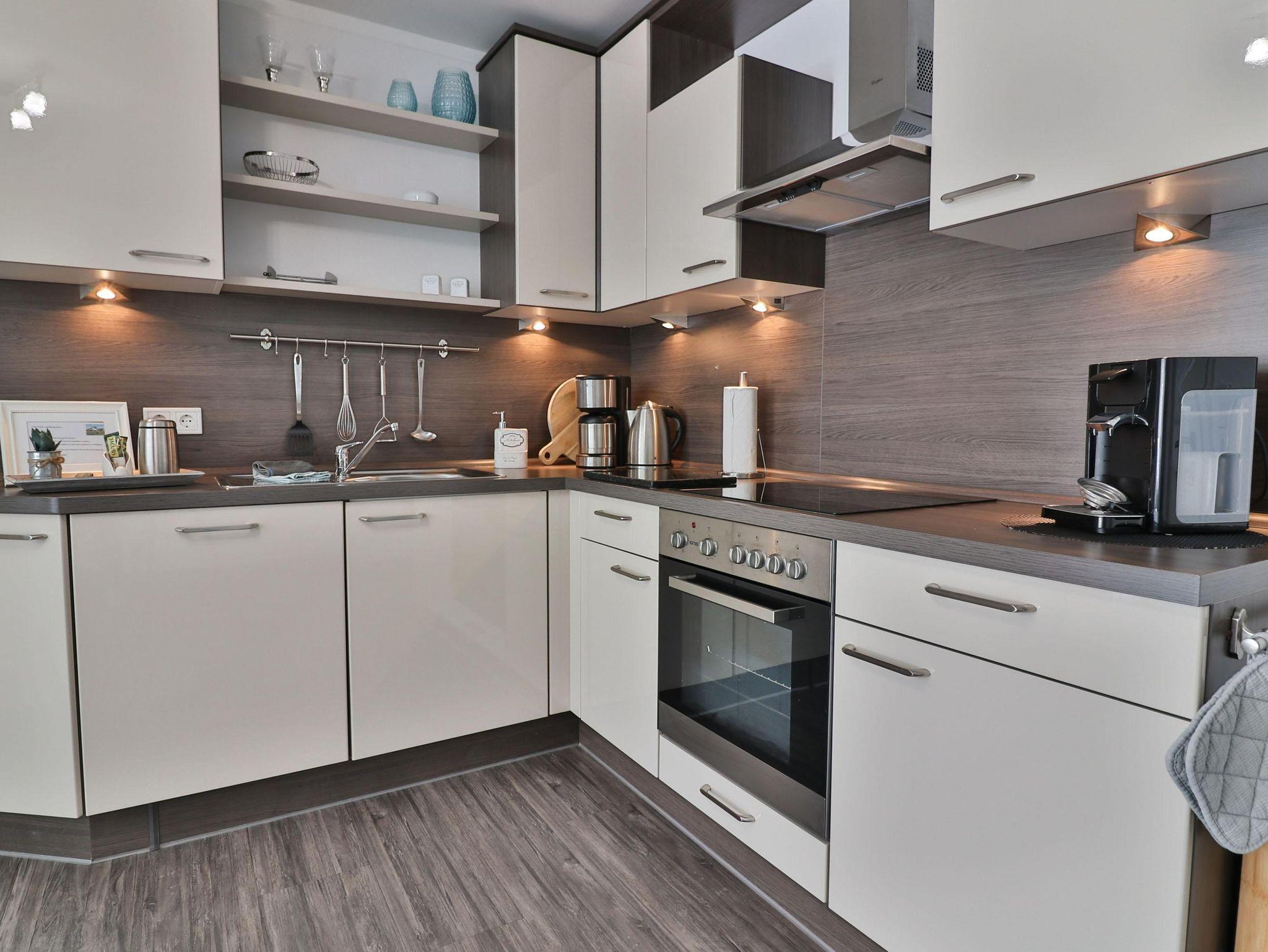 Die Küche im Ferienhaus „Tüsken Tiden“ ist mit Spülmaschine, Backofen, Wasserkocher, Toaster, sowie einer Kaffee - und Senseomaschine ausgestattet.