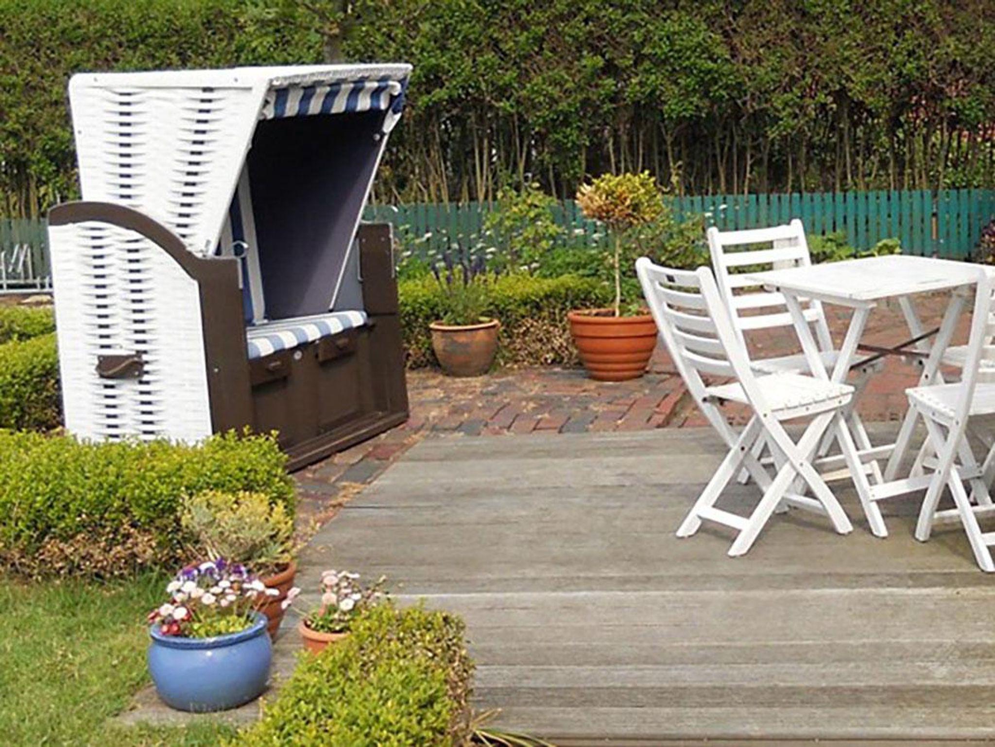 Der Terrassenbereich hat seinen eigenen Strandkorb mit Blick auf die Pferdekoppel. Heizung und Kaminofen lassen es bei jedem Wetter gemütlich sein.