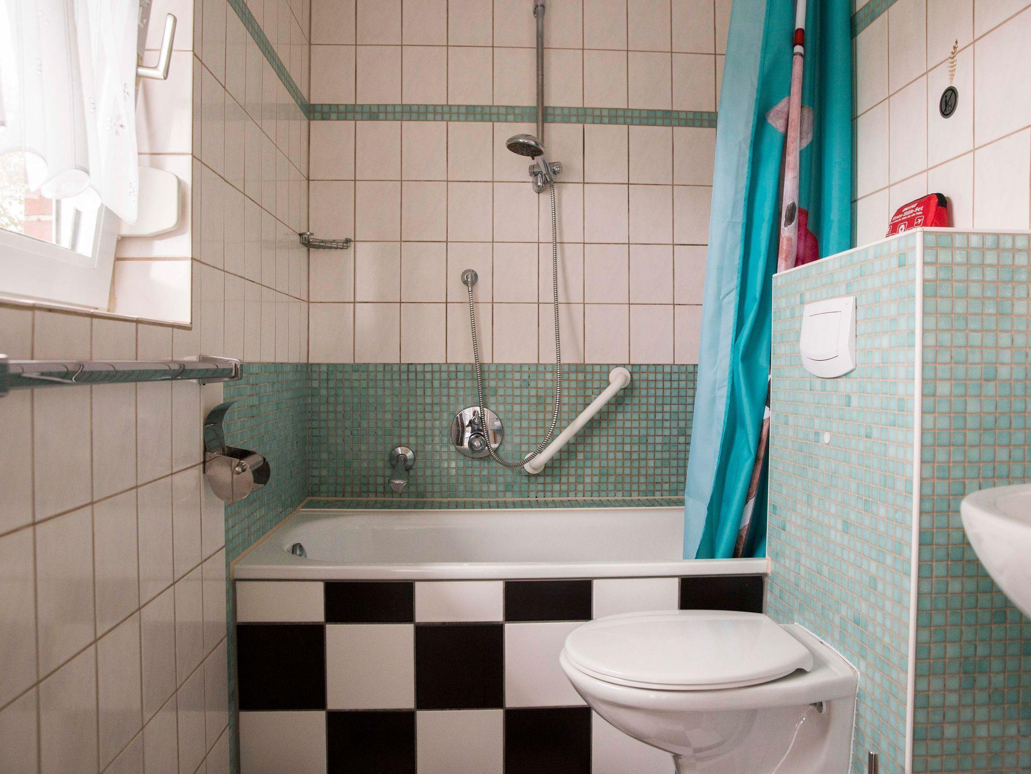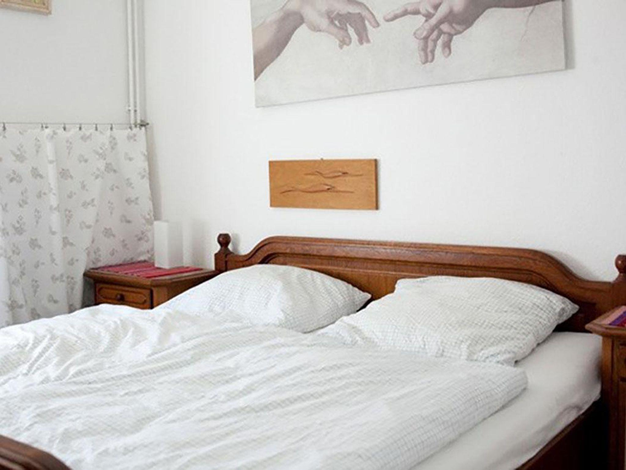 Die anderen Räume gehen vom Flur ab: Das Badezimmer mit Wannenbad, ein Schlafzimmer mit Doppelbett und das Wohnzimmer mit Parkettfußboden & einem herrlichen Kaminofen.