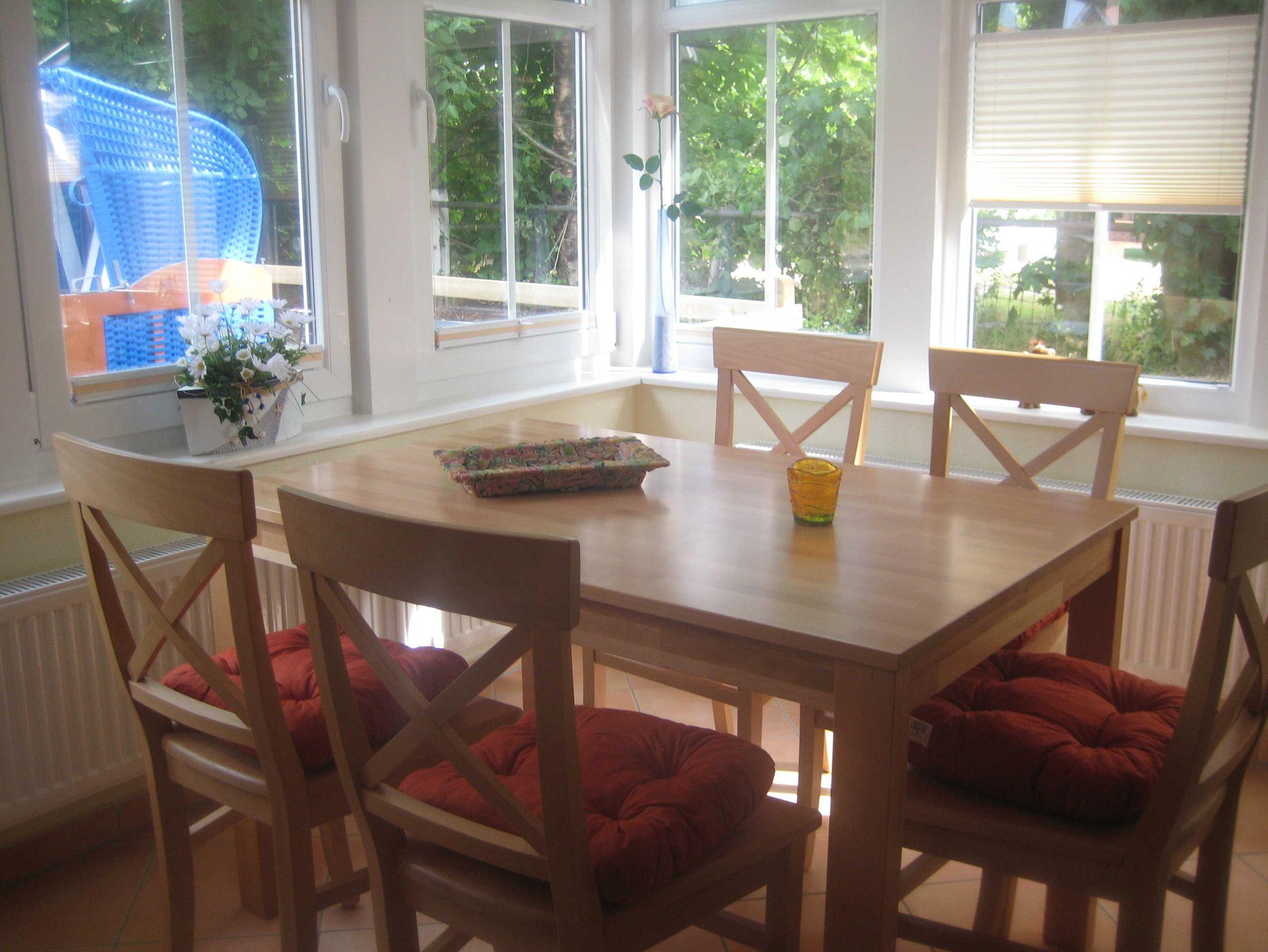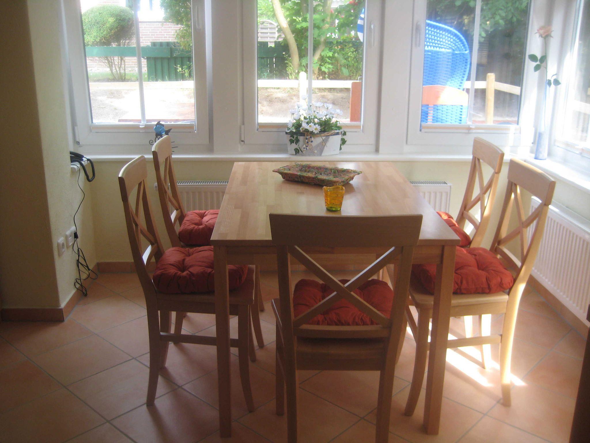 Die 59m² große Maisonette-Wohnung ist eine komplette Haushälfte und bietet genug Platz für 1-4 Personen. Das Erdgeschoss beherbergt eine große Wohnküche mit Essecke. Diese befindet sich in einem lichtdurchfluteten Fenstervorsprung, der eine tolle Aussicht in den Garten ermöglicht. Dieser ist mit einer Terrasse ausgestattet, auf der auch eine Sitzgruppe, Liegestühle und ein Strandkorb stehen. Im Obergeschoss befindet sich ein großes, helles Schlafzimmer mit großem Doppelbett. Der Raum ist groß genug um ein Kinderbett aufzustellen. Das Tageslichtbad ist hell und modern eingerichtet.