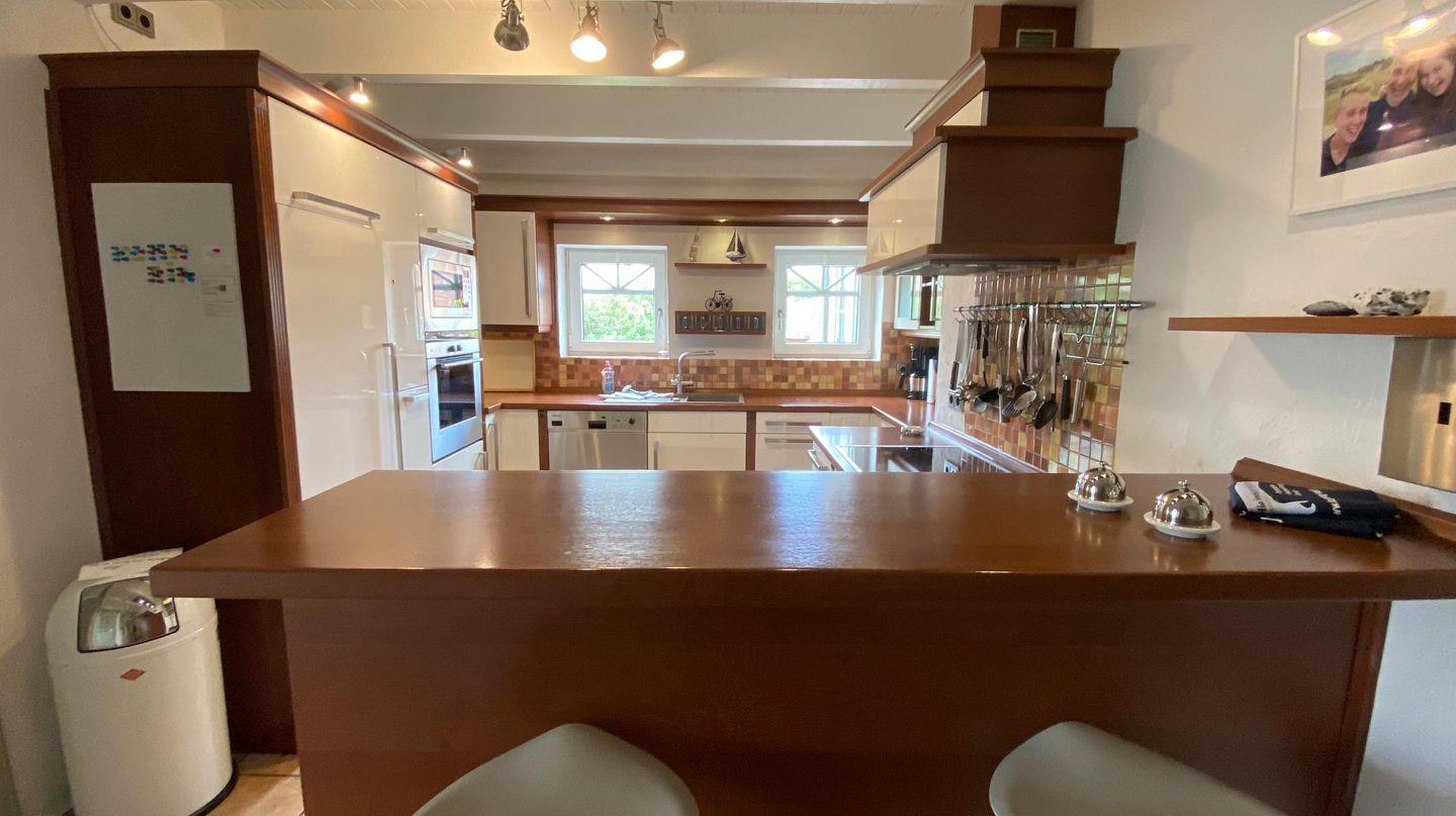 Die große geräumige Küche ist voll ausgestattet und hat einen Tresen für die Snacks zwischendurch.