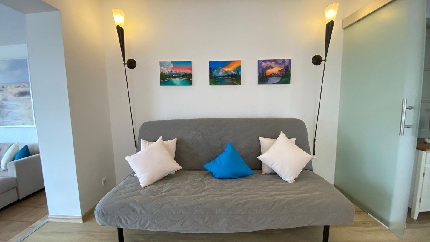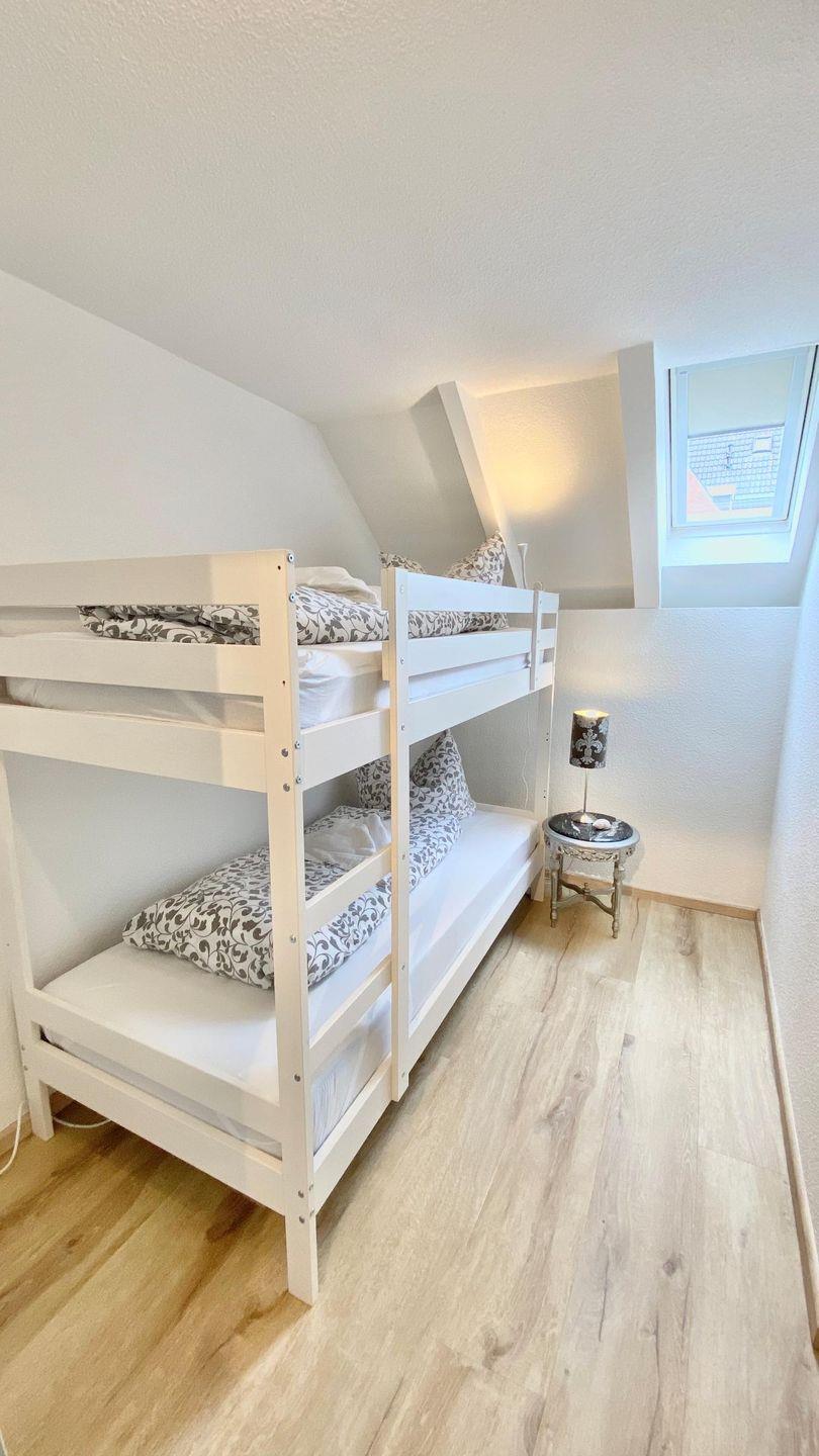 Angrenzend geht es in den Schlafbereich - wobei ein Schlafzimmer mit Doppelbett ( 180x200 ) und das andere mit einem Etagenbett ausgestattet ist - hier könnte auch, wenn benötigt, ein Kinderbett aufgestellt werden. Desweiteren könnte das Sofa im Esszimmer einen weiteren Schlafplatz ( 140x200 ) bieten.