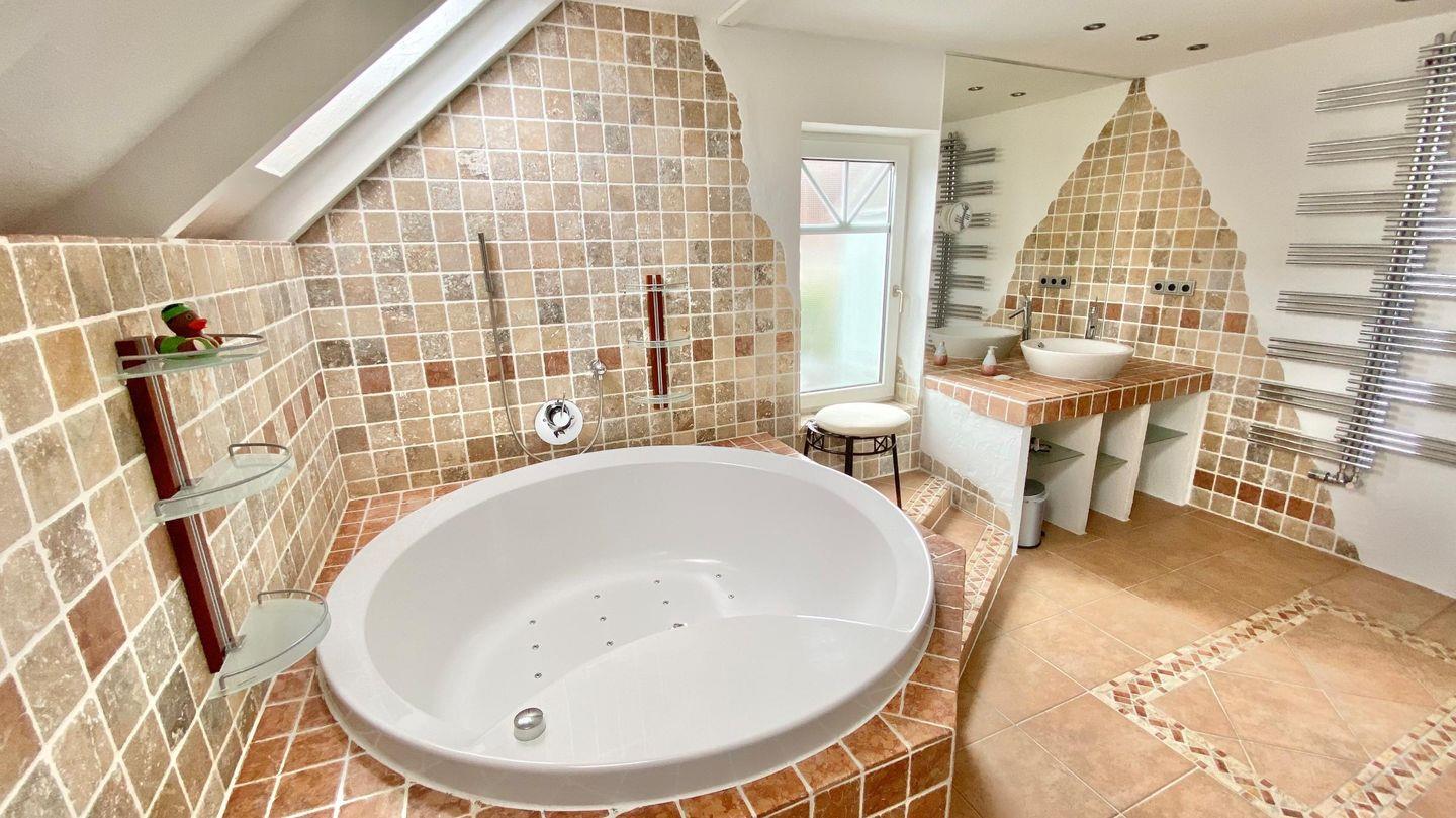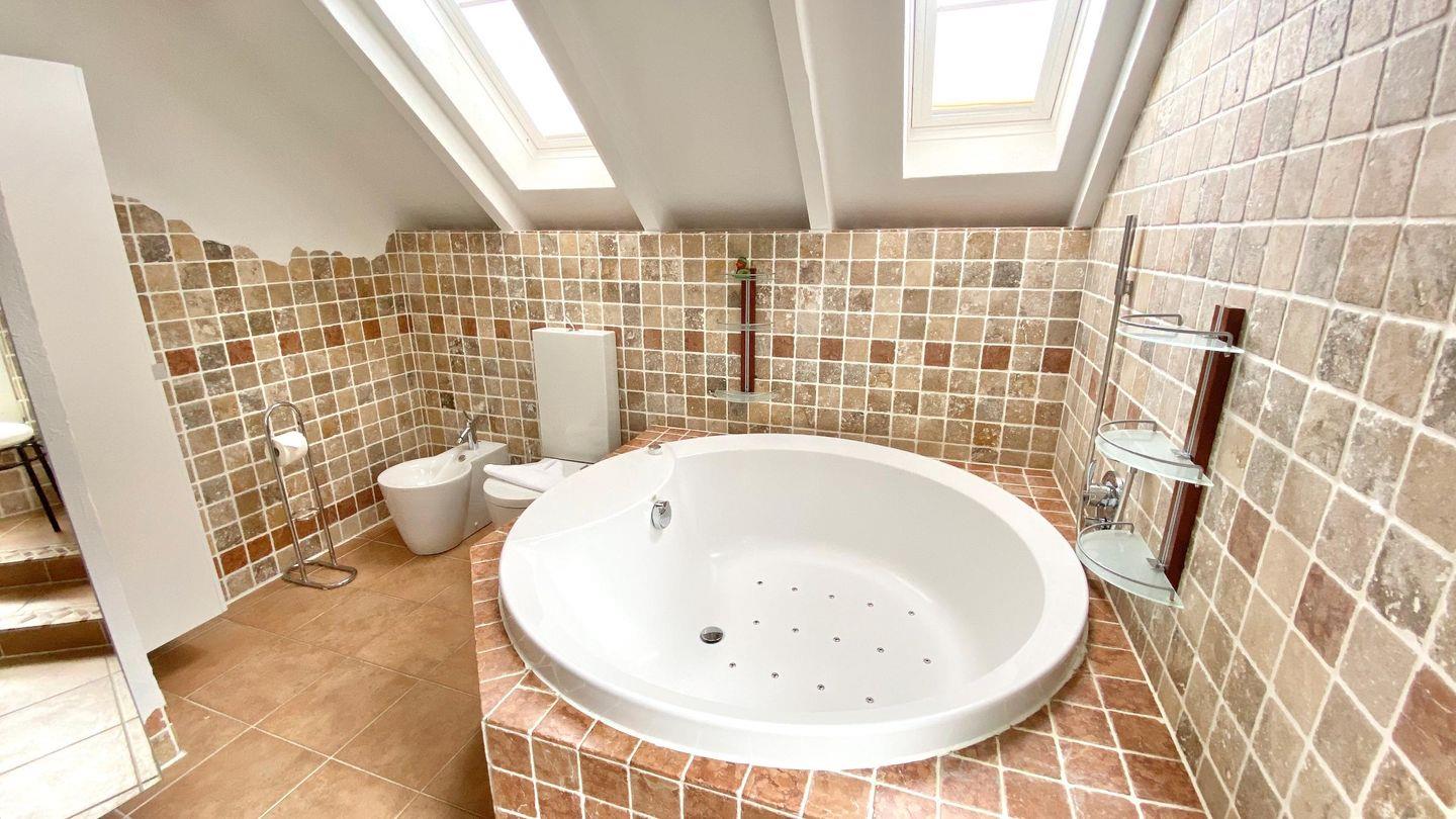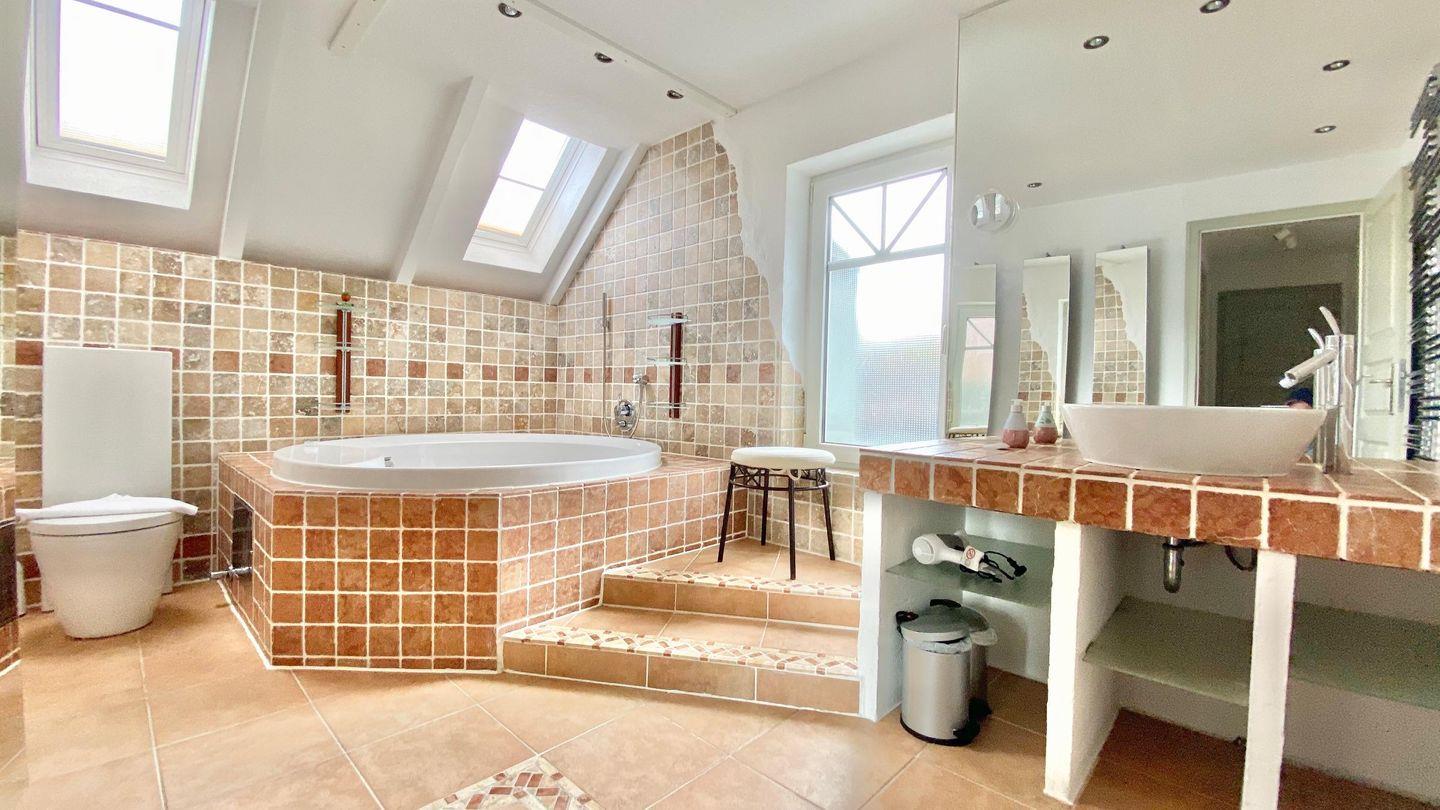 Das stylische Badezimmer hat eine runde Badewanne (ohne Whirlpoolfunktion), ein Doppelwaschbecken, WC und Bidet. In der Wanne haben Sie auch eine Duschvorrichtung.