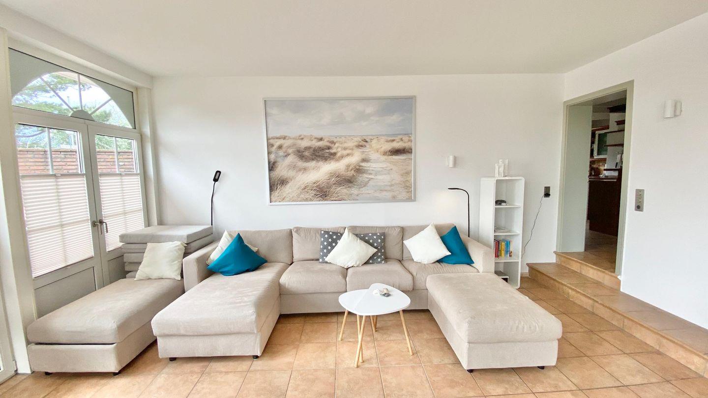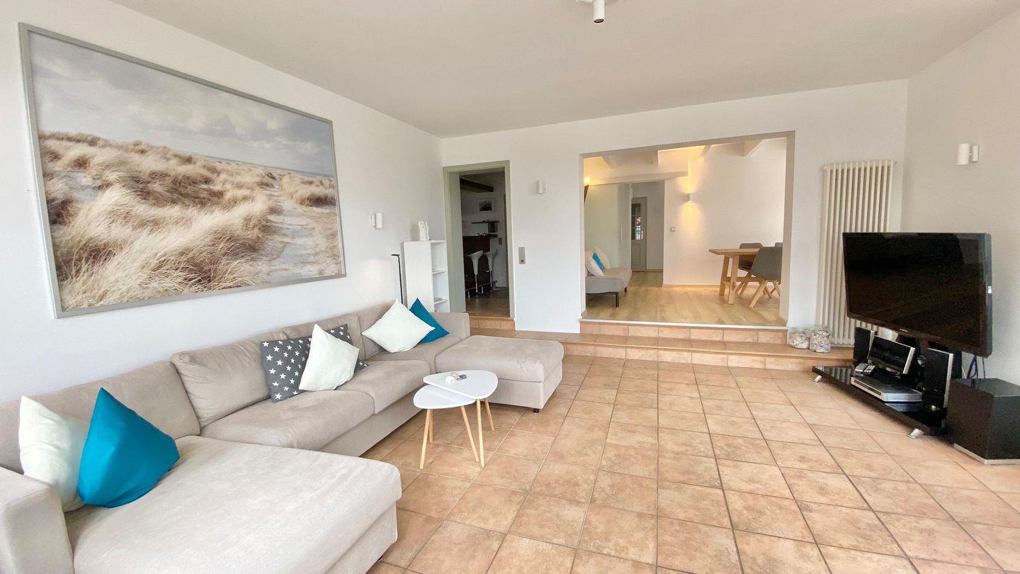 Das lichtdurchflutete Wohnzimmer mit TV-Ecke