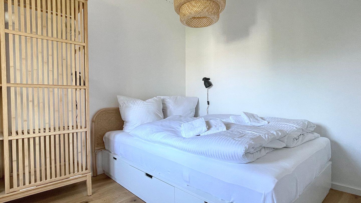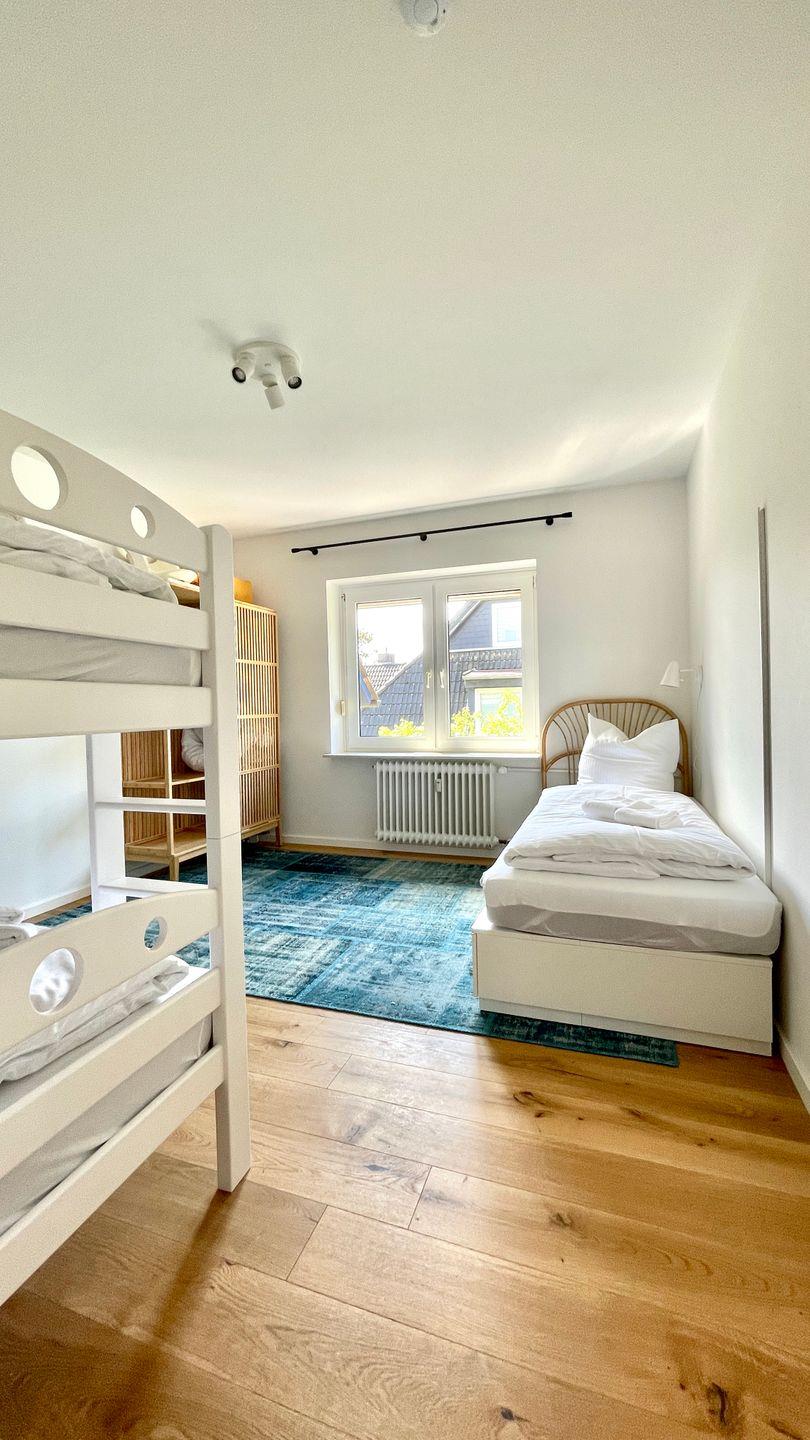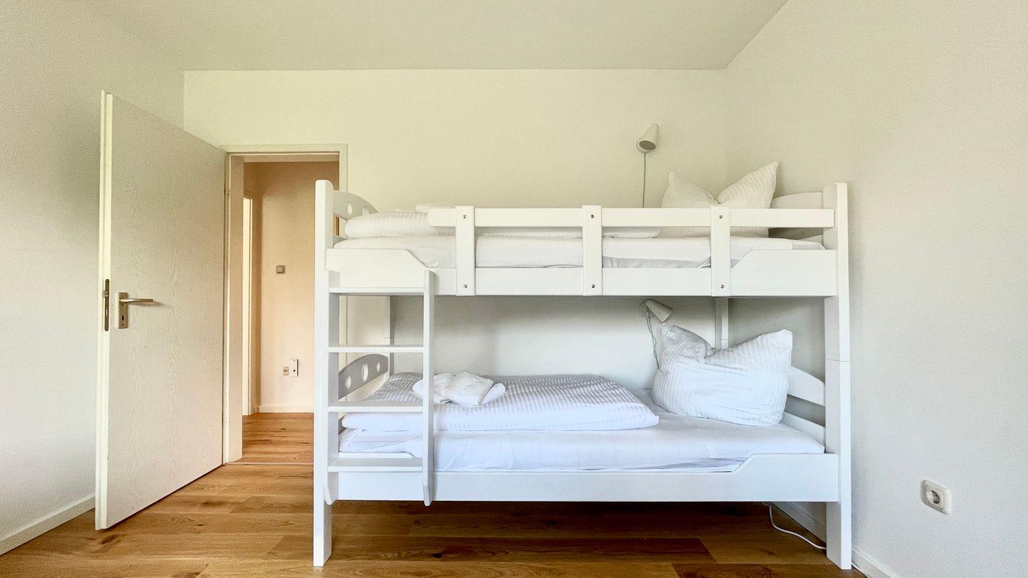 Das Elternschlafzimmer hat ein Doppelbett ( 140x200 ) - das Kinderzimmer ein Etagenbett und ein Einzelbett ( alle Betten 90x200 ).