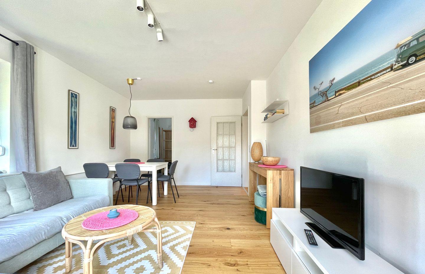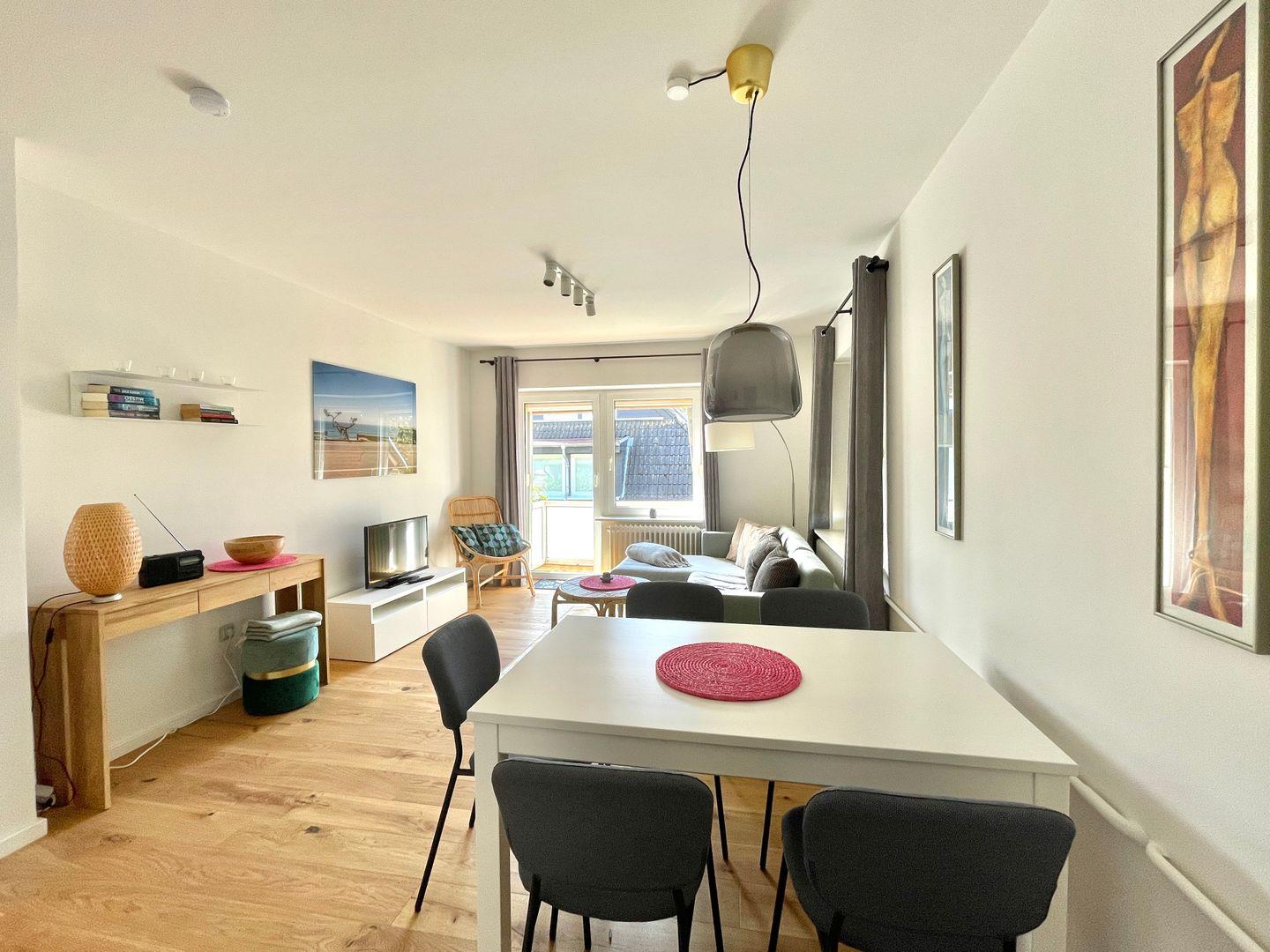 Der Wohn- Essbereich bietet eine Essecke und einen Couchbereich mit TV zum Relaxen - angrenzend schließt sich der Balkon an mit Blick ins Grüne an.