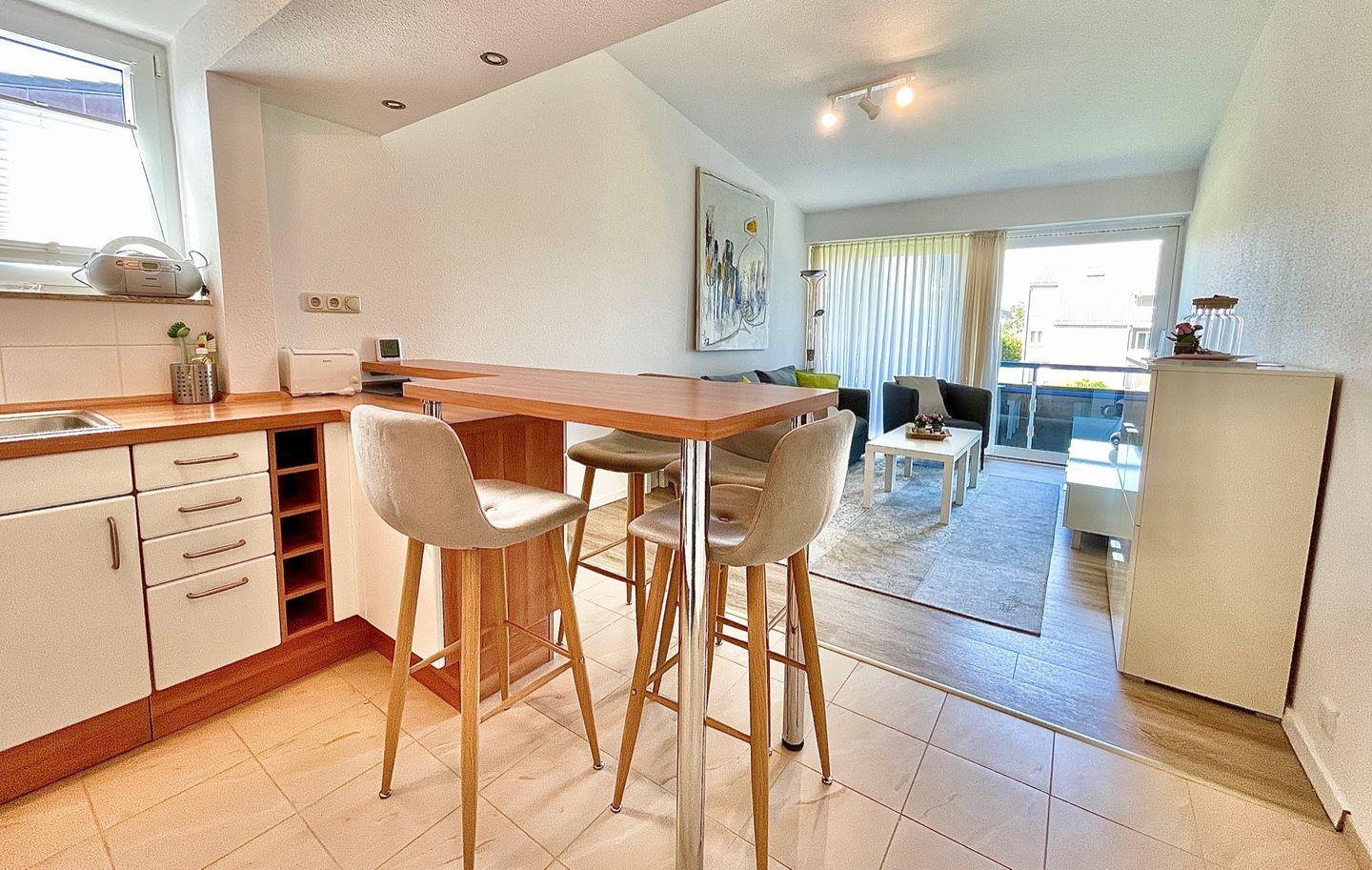 Die Ferienwohnung liegt in der 1.Etage und wird rund um den Tag mit warmen Sonnenstrahlen durchflutet. Die teilweise 3 Meter hohe Decke, die durch den offen Giebel geschaffen wurde, bietet ein besonderes Wohngefühl. Sie gelangen durch den hellen, freundlichen Flurbereich in das Schlafzimmer mit Doppelbett ( 180x200 ), das Tageslichtbad sowie geradeaus in den lichtdurchfluteten Wohnbereich. In diesem befindet sich auch die offene, voll ausgestattete Küche mit angrenzendem Esstresen für gemütliche Stunden . Die Couchecke, mit Schlaffunktion ( 160x200 ), und seiner TV-Ecke lädt zu Verweilen ein. Des Weiteren haben Sie Blick auf den Süd-Westbalkon mit davorliegender Freifläche und von dort aus auf das Inseltreiben.