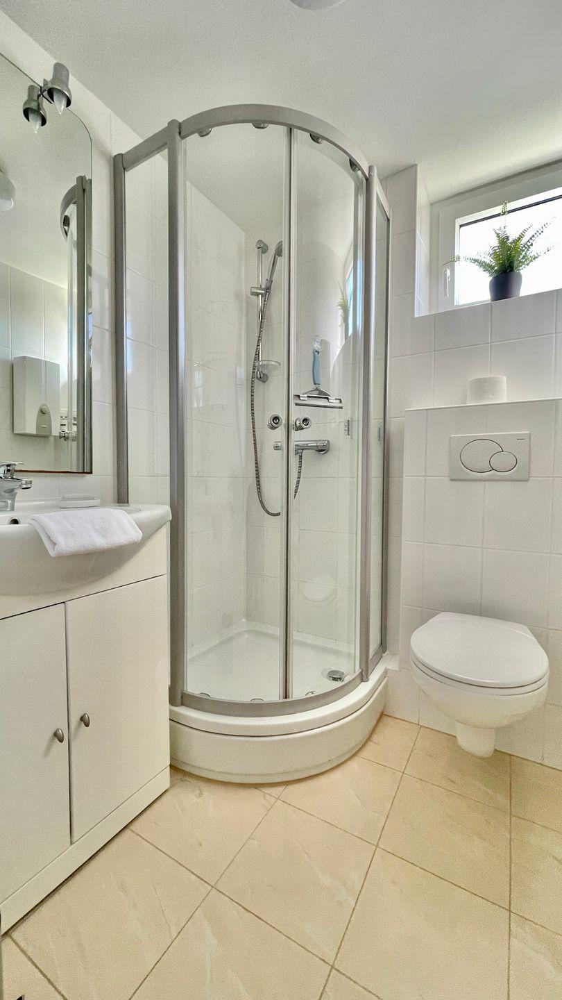 Das Bad bietet eine Dusche mit Waschtisch und WC.