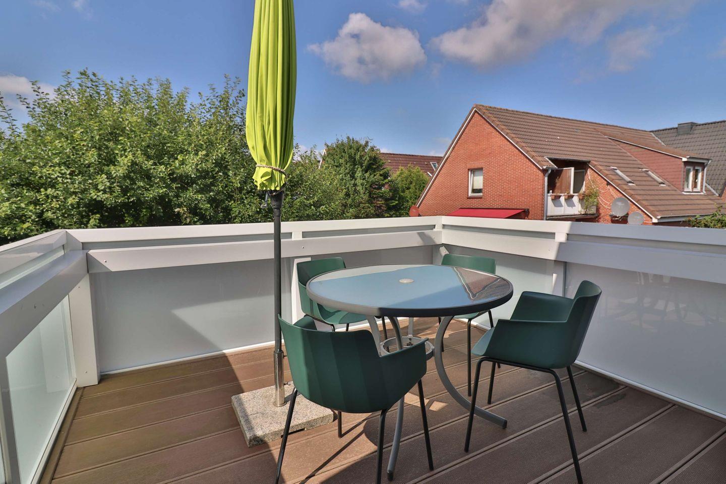 Der westlich ausgerichtete Balkon ist mit Gartenmöbeln und Sonnenschirm ausgestattet und lädt zum Verweilen oder Frühstücken an der frischen Nordseeluft ein. Hier können Sie entspannen und das milde Inselklima genießen.