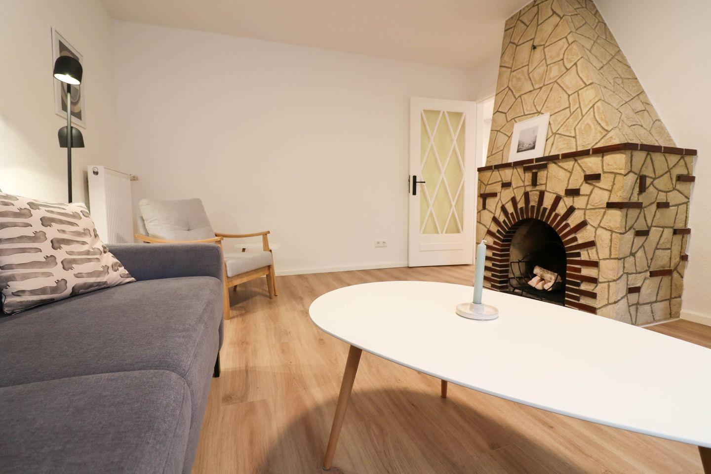 Der Wohnbereich ist modern und freundlich eingerichtet. Ein gemütliches Sofa mit Hocker und ein Sessel laden zum Entspannen ein. Das Wohnzimmer verfügt über einen Flachbildfernseher, ein Radio und eine kleine Auswahl an Büchern, sodass für Unterhaltung gesorgt ist. Ein Kamin, der nicht mehr funktionsfähig ist, trägt dennoch zur Gemütlichkeit des Raumes bei.