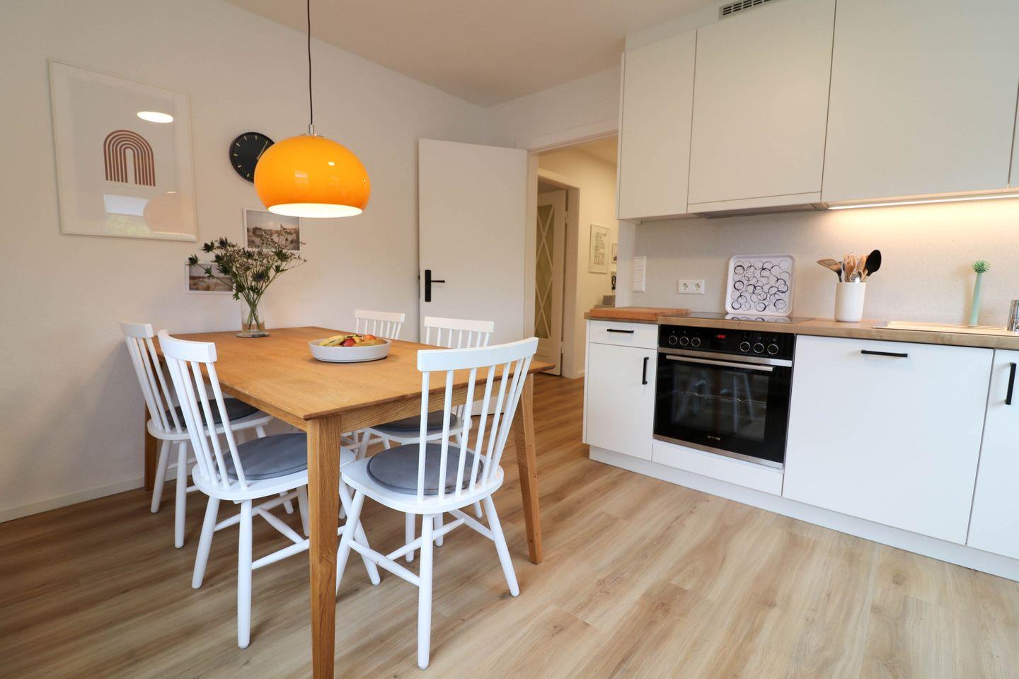 Ein Esstisch befindet sich in der modernen, separaten Küche, die vollständig ausgestattet ist. Hier stehen ein 4-Platten-Herd, Backofen, Kühlschrank mit integriertem Gefrierfach, Spülmaschine, Kaffeemaschine, Wasserkocher, Toaster sowie umfangreiche Küchenutensilien zur Verfügung. Geschirr, Besteck und Geschirrhandtücher sind vorhanden, sodass Sie alle Voraussetzungen für die Zubereitung und den Genuss gemeinsamer Mahlzeiten vorfinden.