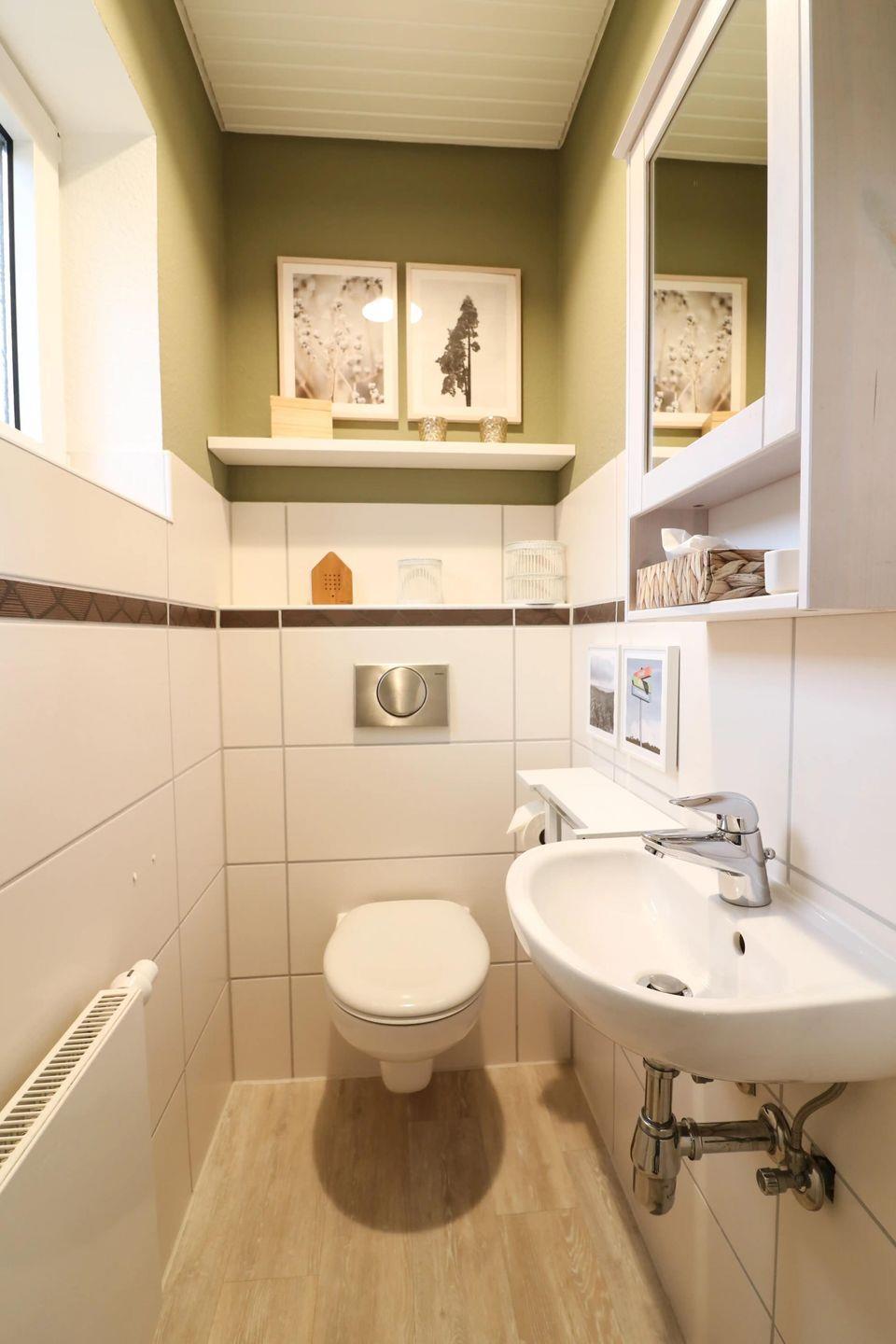 Das Badezimmer ist mit einer Dusche, einem Waschbecken, einem WC und einem Haartrockner ausgestattet. Ein weiteres WC befindet sich in einem separaten kleinen Badezimmer.