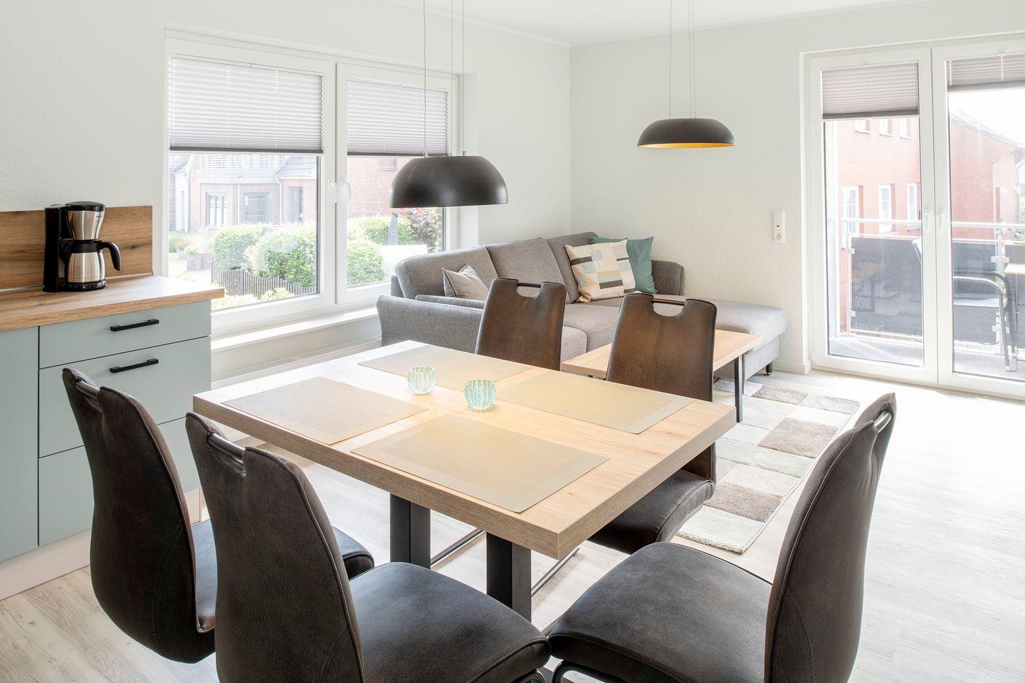 Über den Ess- und Wohnbereich erreichen Sie den im Westen gelegenen Balkon mit Sitzgelegenheiten und Blick auf die Inselkirche.