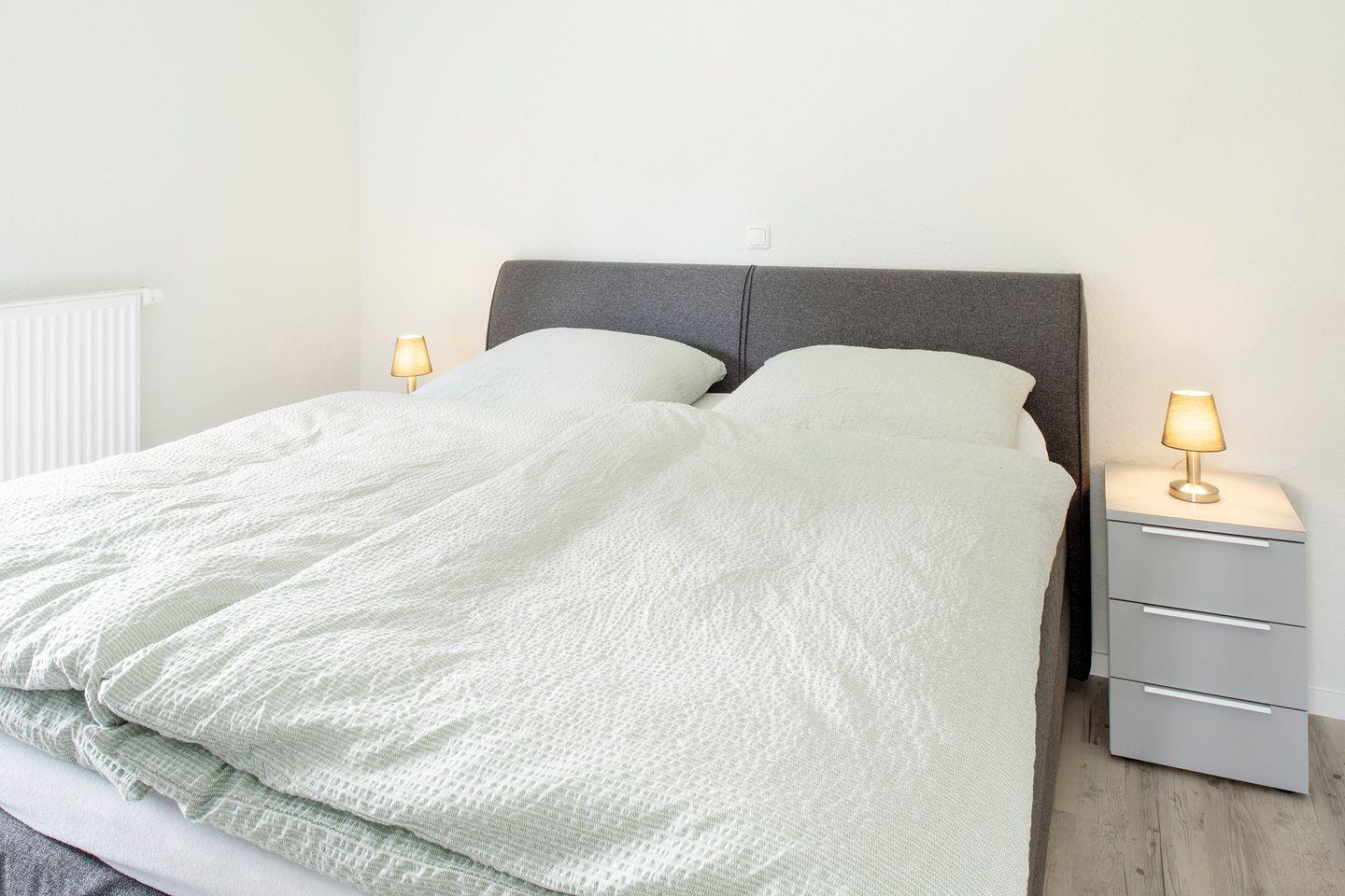 Die Wohnung verfügt über zwei separate Schlafzimmer - eines mit einem Doppel-Boxspringbett (180×200) und einem weiteren Smart-TV ausgestattet. Das zweite Schlafzimmer verfügt über zwei freistehende Betten. In beiden Räumen sind Verdunkelungsrollos oder -gardinen.