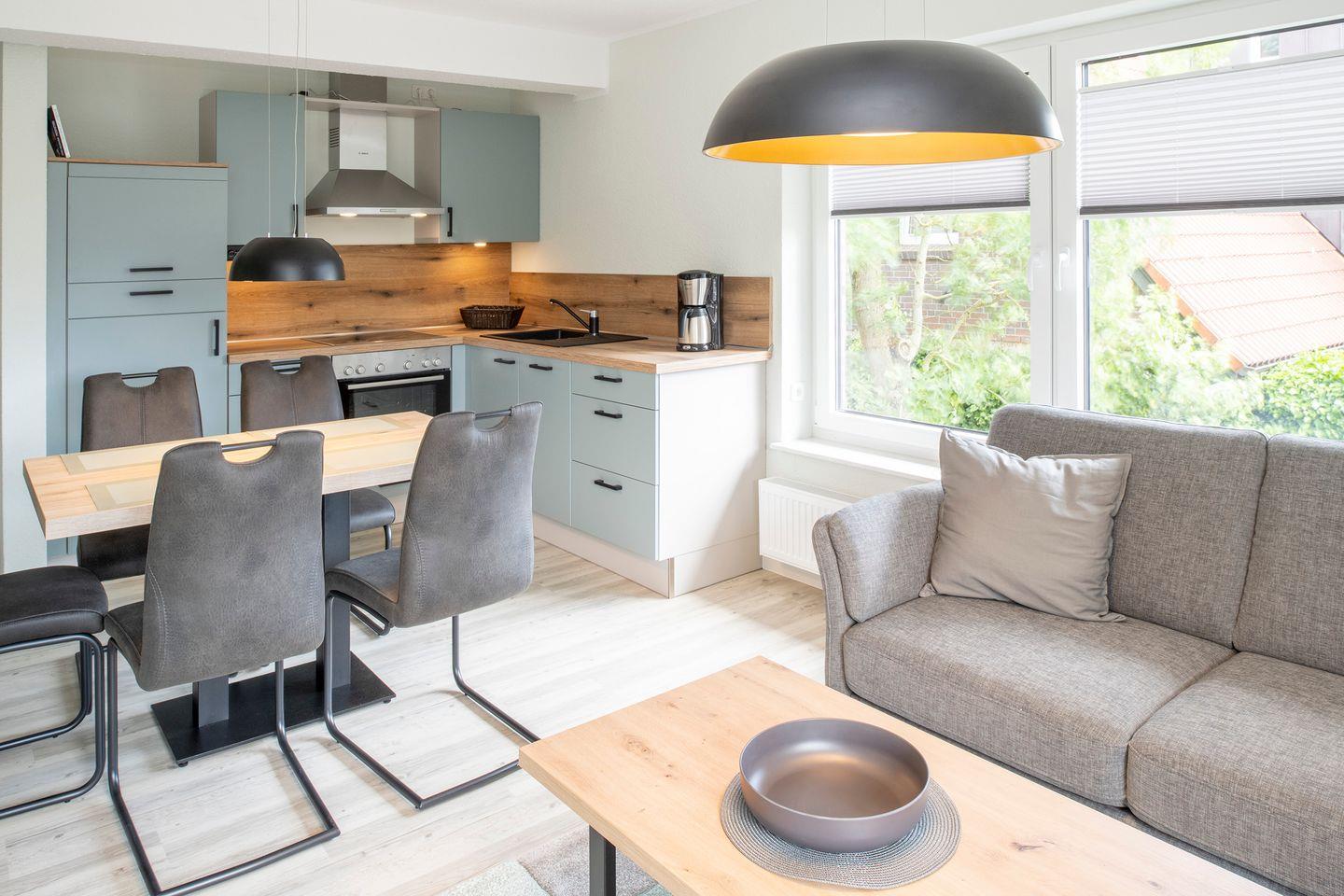 Die Ferienwohnung „Dünengras“ befindet sich im ersten Obergeschoss. Sie ist optimal für bis zu 4??Personen geeignet. Auf Anfrage und mit € 10/ Nacht Aufpreis kann eine 5. Person auf dem Sofa mit Bettfunktion im Ess-und Wohnbereich übernachten. Die Wohnung ist ca. 54 qm groß und verfügt über einen Wohn- und Essbereich mit komplett ausgestatteter Küchenzeile (Kühlschrank, Mikrowelle, Spülmaschine, Backofen, Ceranfeld, Kaffeemaschine, Wasserkocher, Toaster, Mixer). Selbstverständlich gibt es in diesem Bereich auch einen Smart-TV.