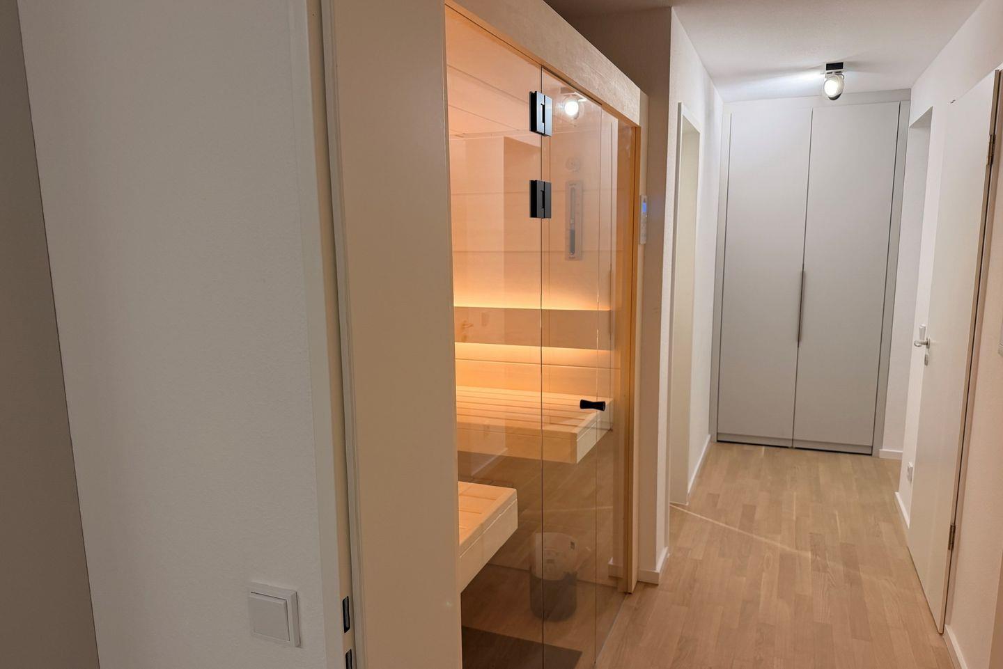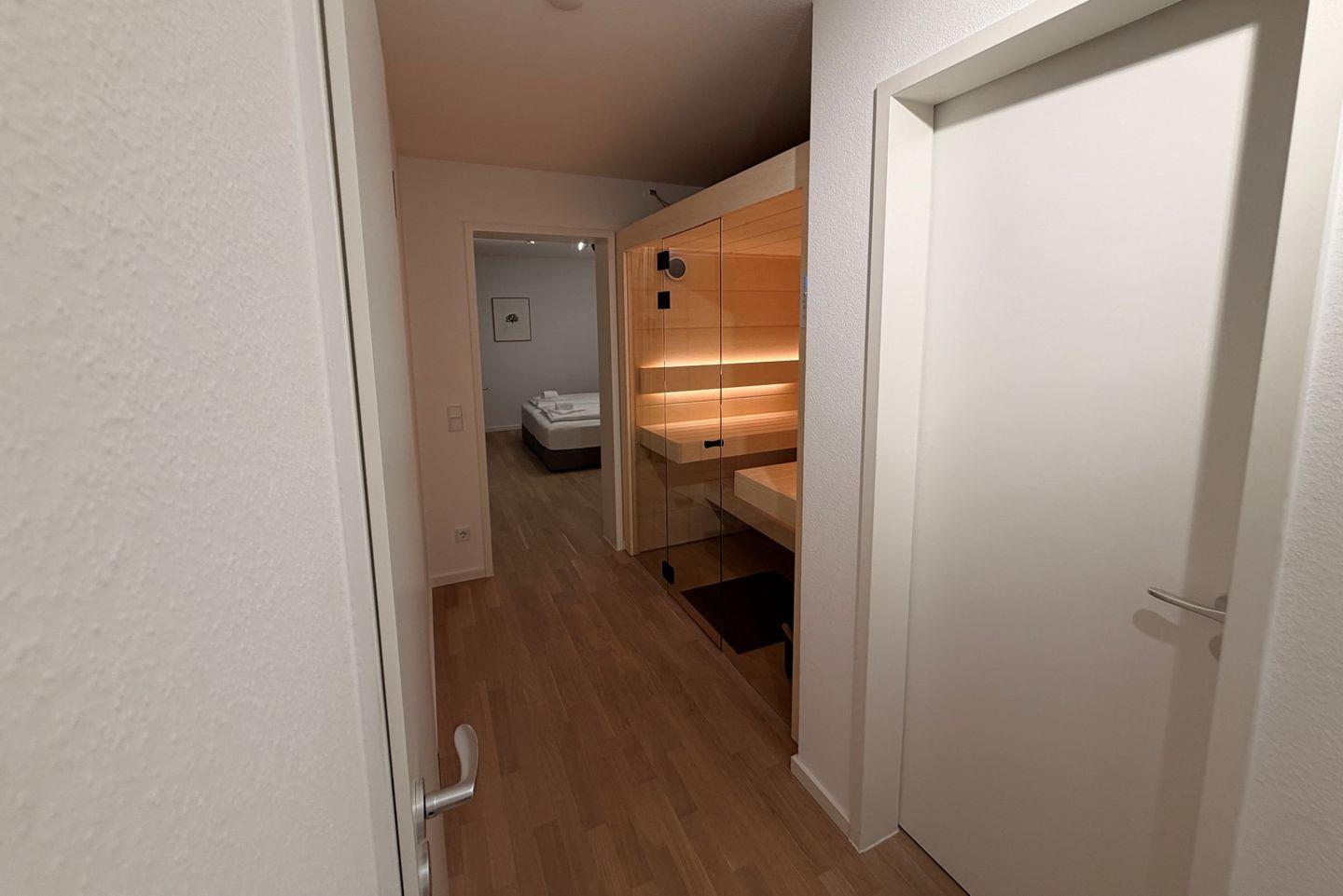 Das geschmackvoll eingerichtete Nichtraucher-Apartment verfügt über kostenfreies WLAN, bodentiefe Fenster und eine voll ausgestattete offene Küche mit Geschirrspüler, Kühlschrank mit Gefrierfach, Filterkaffeemaschine, Toaster, Wasserkocher, Backofen und 4-Felder Induktionsherd sowie über einen behaglichen Wohn-Essbereich. Im Wohnbereich befinden sich ein SMART-TV (43 Zoll) und ein Bluetooth-Lautsprecher. Beide separaten Schlafzimmer beinhalten ein modernes Boxspringbett (1,80 x 2,00 m und 1,40 x 2,00 m). Das Badezimmer verfügt über Handtuchwärmer, Regendusche, WC, Waschtisch, Föhn und Kosmetikspiegel. Die behagliche Wohnung bietet euch eine Terrasse mit Gartenmöbeln, Sonnenschirm und Liegestuhl - hier könnt ihr wunderbar entspannen. Ein weiteres Highlight ist die hochwertige und moderne Sauna im Apartment!