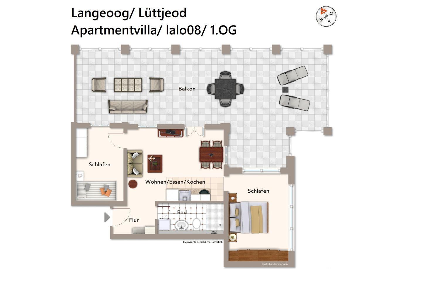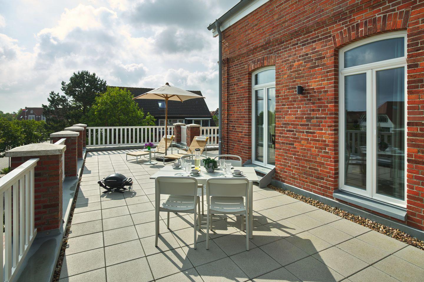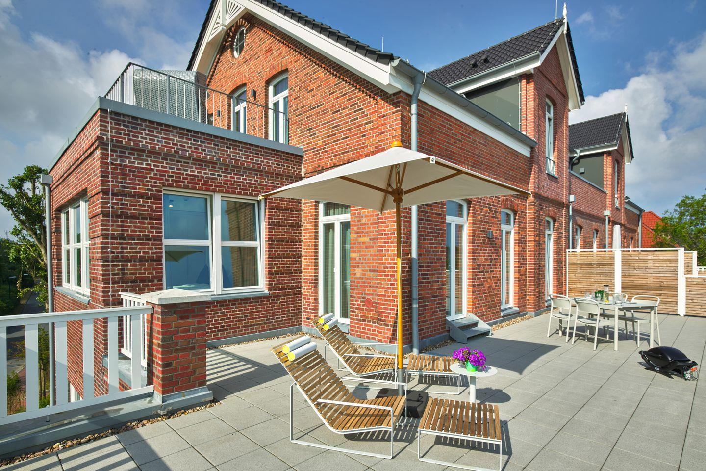 Stilvolles Apartment mit großer Balkonterrasse auf der Nordseeinsel Langeoog für erholsamen Urlaub.