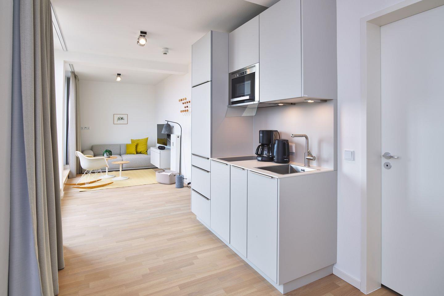 Das geschmackvoll eingerichtete Nichtraucher-Apartment verfügt über kostenfreies WLAN, bodentiefe Fenster und eine voll ausgestattete offene Küche mit Geschirrspüler, Mikrowelle mit Backofenfunktion, Kühlschrank mit Gefrierfach, Filterkaffeemaschine, Toaster, Wasserkocher und 2-Felder Induktionsherd sowie über einen behaglichen Wohn-Essbereich. Im Wohnbereich befinden sich ein SMART-TV (43 Zoll) und ein Bluetooth-Lautsprecher.