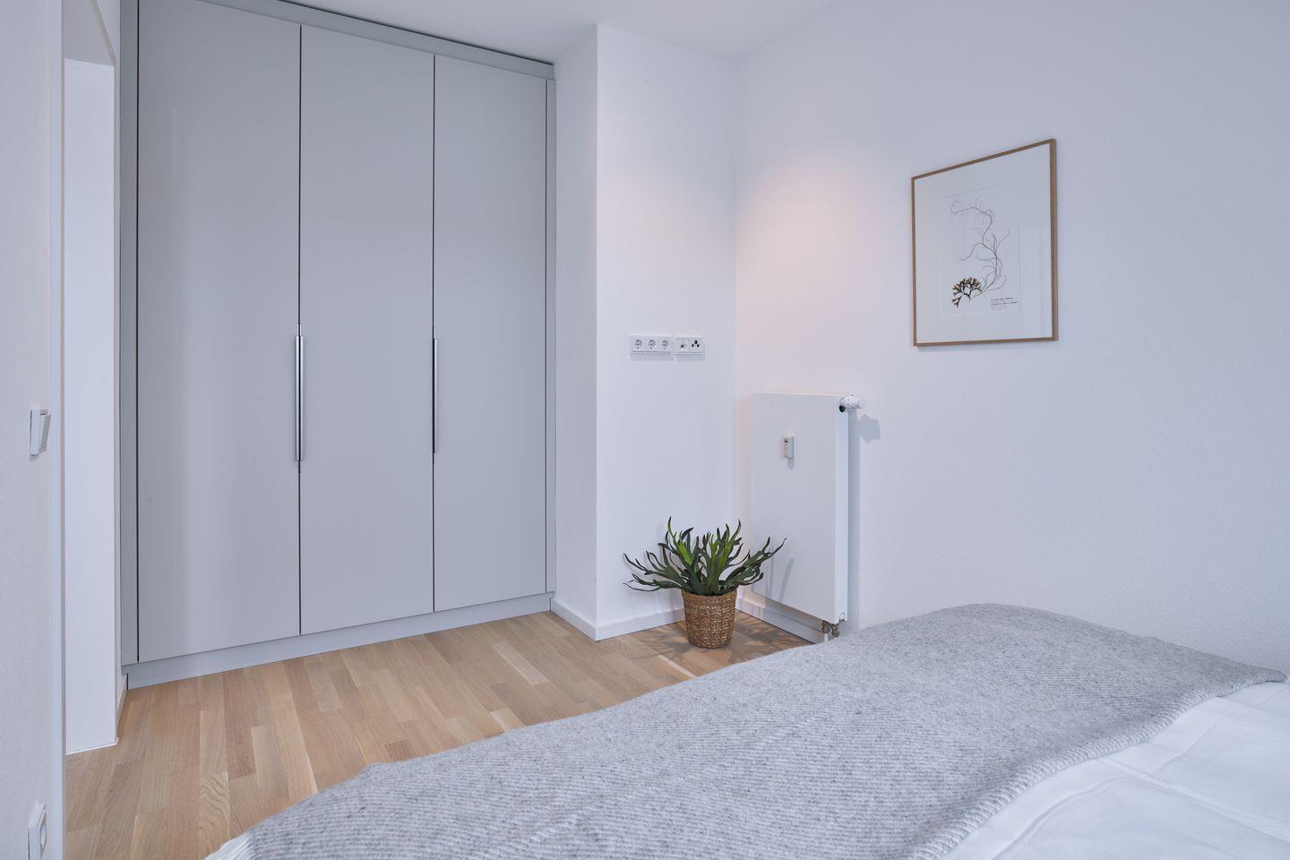 Das Schlafzimmer beinhaltet ein modernes Boxspring-Doppelbett (1,80 x 2,00 m) und Kleiderschrank.