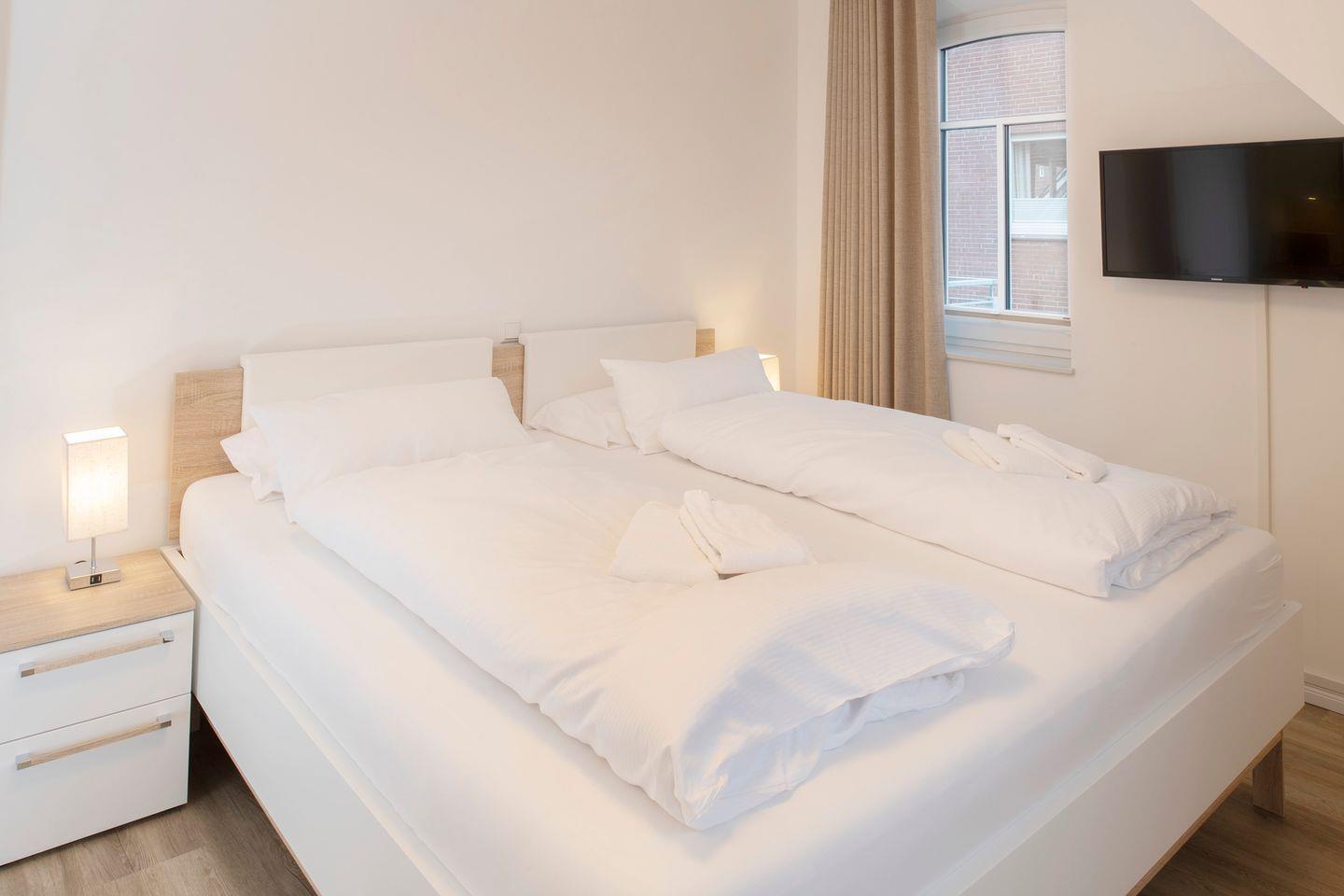 Des weiteren gibt es zwei Schlafzimmer mit Doppel-Boxspringbetten, diese sind mit einem TV ausgestattet.