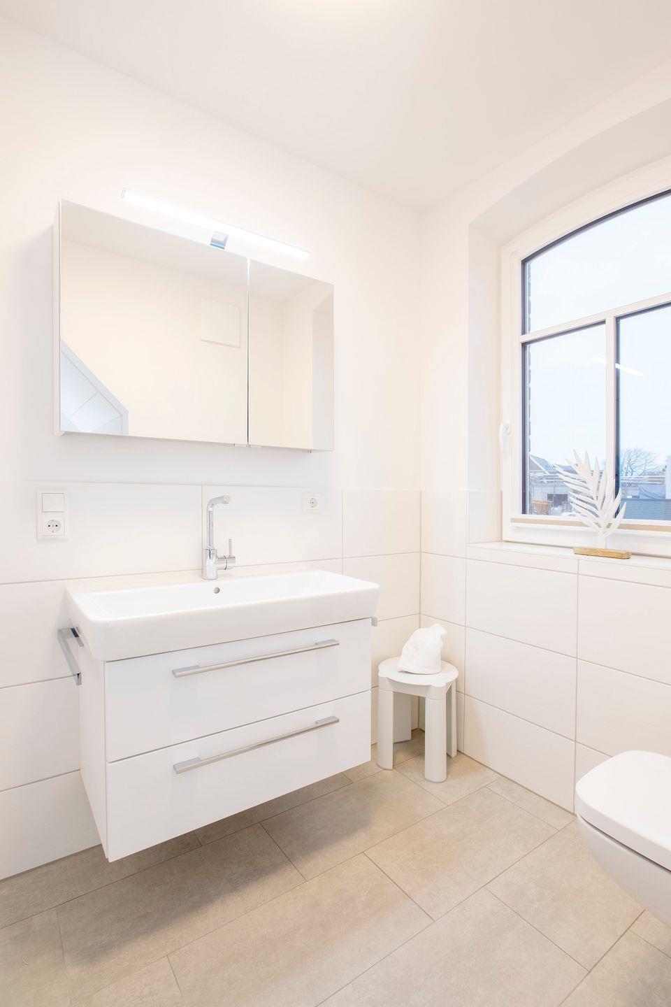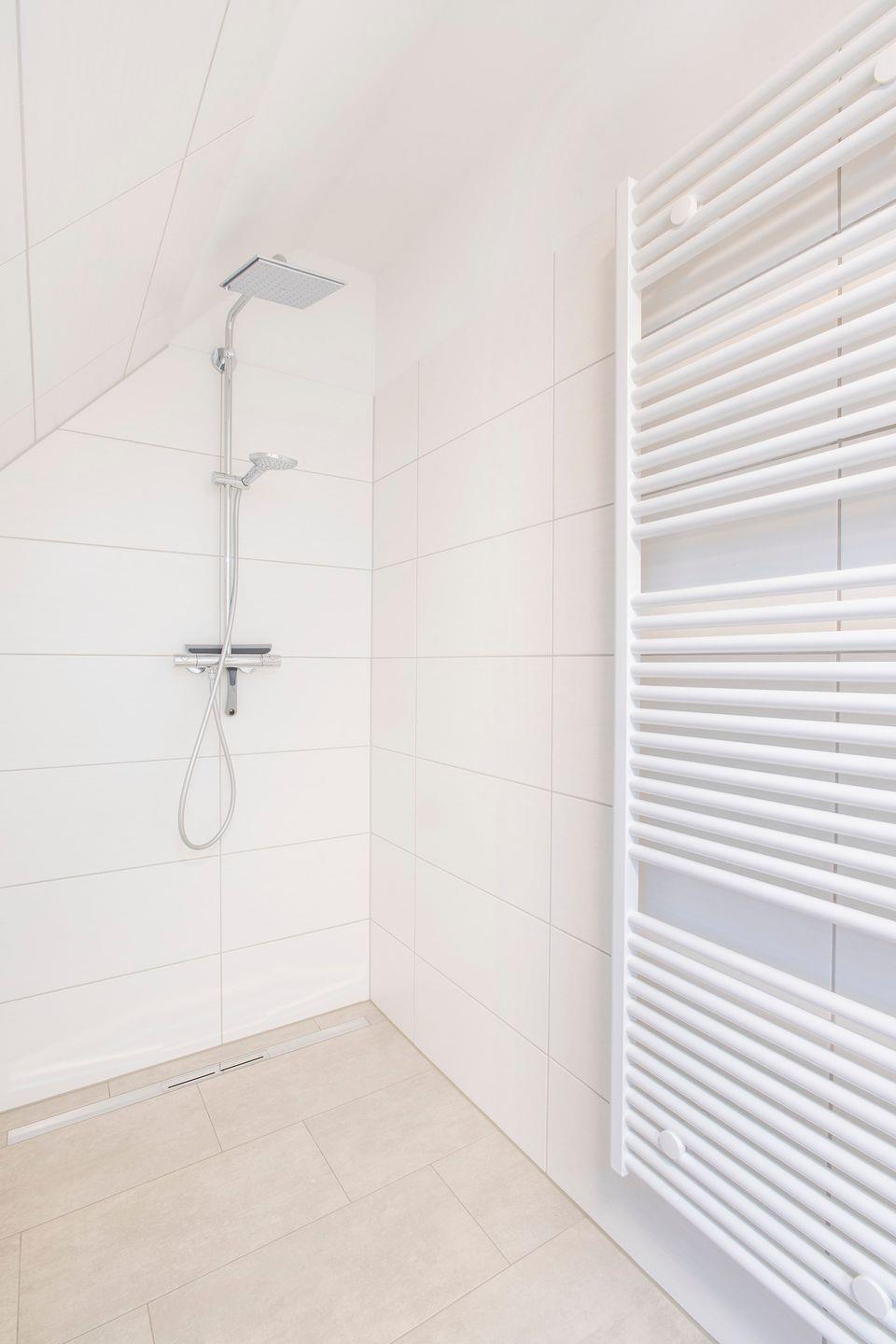 Das große helle Bad bietet eine bodengleiche Dusche, Waschtisch und WC. Im Abstellraum in der 2. Etage finden Sie Waschmaschine und Trockner.
