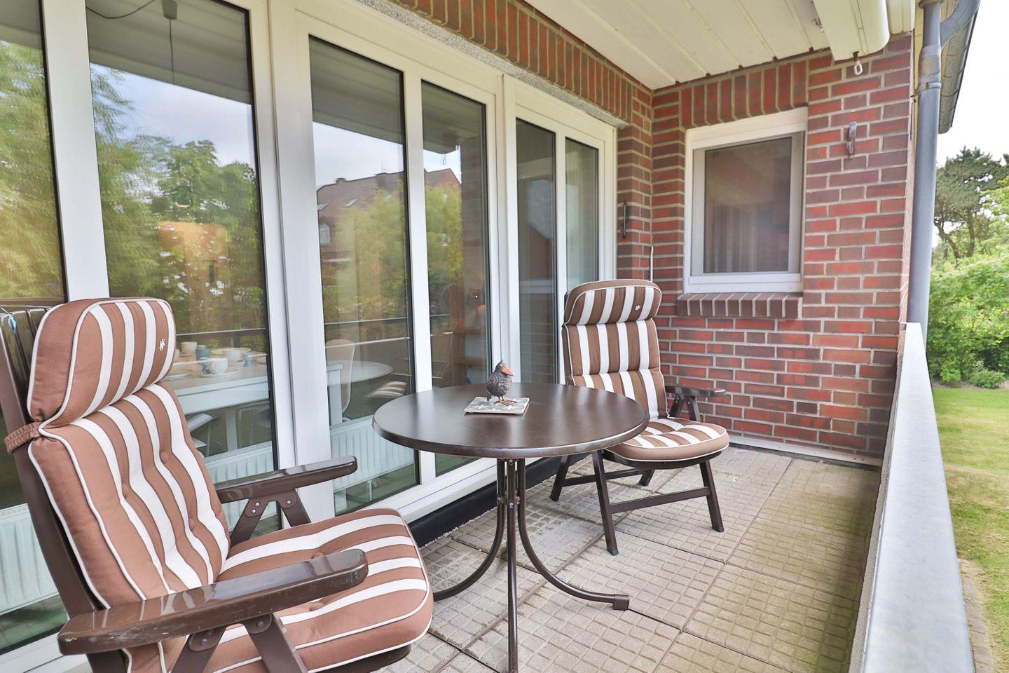 Gemütliche Ferienwohnung Inselzeit auf Langeoog mit Balkon und Blick ins Grüne, ideal für erholsame Tage in ruhiger Lage.