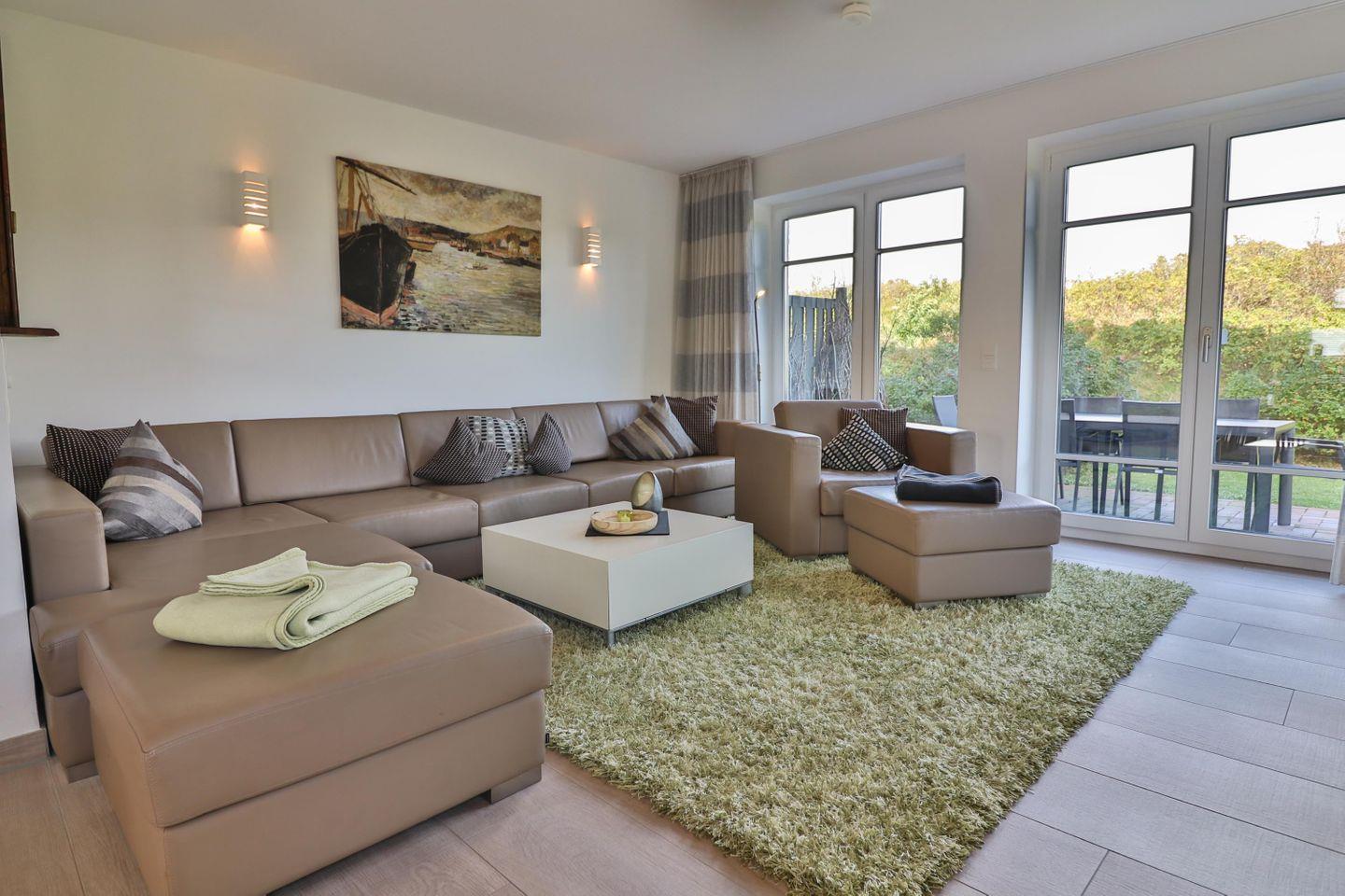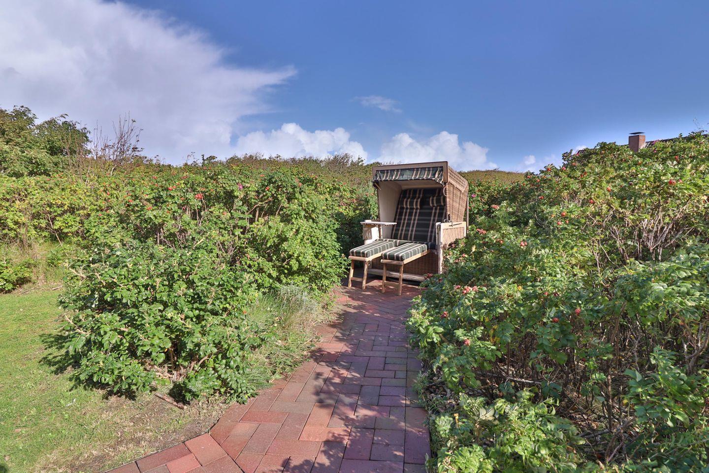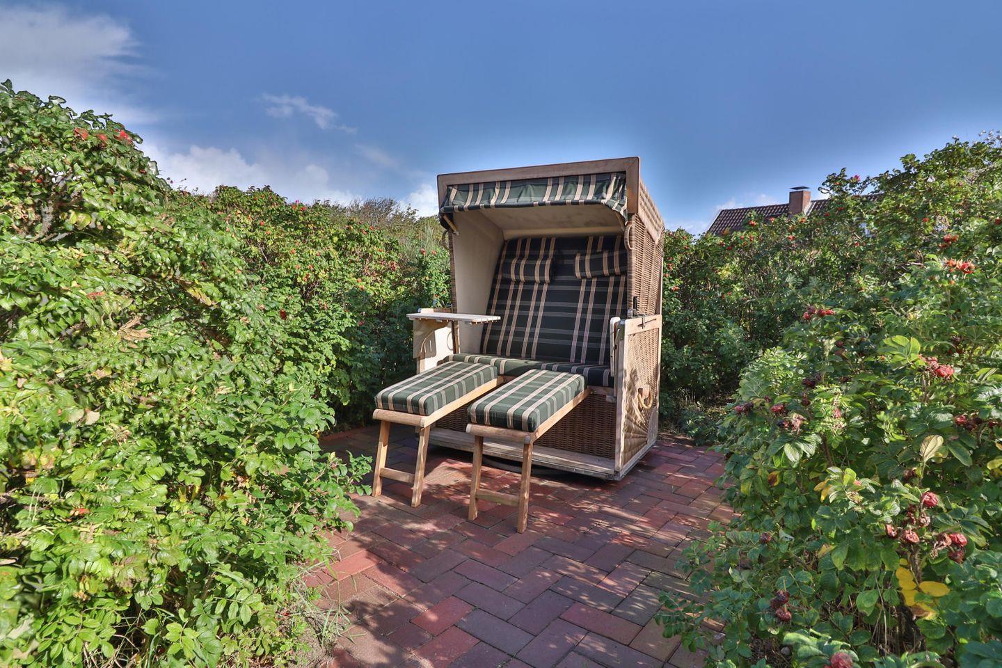 Genießen Sie unvergessliche Stunden auf der Terrasse, wo bereits ein gemütlicher Strandkorb auf Sie wartet. Hier können Sie inmitten der Dünen die Seele baumeln lassen und ruhige Abende bei Sonnenuntergang verbringen.