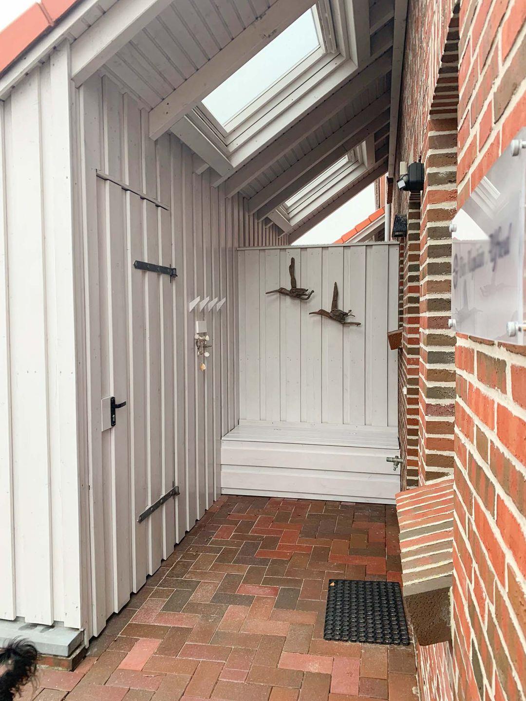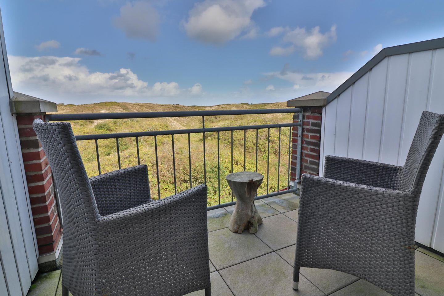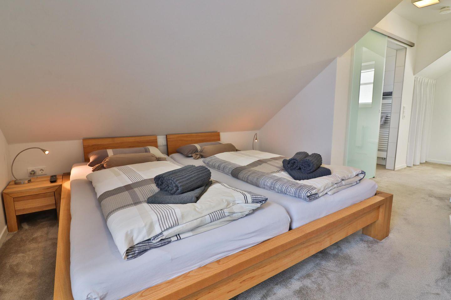 Eines der Highlights des Hauses ist zweifellos das Schlafzimmer im Dachgeschoss mit eigenem kleinen Bad mit Dusche. Dort erwartet Sie ein großes Doppelbett (200 x 200 cm) für ruhige Träume sowie ein eigener Balkon mit einem malerischen Ausblick in die umliegenden Dünen. Ein begehbarer Kleiderschrank bietet ausreichend Stauraum für Ihre Urlaubsgarderobe und sorgt für zusätzlichen Komfort. Eine Tür zum Treppenhaus sorgt für zusätzliche Privatsphäre.