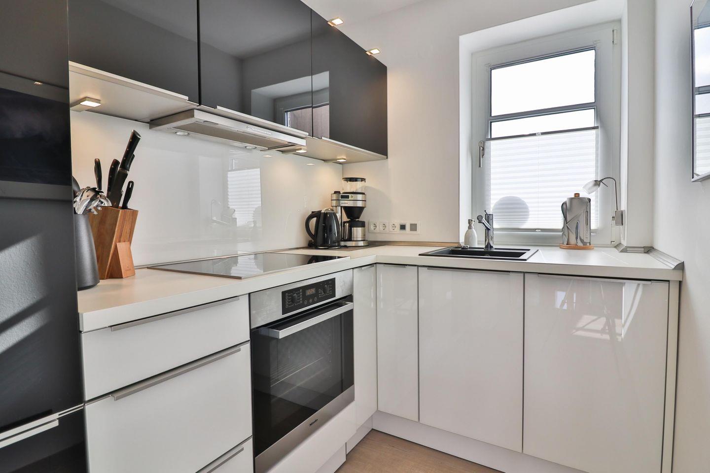 In der kleinen, zum Wohnzimmer offenen Küche, die keine Wünsche offen lässt, können Sie Ihrer kulinarischen Kreativität freien Lauf lassen. Ausgestattet mit einem Ceranfeld, Backofen, Spülmaschine, Kühl- und Gefrierschrank, Mikrowelle, Kaffeemaschine, Wasserkocher und einem Toaster wird das Zubereiten von Mahlzeiten zum Vergnügen.