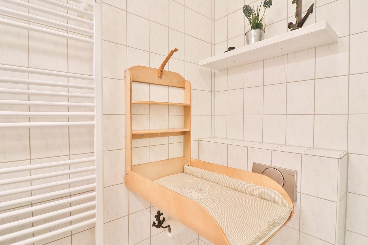 Das Badezimmer ist mit einer Dusche, einem WC und einem Waschbecken ausgestattet. Besonders praktisch ist der Wickeltisch zum Ausklappen, der speziell für Familien mit Kleinkindern gedacht ist.