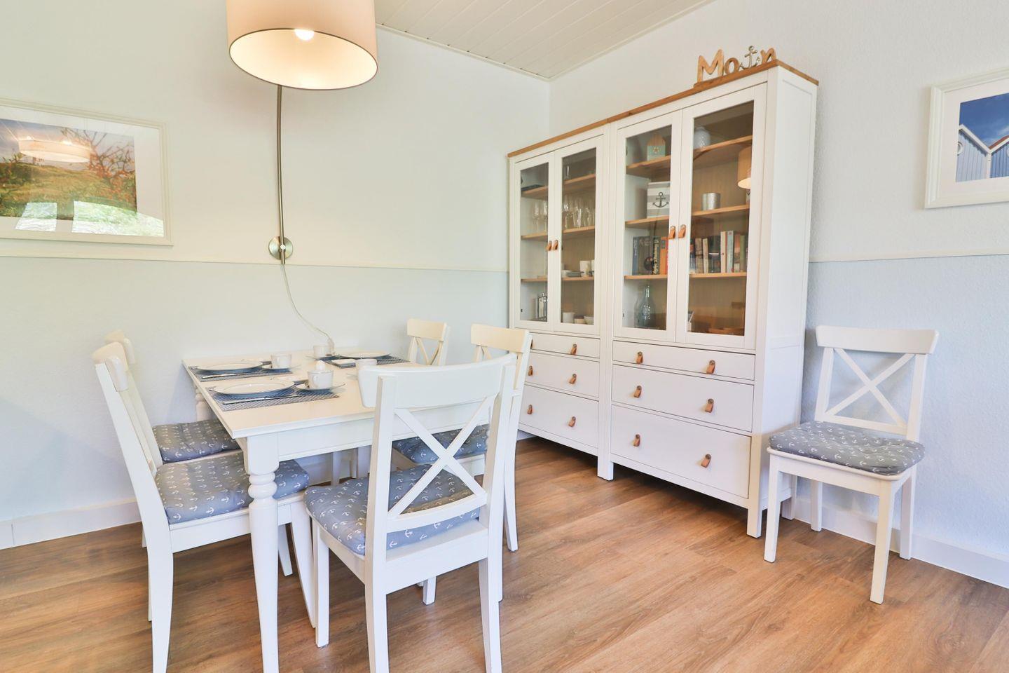 Das Wohn- und Esszimmer lädt mit einem gemütlichen (Schlaf-)Sofa (160 x 200 cm) und einem bequemen Schaukelstuhl zum Verweilen ein. Hier können Sie sich nach einem erlebnisreichen Tag entspannen und bei einem Fernsehabend oder in geselliger Runde den Tag Revue passieren lassen. Der Essbereich ist perfekt für gemeinsame Mahlzeiten und Abende geeignet.