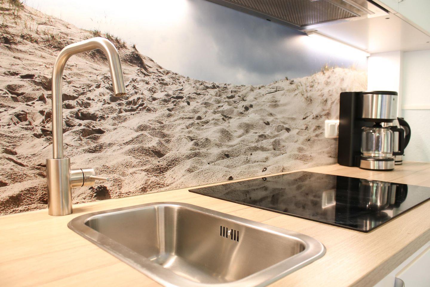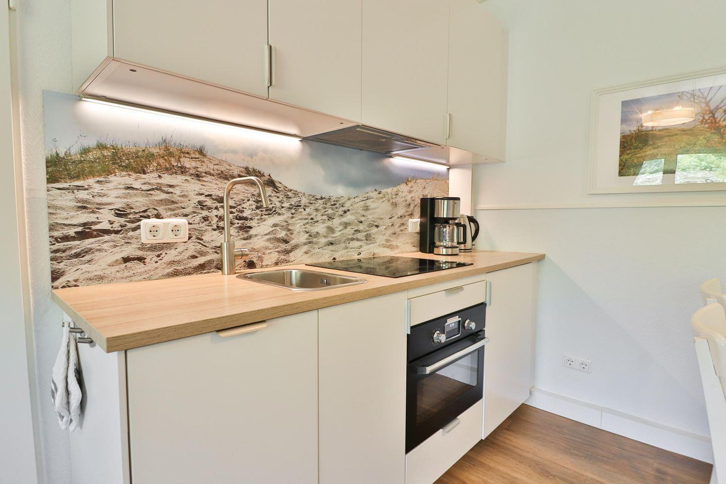 In der gut ausgestatteten Küchenzeile finden Sie alles, was Sie für die Zubereitung Ihrer Lieblingsspeisen benötigen: ein Ceranfeld, Backofen- und Mikrowellenkombigerät, Kühlschrank, Spülmaschine sowie eine Kaffeemaschine, Wasserkocher und ein Toaster stehen Ihnen zur Verfügung.