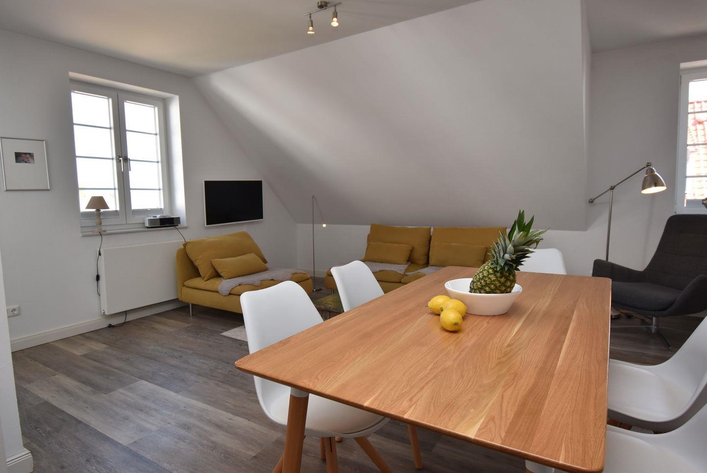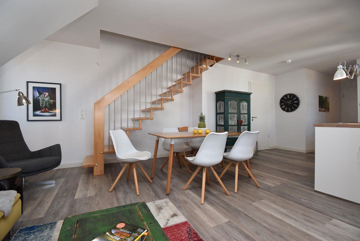 Die Wohnung verfügt mit ihren 70qm über einen großzügigen Wohnraum mit offener Küche und angrenzendem Essbereich sowie eine windgeschützte, überdachte Loggia mit Gartenmöbeln für laue Sommernächte. Die Couchecke lädt zu gemütlichen Fernsehabenden ein.