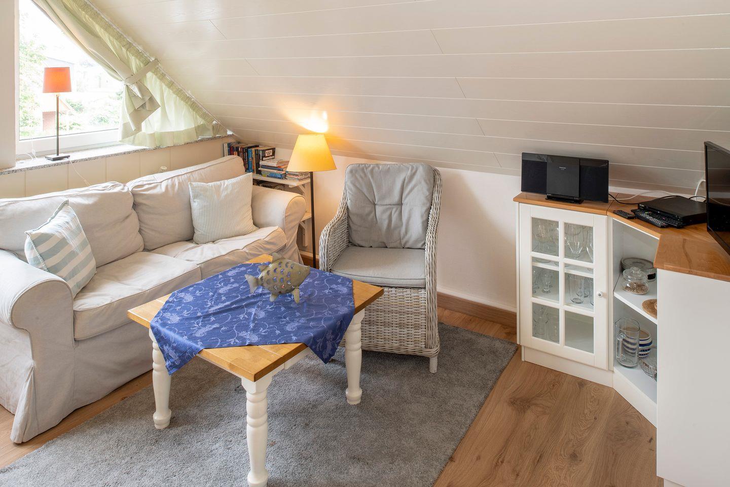 Die vollausgestattete Küche in der gemütlichen Dachgeschoßwohnung, ist getrennt vom Wohnbereich. Der Wohnbereich hat eine Couchecke mit TV und einen gemütlichen Essbereich mit Friesenbank mit einem tollen Blick ins Inseldorf. Die Ferienunterkunft hat leider keinen Balkon, dafür im wunderschönen Garten eine Terrasse mit Gartenmöbeln und Strandkorb.
