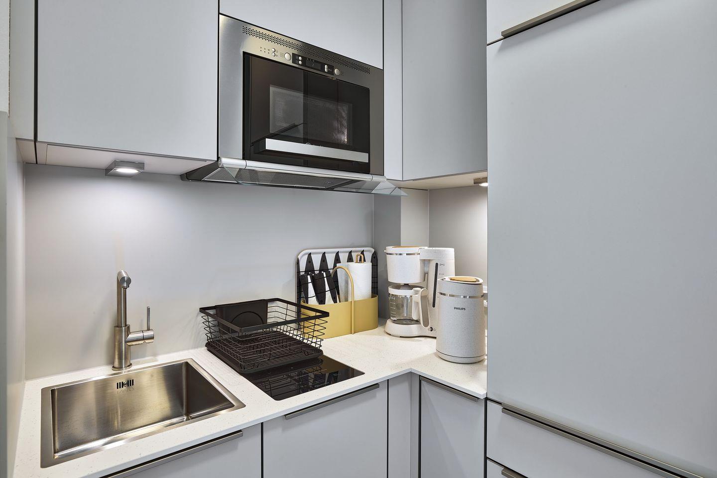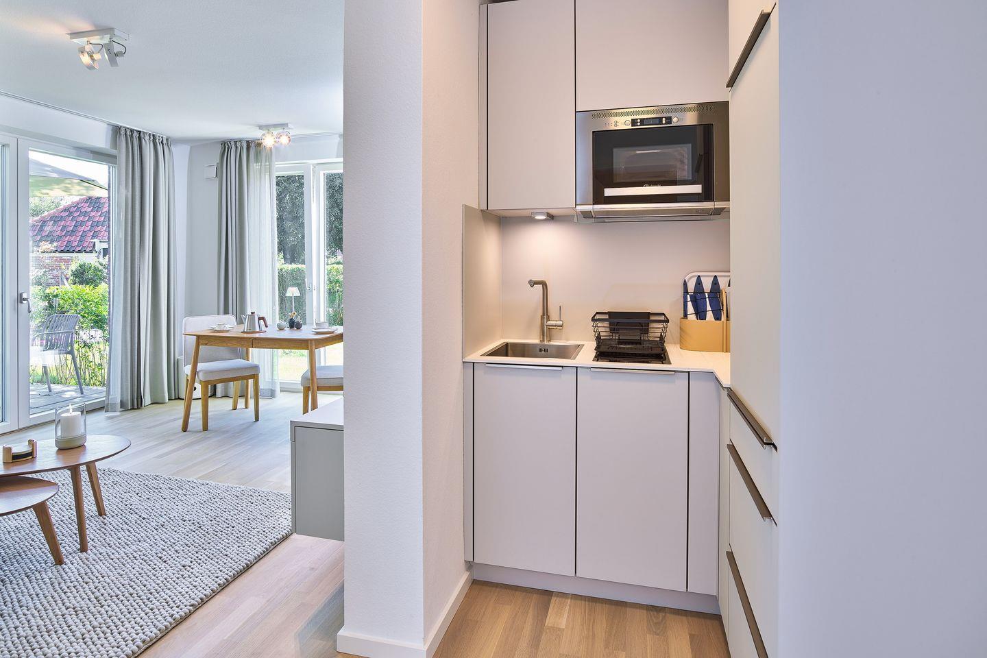 Das geschmackvoll eingerichtete Nichtraucher-Apartment verfügt über kostenfreies WLAN, bodentiefe Fenster und eine voll ausgestattete offene Küche mit einem Kühlschrank mit Gefrierfach, Filterkaffeemaschine, Toaster, Wasserkocher, Mikrowellen-Backofen Kombination und 2-Felder Induktionsherd sowie über einen behaglichen Wohn-Essbereich. Im Wohnbereich befinden sich ein SMART-TV (43 Zoll) und ein Bluetooth-Lautsprecher sowie eine Doppelschlafcouch (1,60 m x 2,00 m).