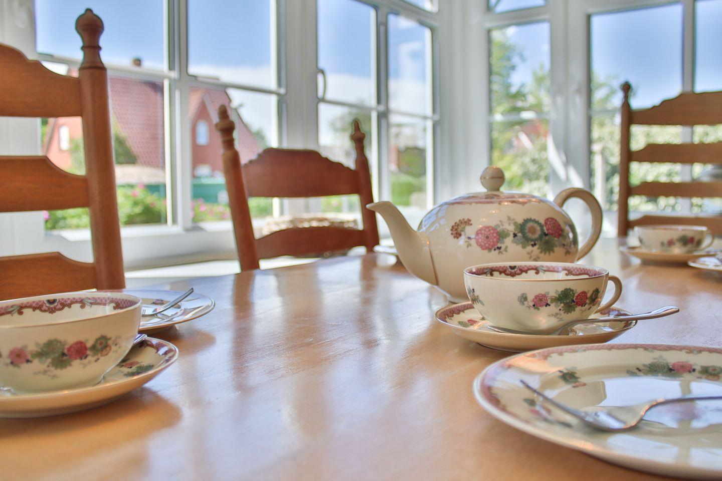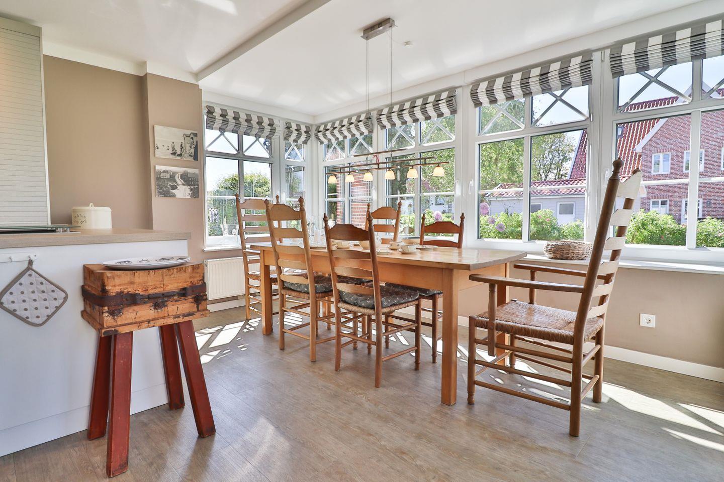 Der Essbereich befindet sich in dem lichtdurchfluteten Wintergarten, der sich hervorragend für gemeinsame Mahlzeiten eignet. Von hier aus gelangen Sie auch auf die sonnige Süd-West-Terrasse, wo ein Strandkorb, ein großer Tisch mit Stühlen und zwei komfortable Sonnenliegen den höchsten Komfort im Freien garantieren.