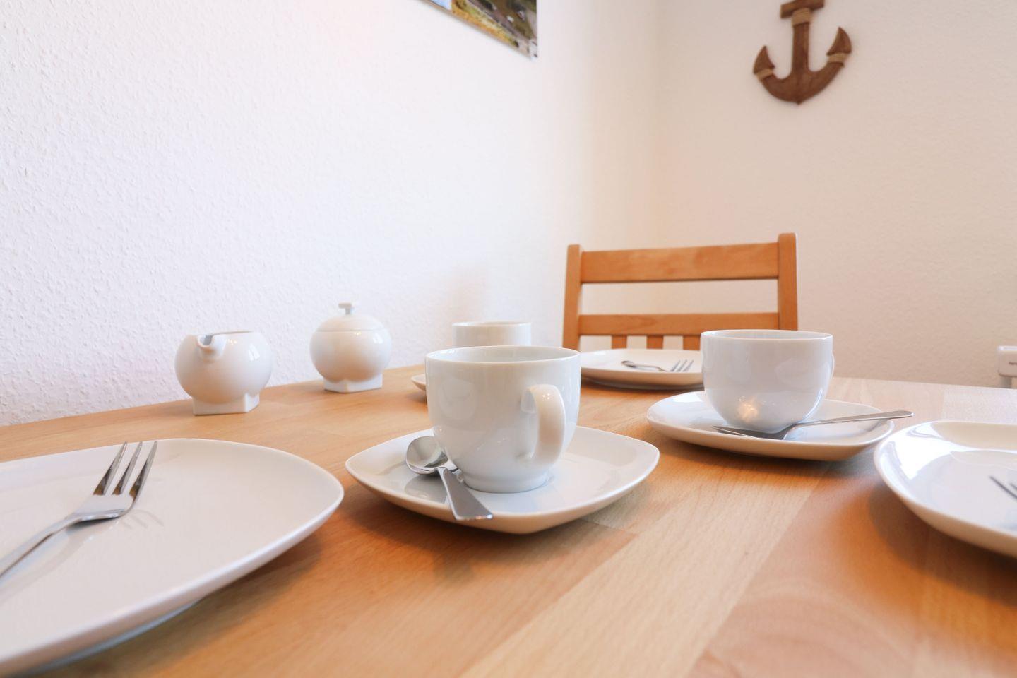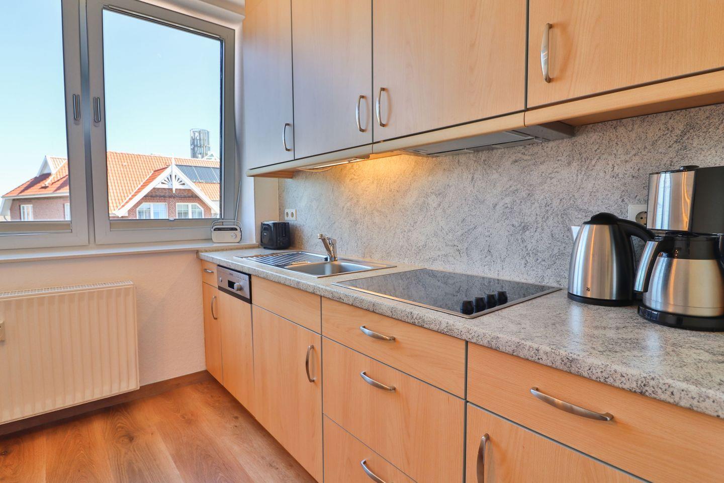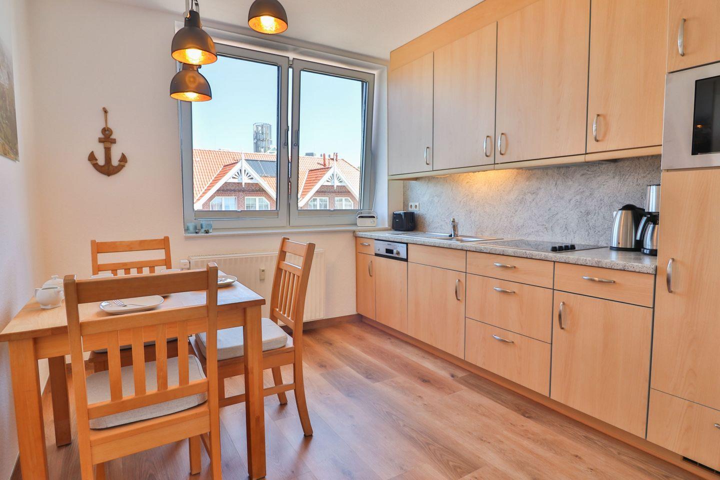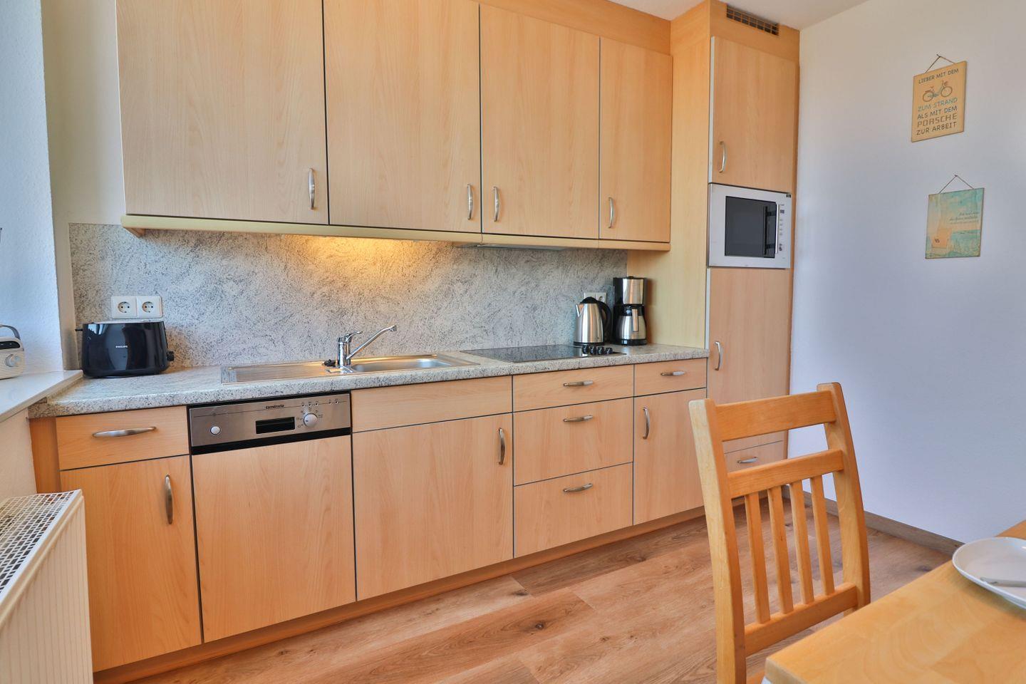 Die separate Küche ist komplett ausgestattet und lässt keine Wünsche offen. Ein Vier-Platten-Ceranfeld, ein Kühlschrank, eine Mikrowelle mit Grillfunktion, eine Spülmaschine, eine Kaffeemaschine, ein Wasserkocher und ein Toaster stehen Ihnen zur Verfügung. Der Essbereich in der Küche schafft eine gemütliche Atmosphäre für gemeinsame Mahlzeiten.